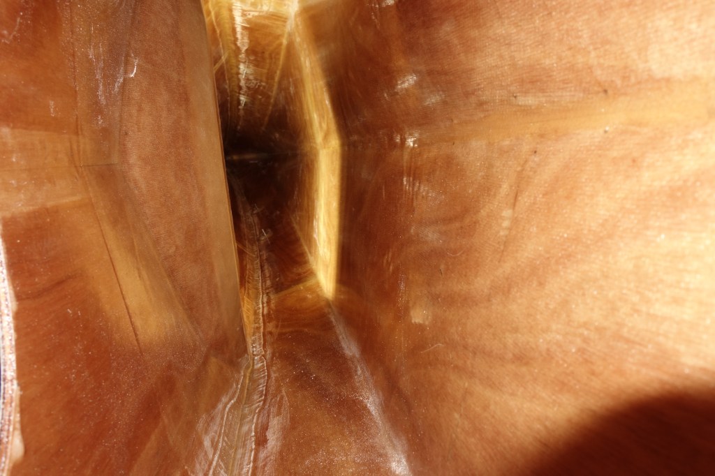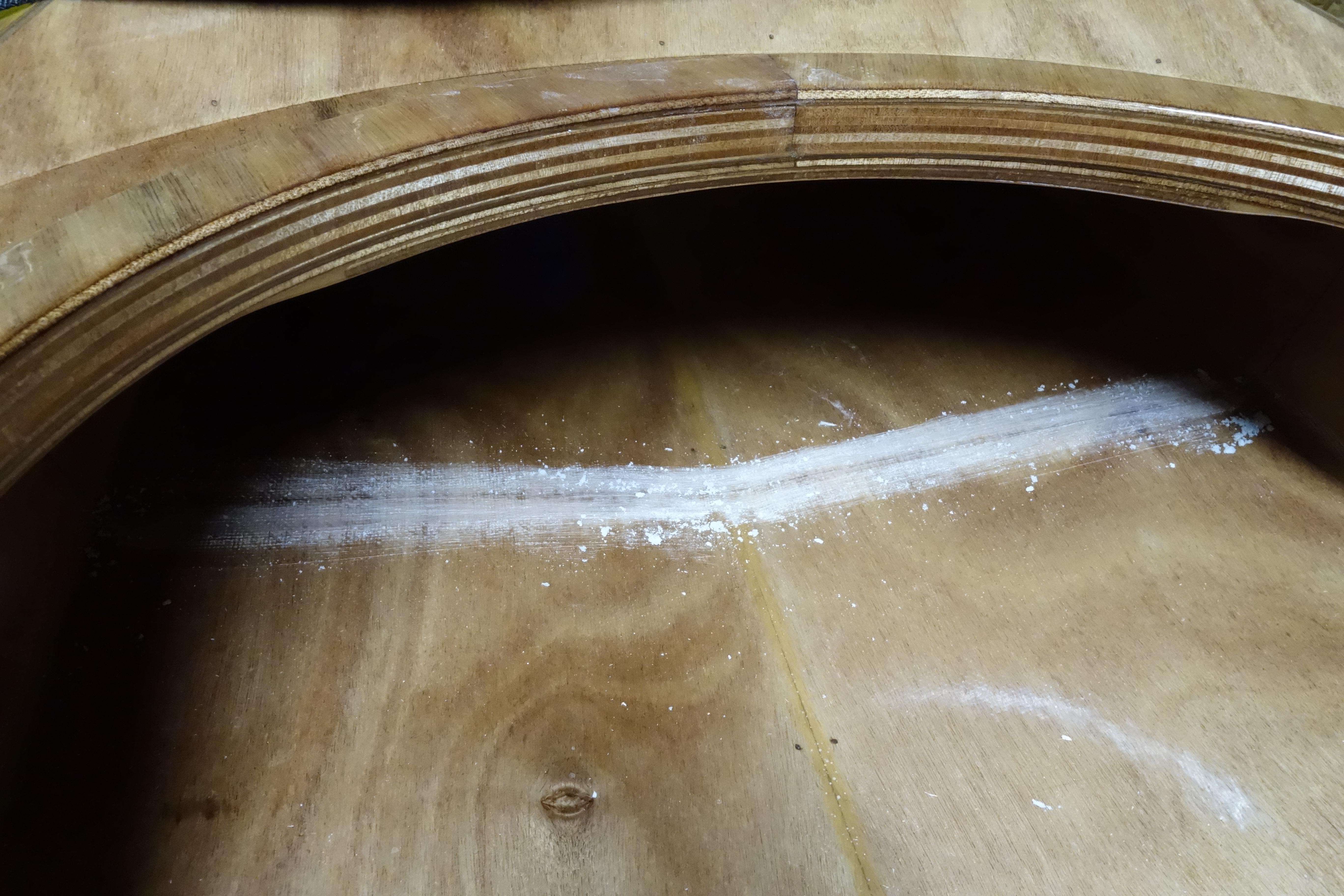 Through the curtain.The outside of the hull and deck will eventually both get sanded and at least one more fill coat of epoxy so that both are smooth and ready for varnish.Looking toward the bow. Shear seam sanded ready for a light finish coat of epoxy.Looking toward the bow again, this time from the aft hatch opening. Shear seam sanded, etc. Looking over the edge of the cockpit at the shear seam.This photo show pretty well how much I knocked the edges off the fiberglass tape.Looking aft. Tape/seam now has finish coat of epoxy. Looks great I think!Looking forward. Tape/seam now has finish coat of epoxy, and since the edges have been sanded off the tape I won’t have to worry about the tape potentially cutting into my knees, etc. It turned out much better than I thought it was going to, as this is the side I struggled with a bit.