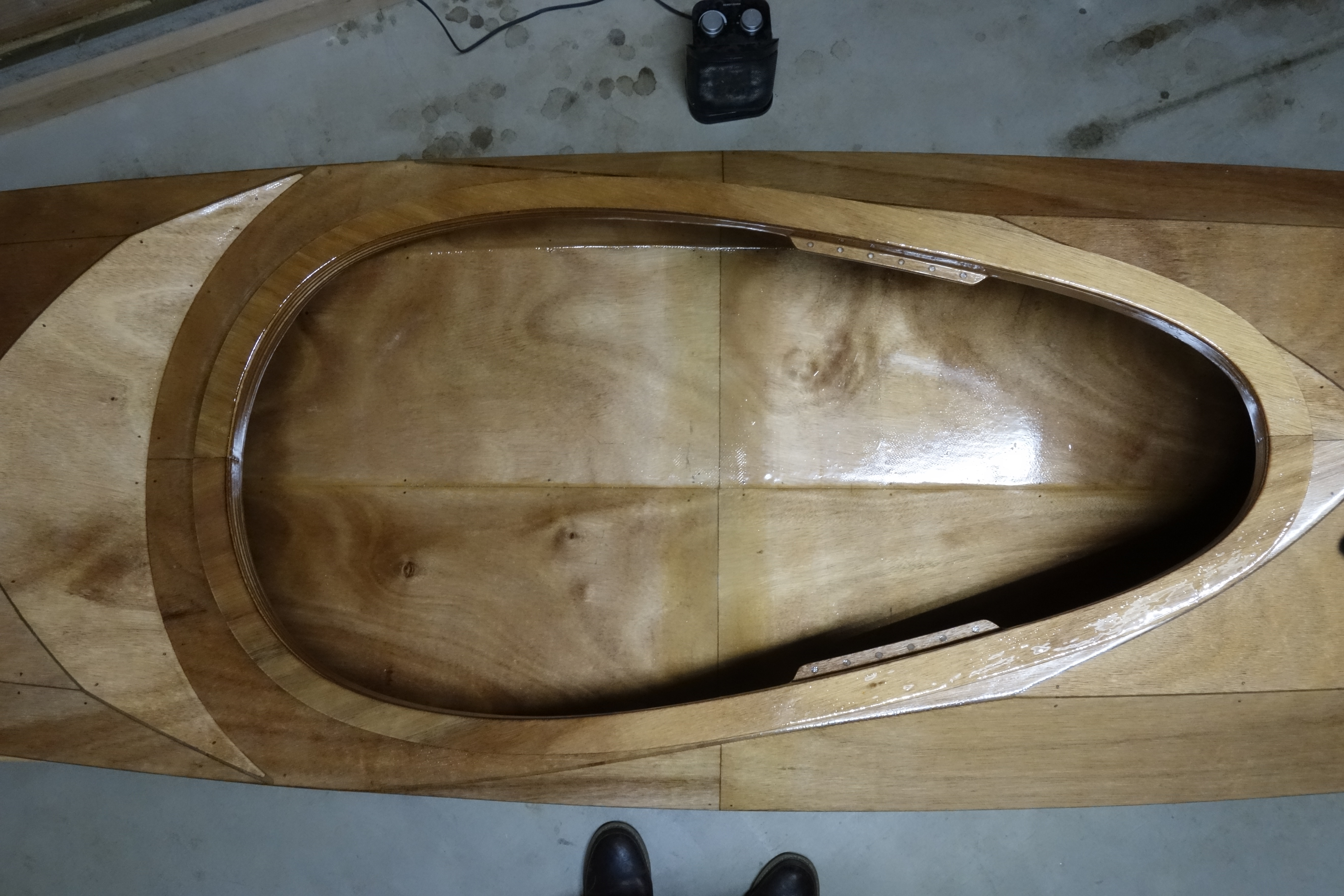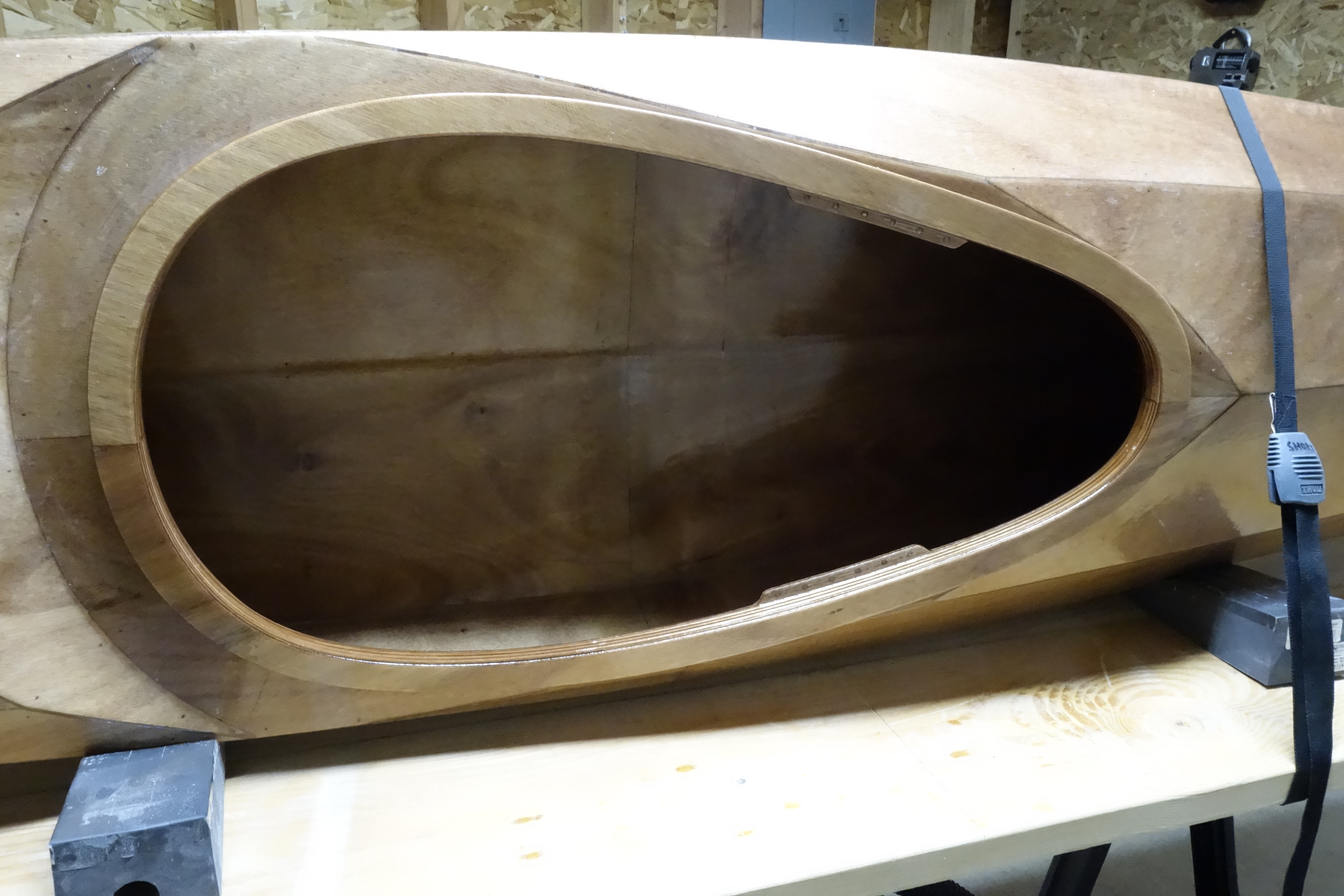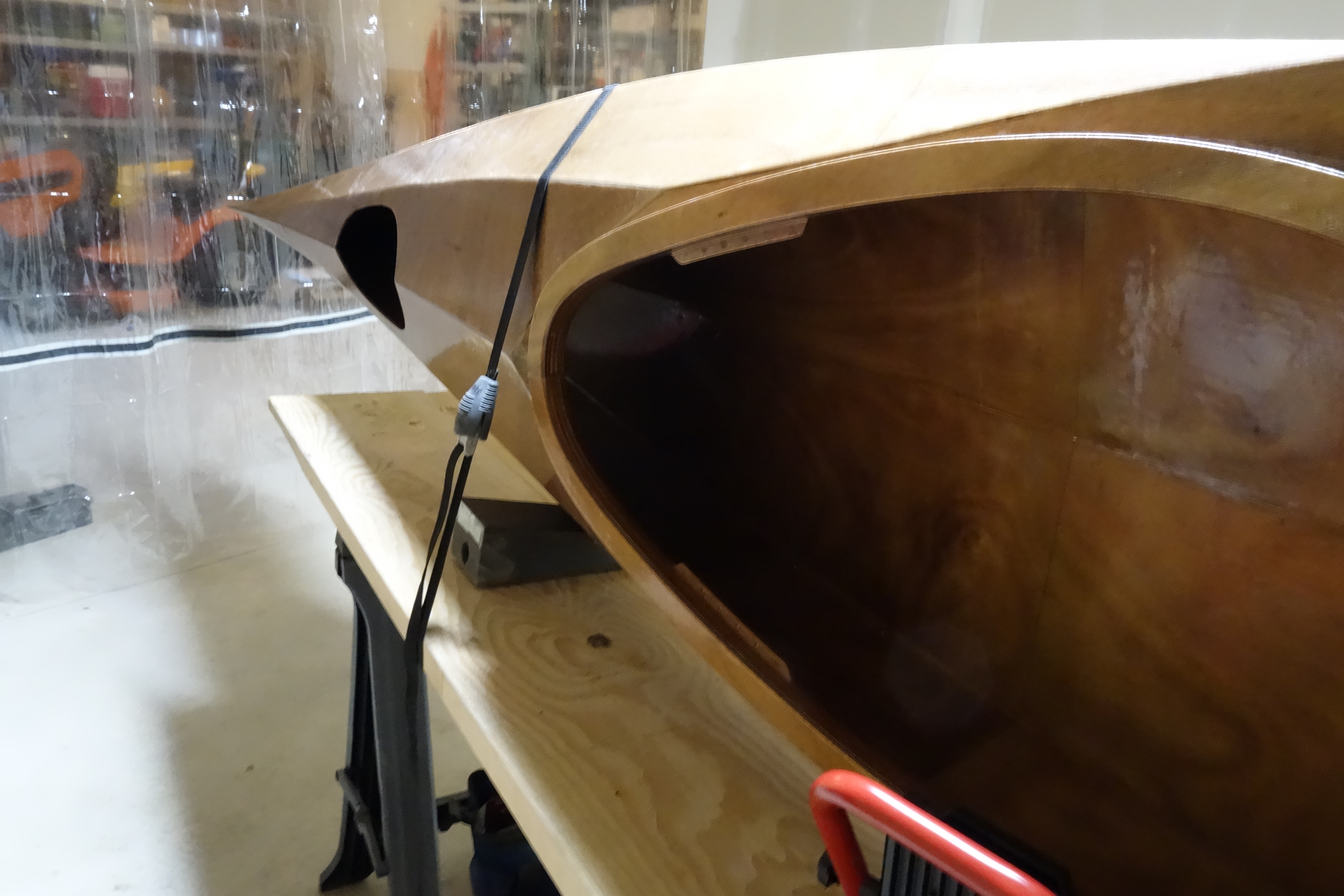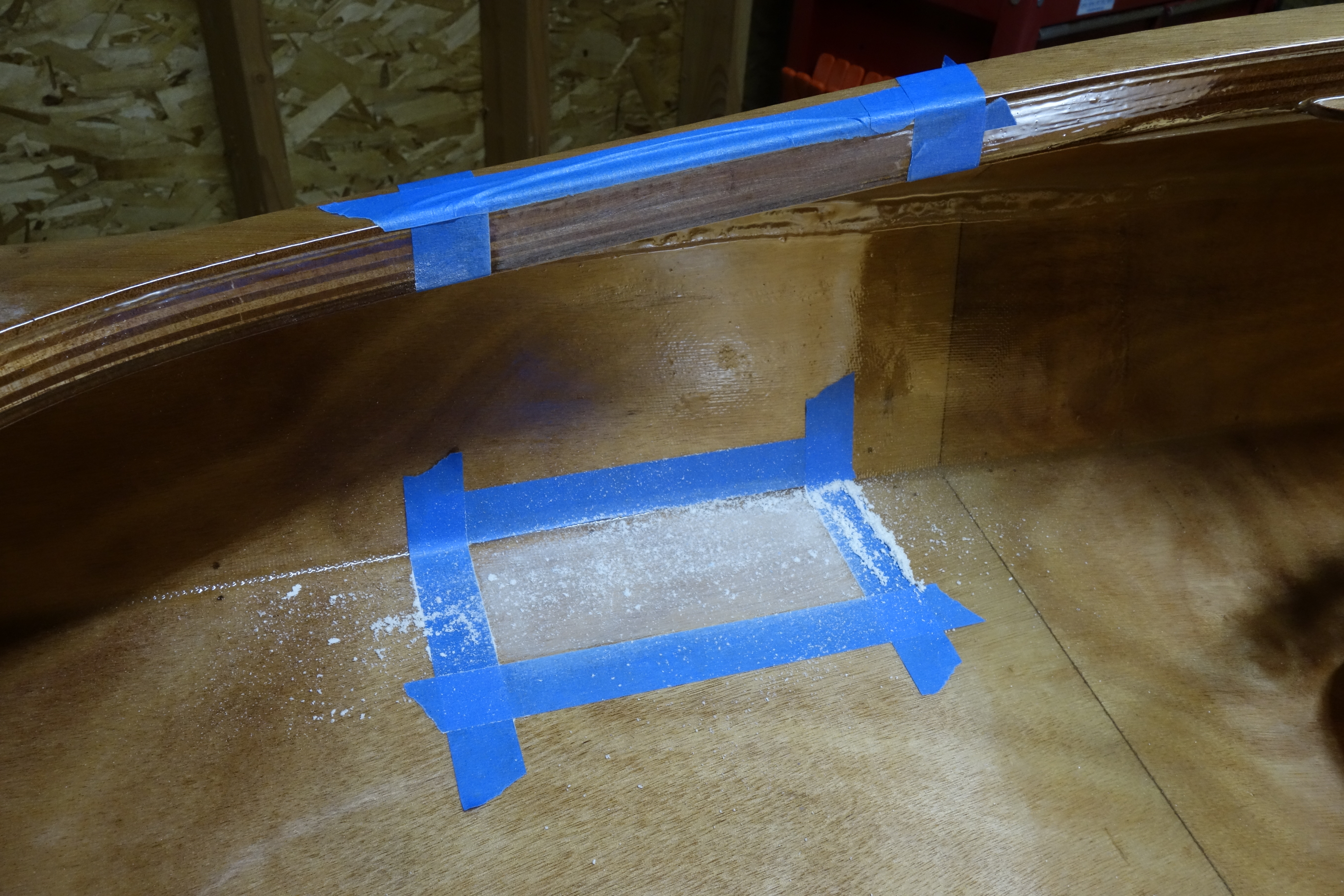 The entire inside of the kayak will be cleaned and I’ll lightly sand any high spots in the tape and give it a light coat of epoxy, and then my plan is to put one coat of varnish over the entire inside of the kayak. EDIT: I talked with Suzanne at Pygmy Boats today and asked about varnishing inside the kayak, and she said in no uncertain terms, that it was a bad idea and that Pygmy advises against it. OK then. No varnish on the inside of the kayak. I’ll have to figure out another way to make the inside pretty.