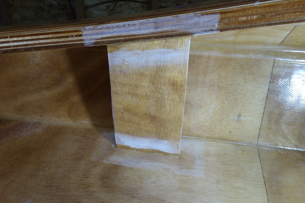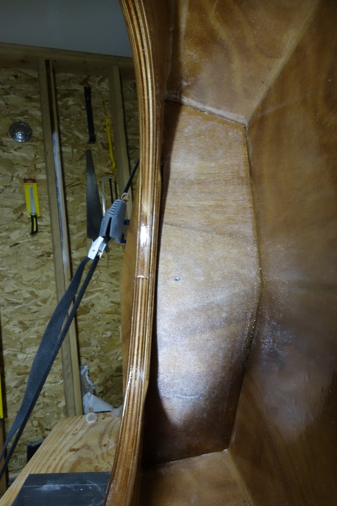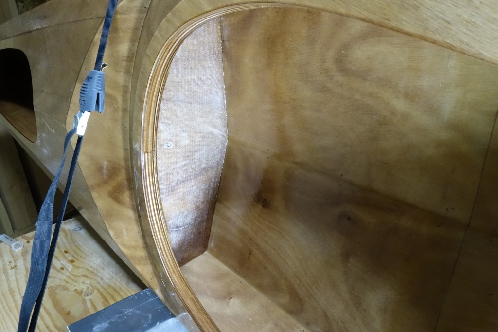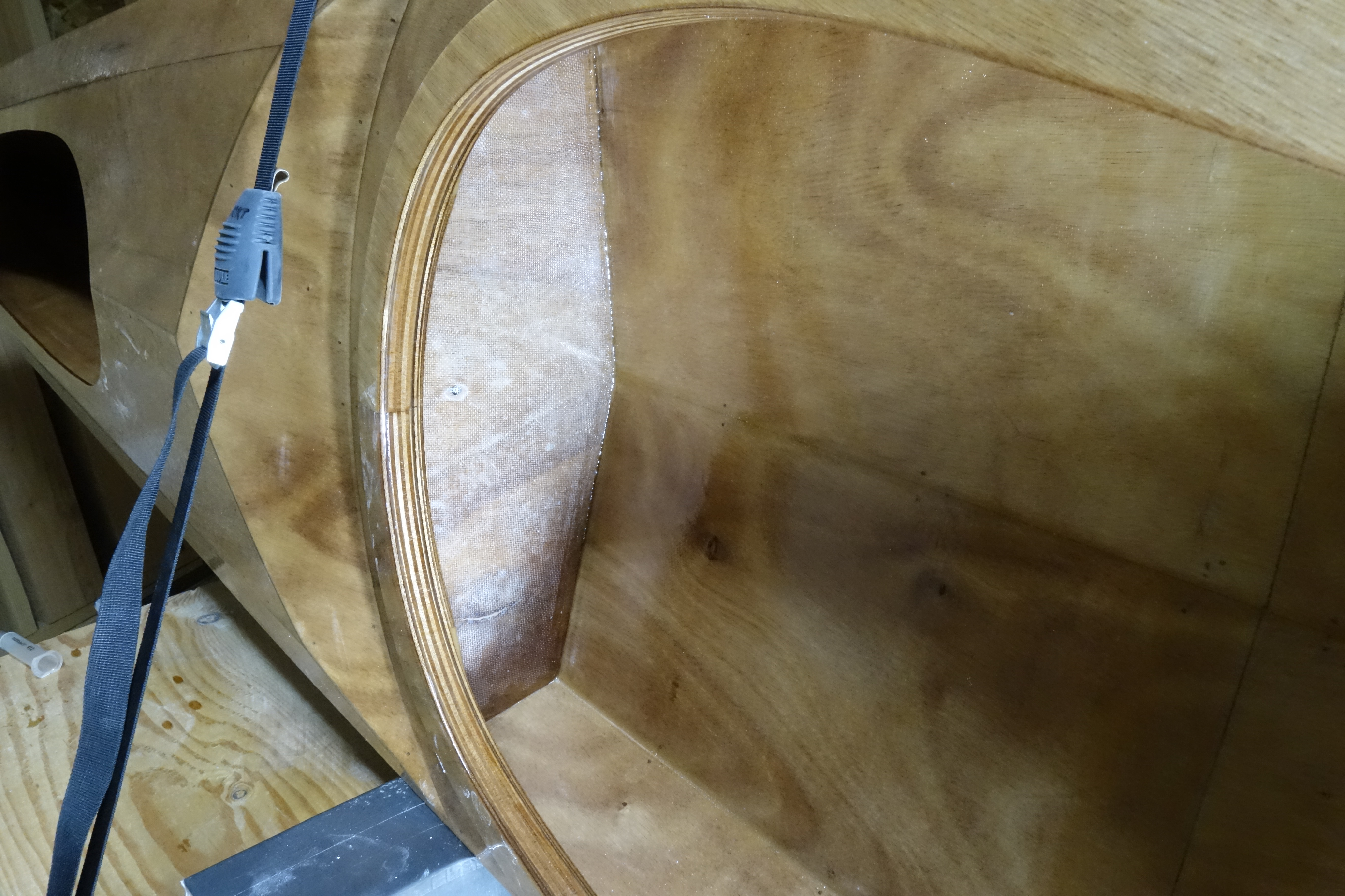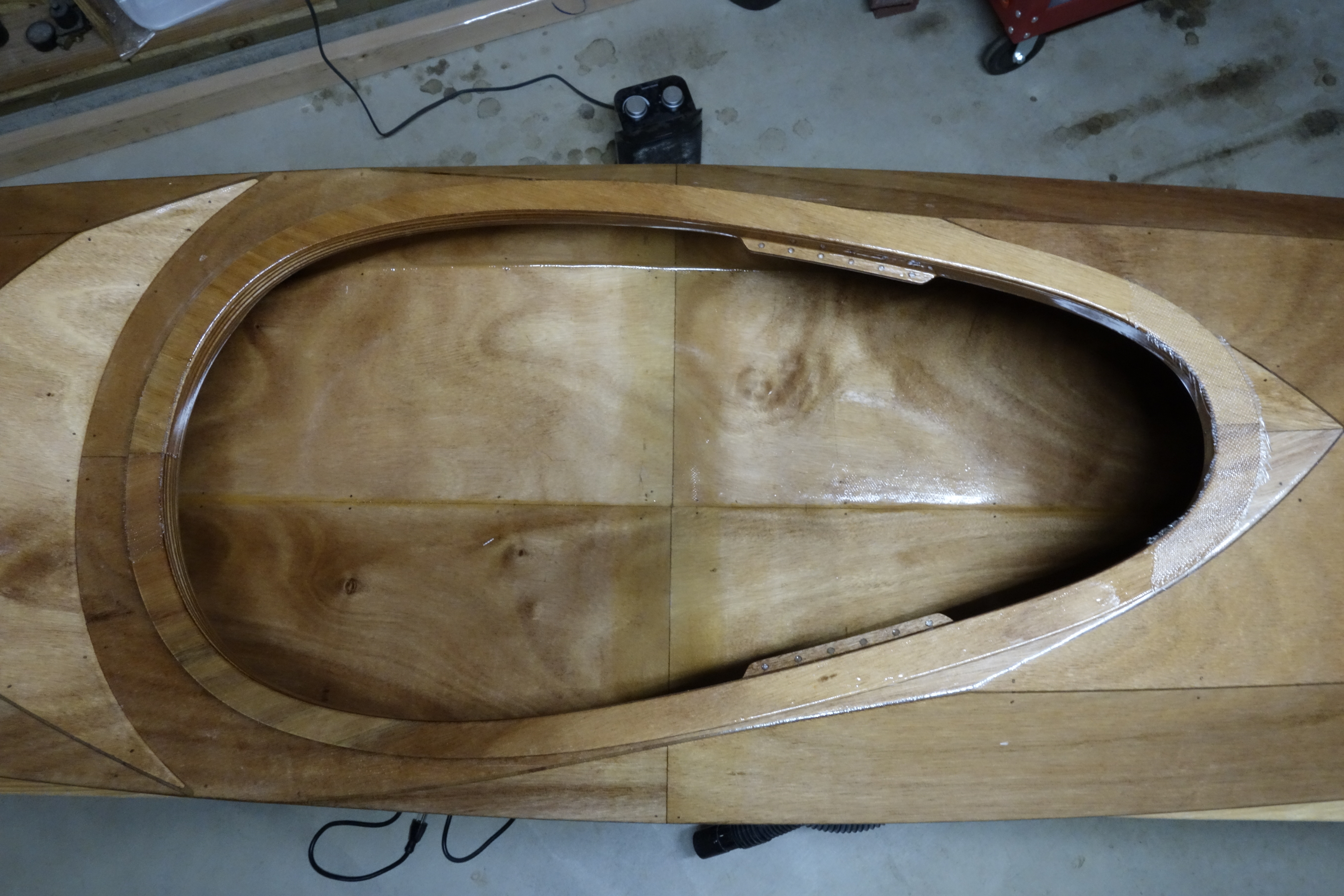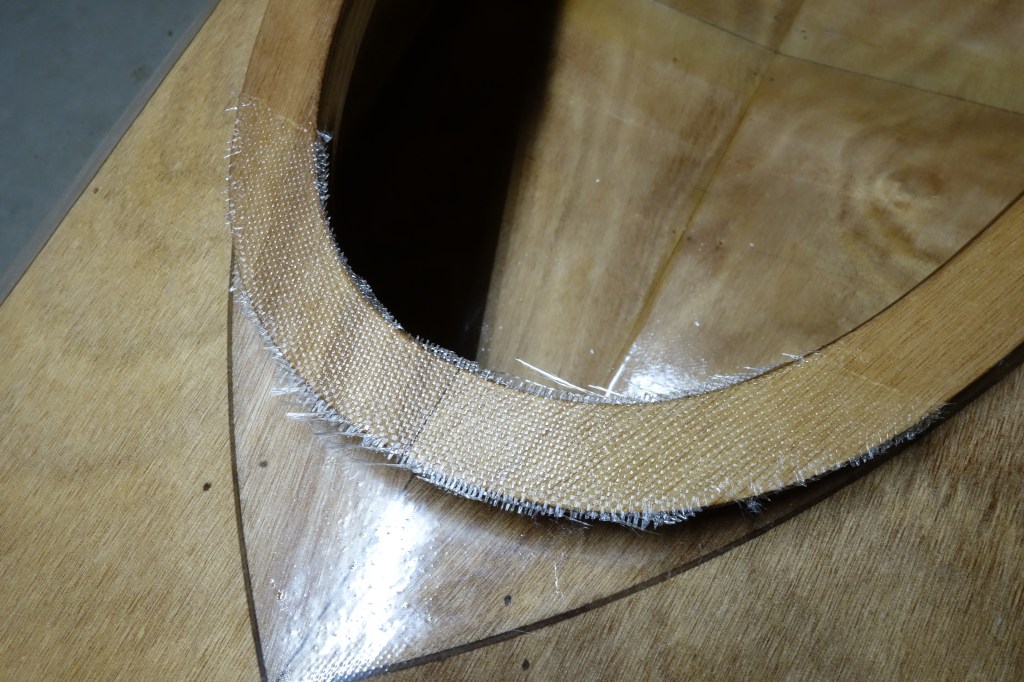 Front of the cockpit. The edges of this fiberglass cloth will get feathered in, and then fill coats of epoxy until it disappears. This will strengthen the coaming seams.Back of the cockpit.Hatch lips getting fiberglass cloth.