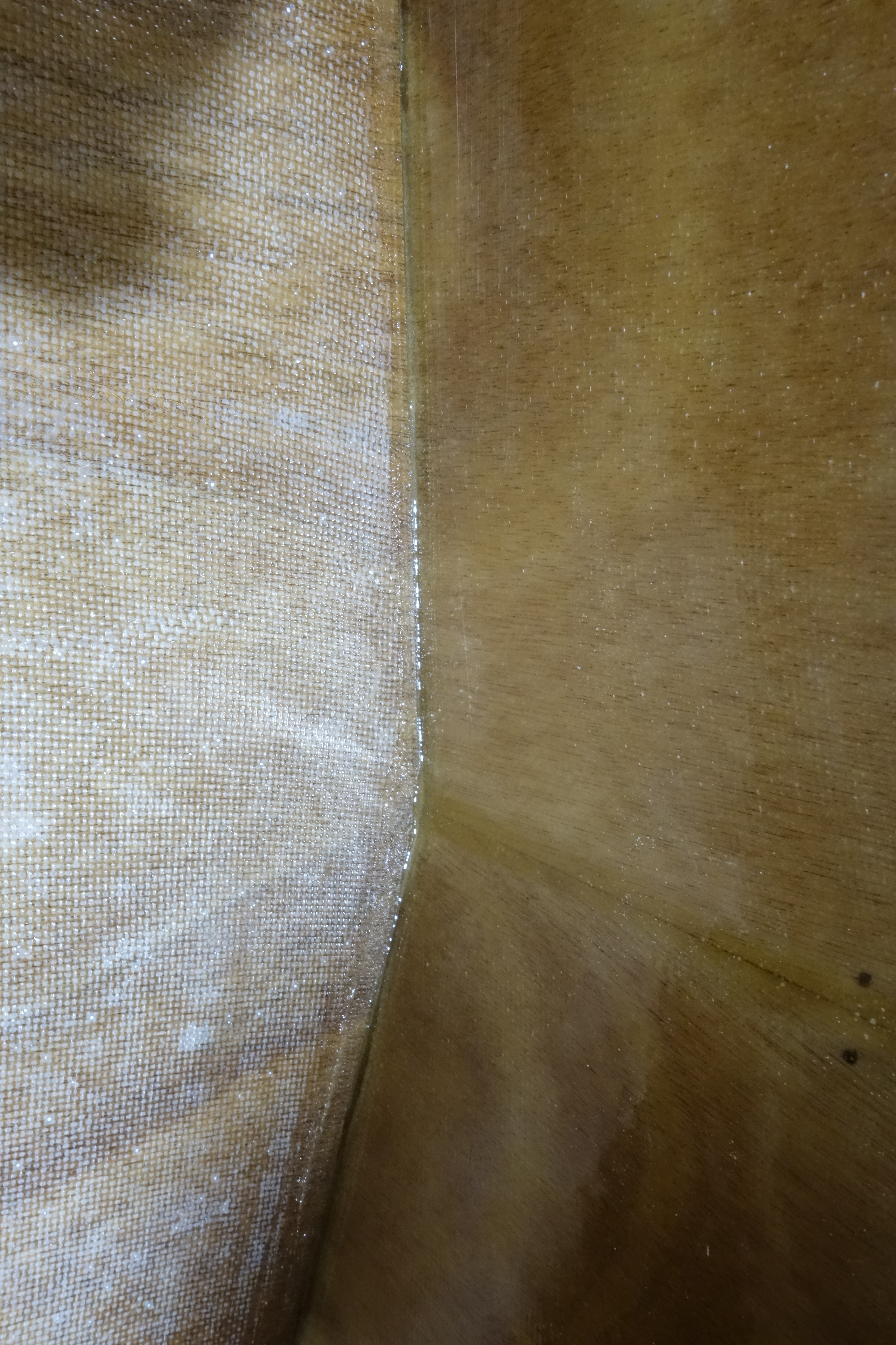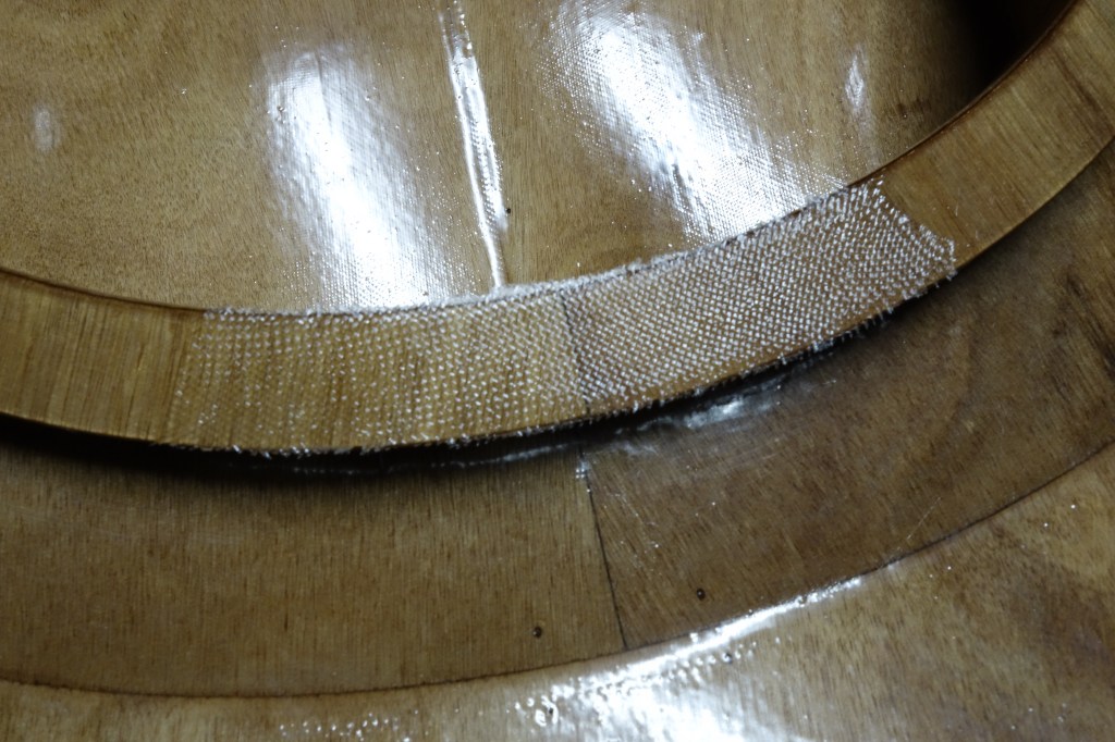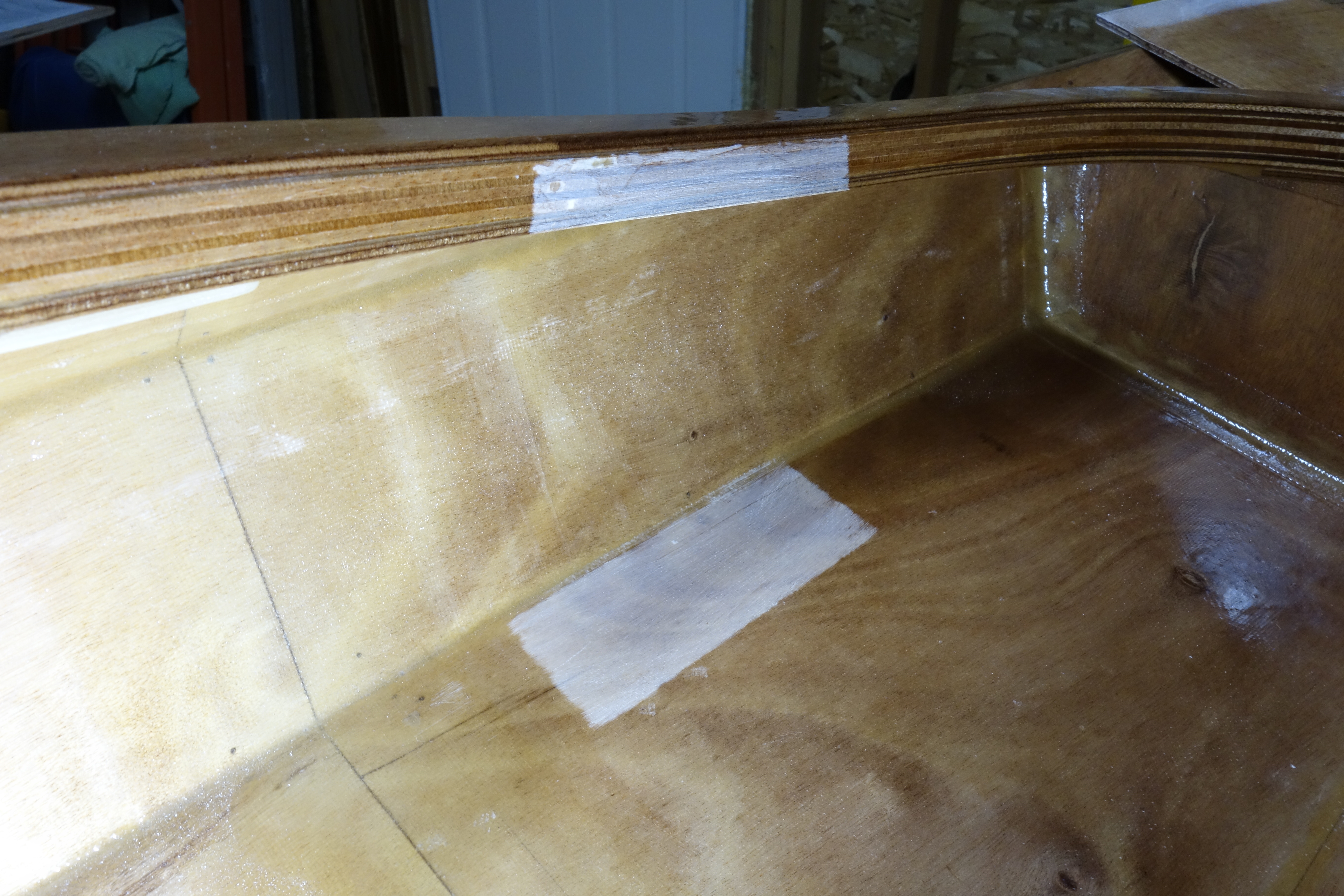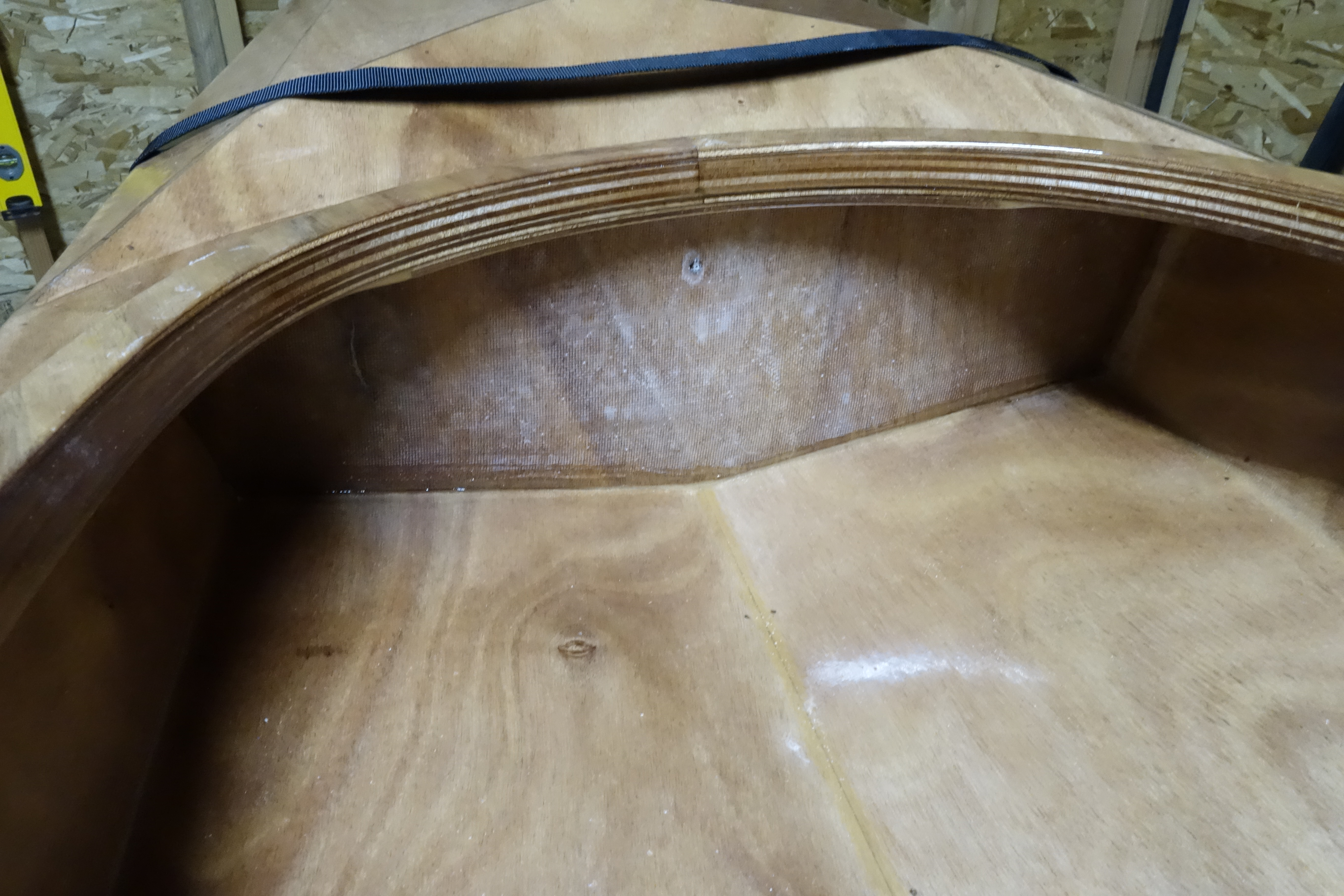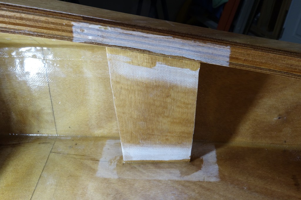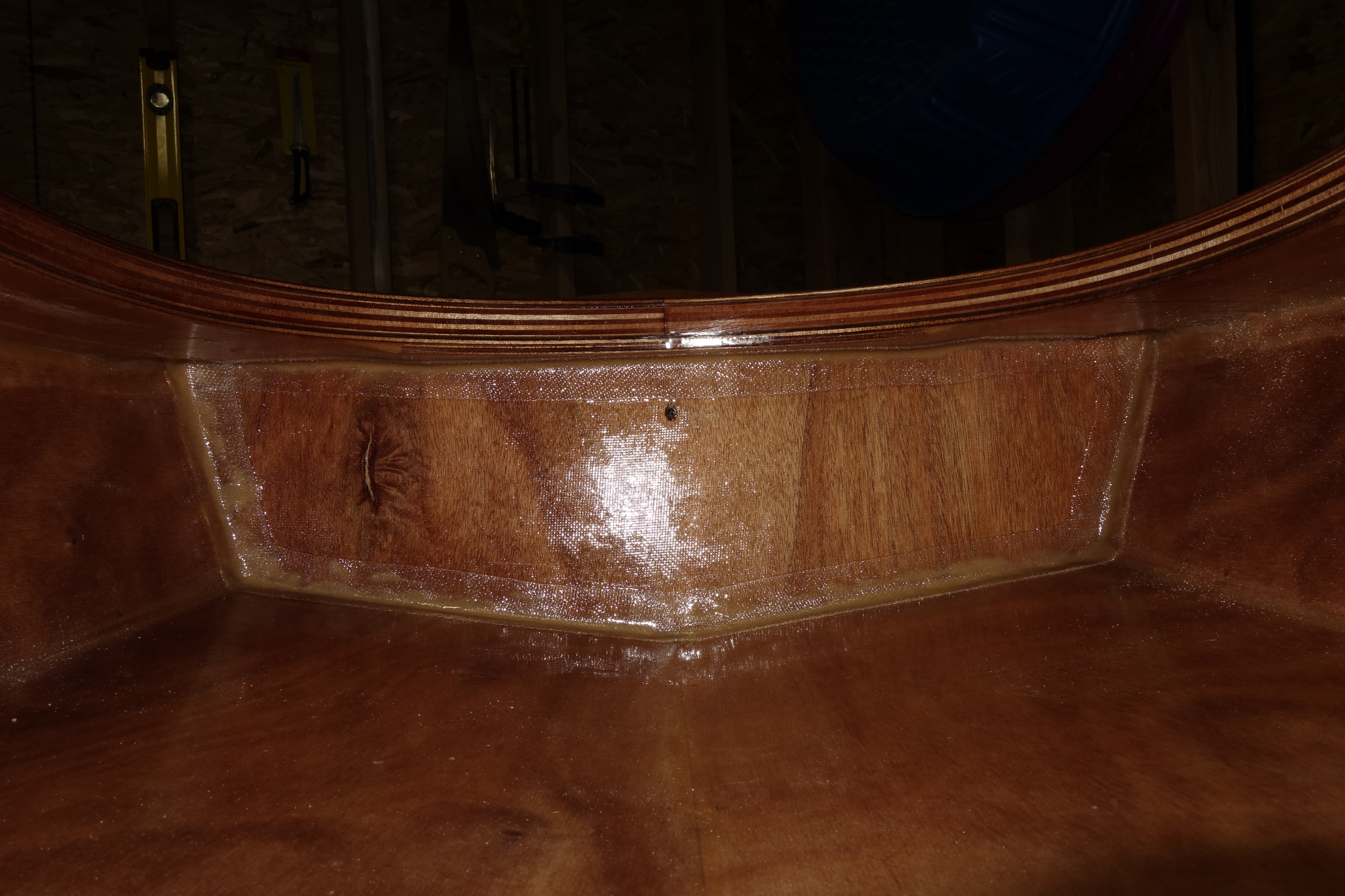 Front of the cockpit. The edges of this fiberglass cloth will get feathered in, and then fill coats of epoxy until it disappears. This will strengthen the coaming seams.Back of the cockpit.Hatch lips getting fiberglass cloth.