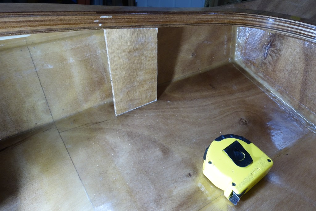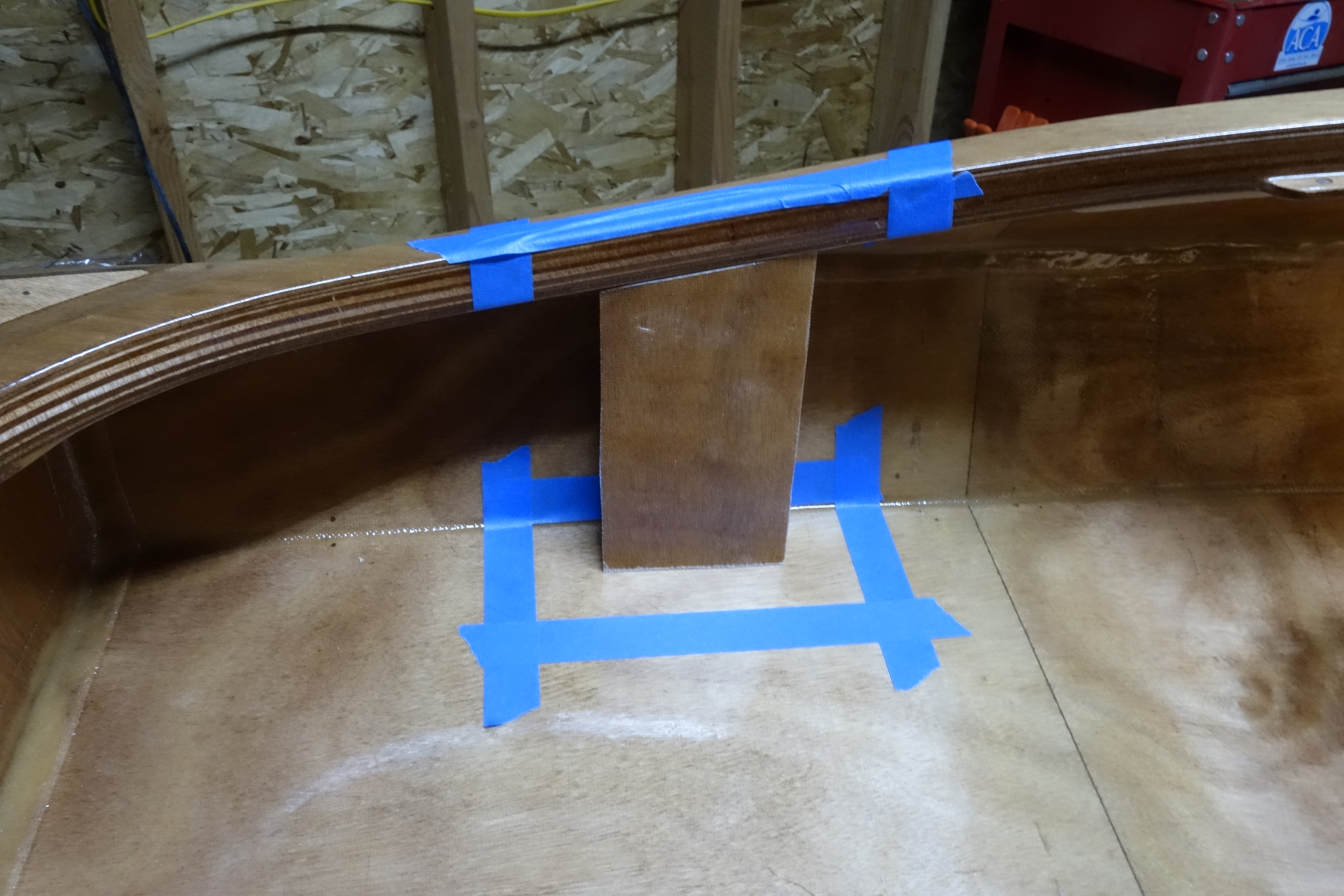 This evening I was able to complete the epoxy fillets and fiberglass tape on the aft bulkhead. There is undoubtedly some technique for making nice, clean fillets to embed the tape into, but I clearly don’t know it. The instructions said to “smear a fillet of thickened epoxy around the bulkhead and glass it in place.” So I thickened the epoxy to the same consistency that Pygmy recommended for the fillets on the shear seams (thickened to sag, but not run), but I think I should have made it thicker (like putty maybe) and applied it by hand instead of using the dental syringe to squirt it into the gap and then trying to smooth it out like caulk. I got the job done, but it isn’t pretty. At least it is consistent with the appearance of the shear seams I suppose. One thing is certain though, these bulkheads are water-tight and aren’t going anywhere! In the next couple of days, and before I start on the hip braces, I will knock the rough, high edges off the fiberglass tape on the bulkheads and give them a light coat of epoxy to make them smoother so nothing can catch on them.