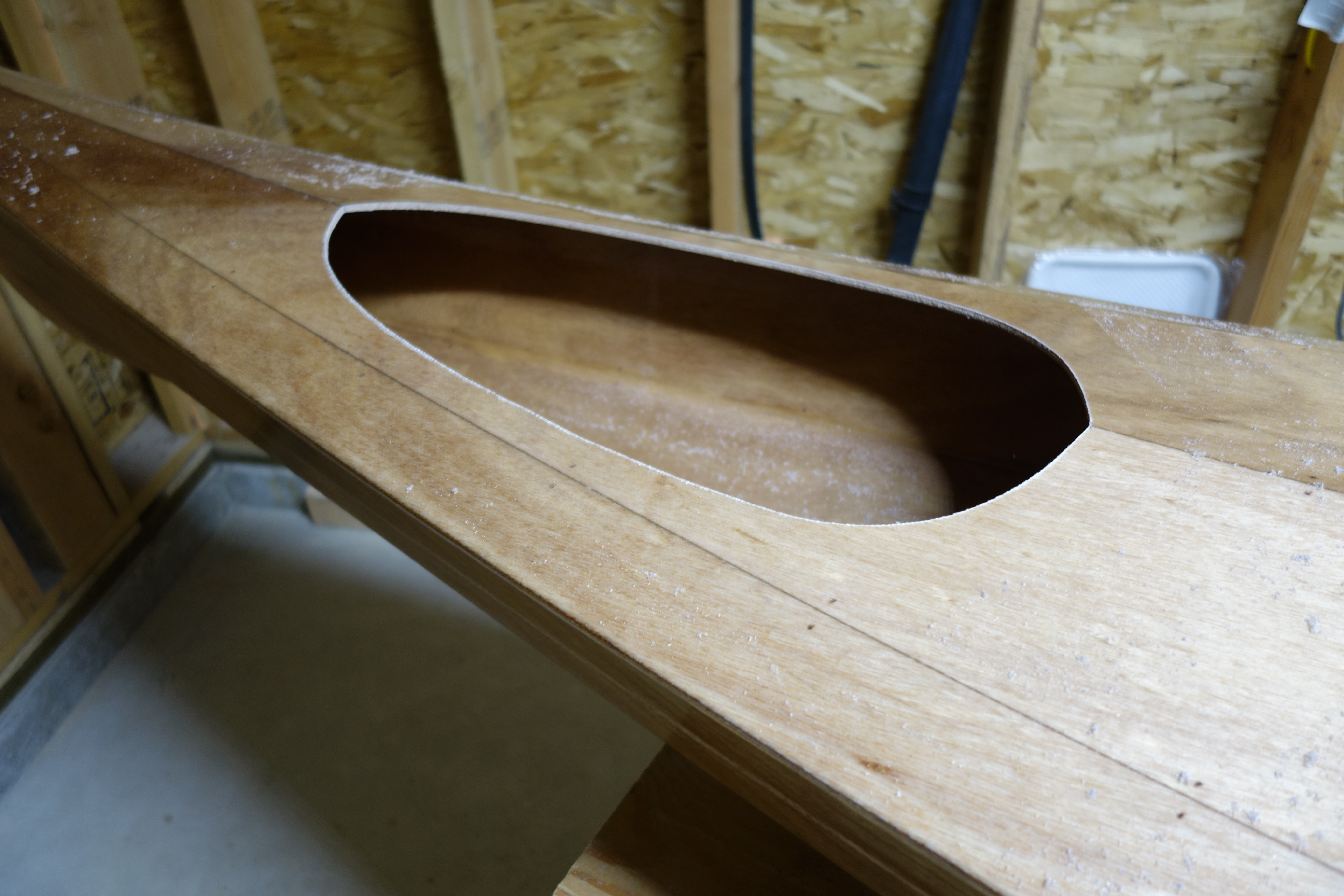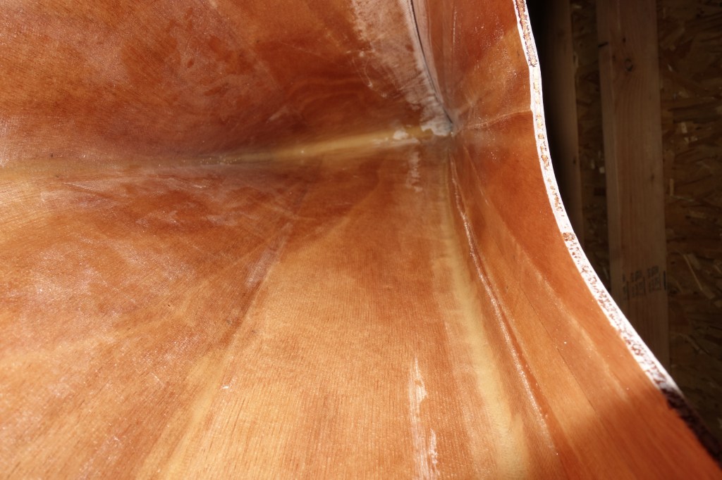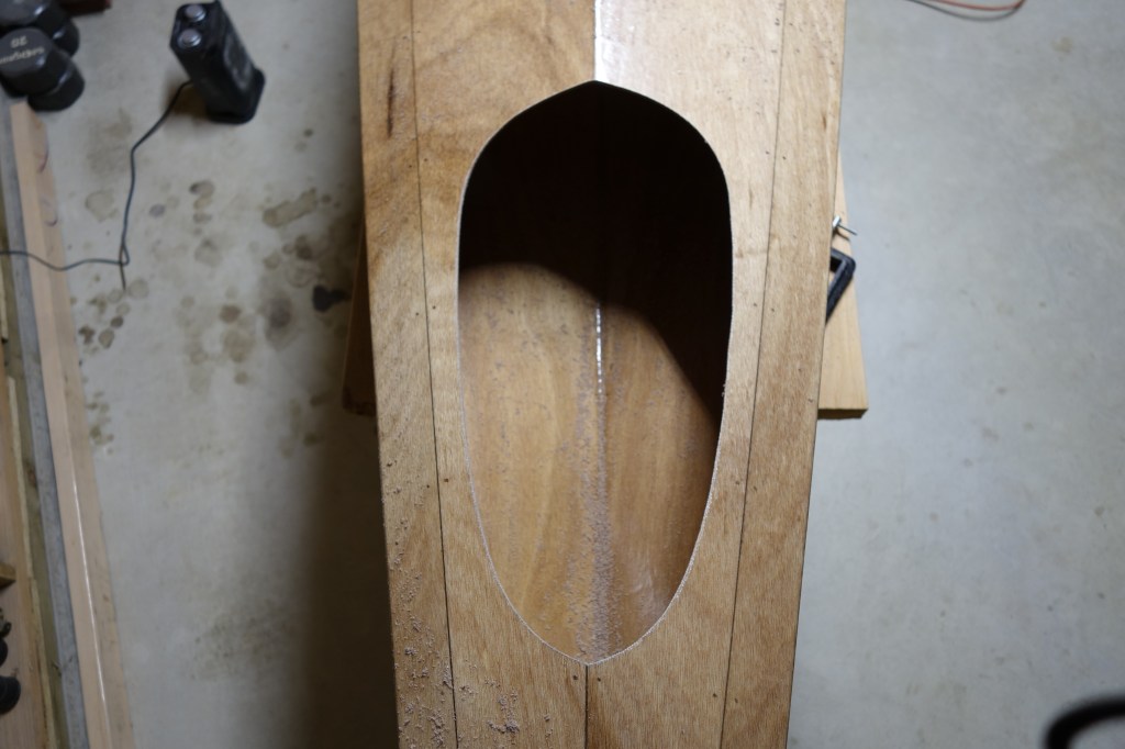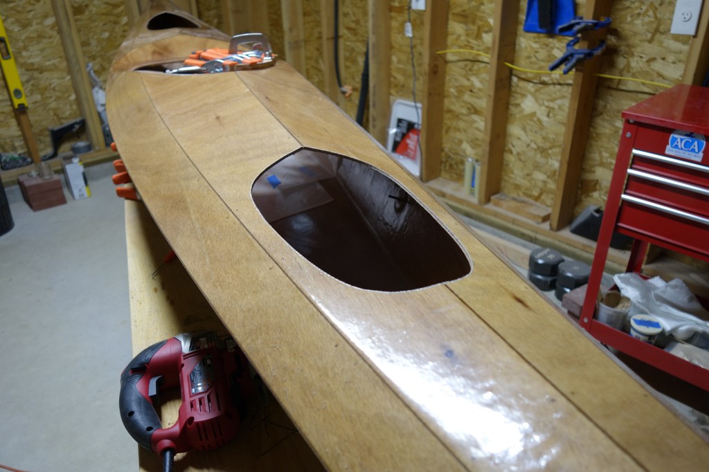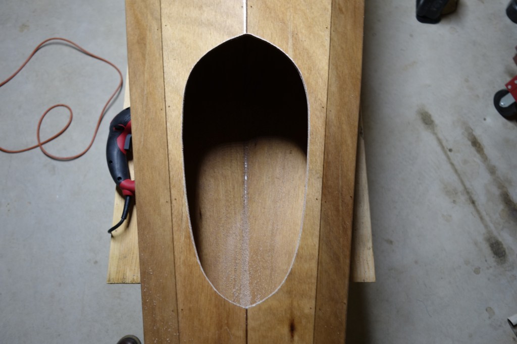 Filing and rough sanding done on the cockpit coaming. The upper coaming didn’t go together quite the way that I would have liked, but it turned out fine. There is probably something about fitting a fairly rigid curved piece of wood to another complex curve that eluded me, but would have been simple for someone else. Anyway, there have only been a couple of stages/processes in the entire build where I have wished that I could go back in time a day or two and try again and this was one of them. What happened in this case is that is that as I glued the upper coaming pieces, there were places that I couldn’t flex the upper pieces enough to make them “flush” everywhere with the inside of the lower coaming. In a couple of spots I thought that the upper pieces were only hanging over the inside of the coaming by an 1/16″ or so, but after the epoxy had cured and the clamps were removed, I found that in at least one section it was hanging over the inside edge as much as 3/16″, which is a lot when the overall width of the upper coaming piece is 1.25″. That meant that by sanding the insides of the upper coaming flush with the lower coaming, I was making the upper coaming narrower in a couple of places by nearly a 1/4″. This is definitely visible to the naked eye. I did my best to adjust both sides so that the kayak would have “bilateral symmetry”, but it isn’t perfect. Initially I was worried that maybe I really screwed up and actually made the outside of the coaming too shallow to hold a spray skirt securely, but I tested it and it’s fine. I may be the only one to ever notice this, but still…
