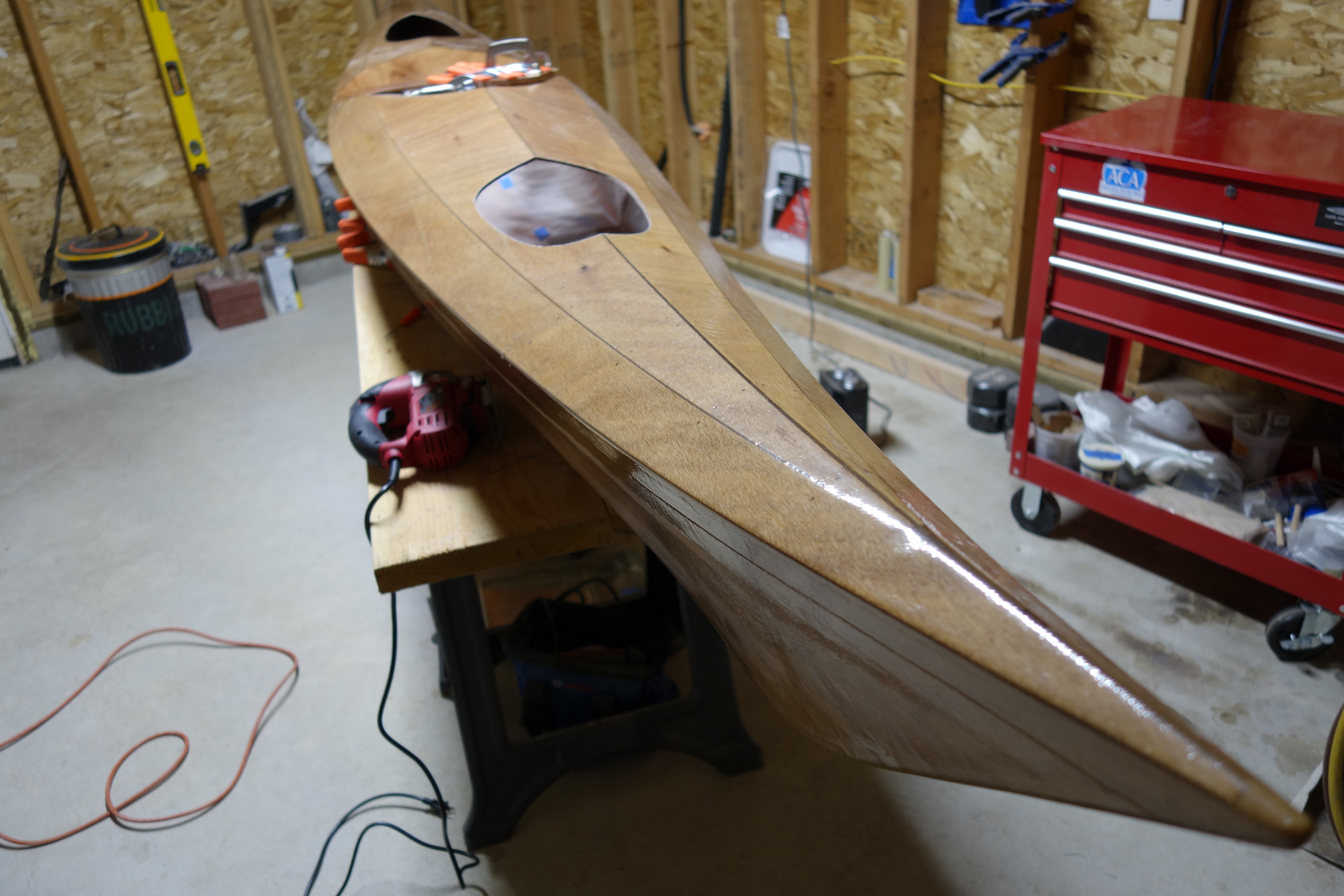 Next steps are to epoxy and fiberglass tape the shear seams inside the kayak. After that, installation of the bulkheads and hip braces, then end pours, then finishing the hatch openings and hatch covers and drilling the holes at the bow and stern for hand toggles. At that point, the kayak construction will be complete. All that will need to be done after that is hours of sanding and varnishing. Then deck rigging. Then paddling!