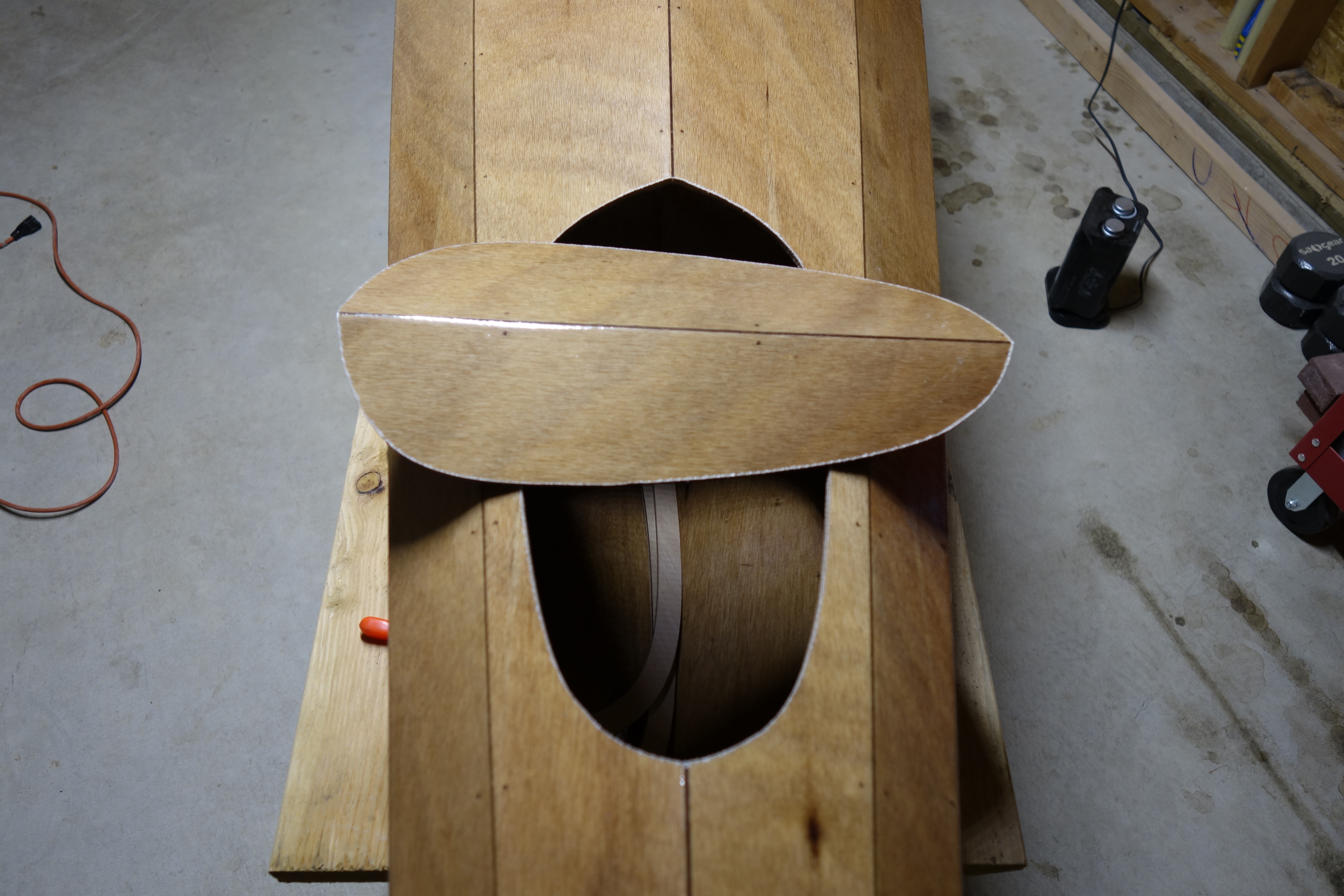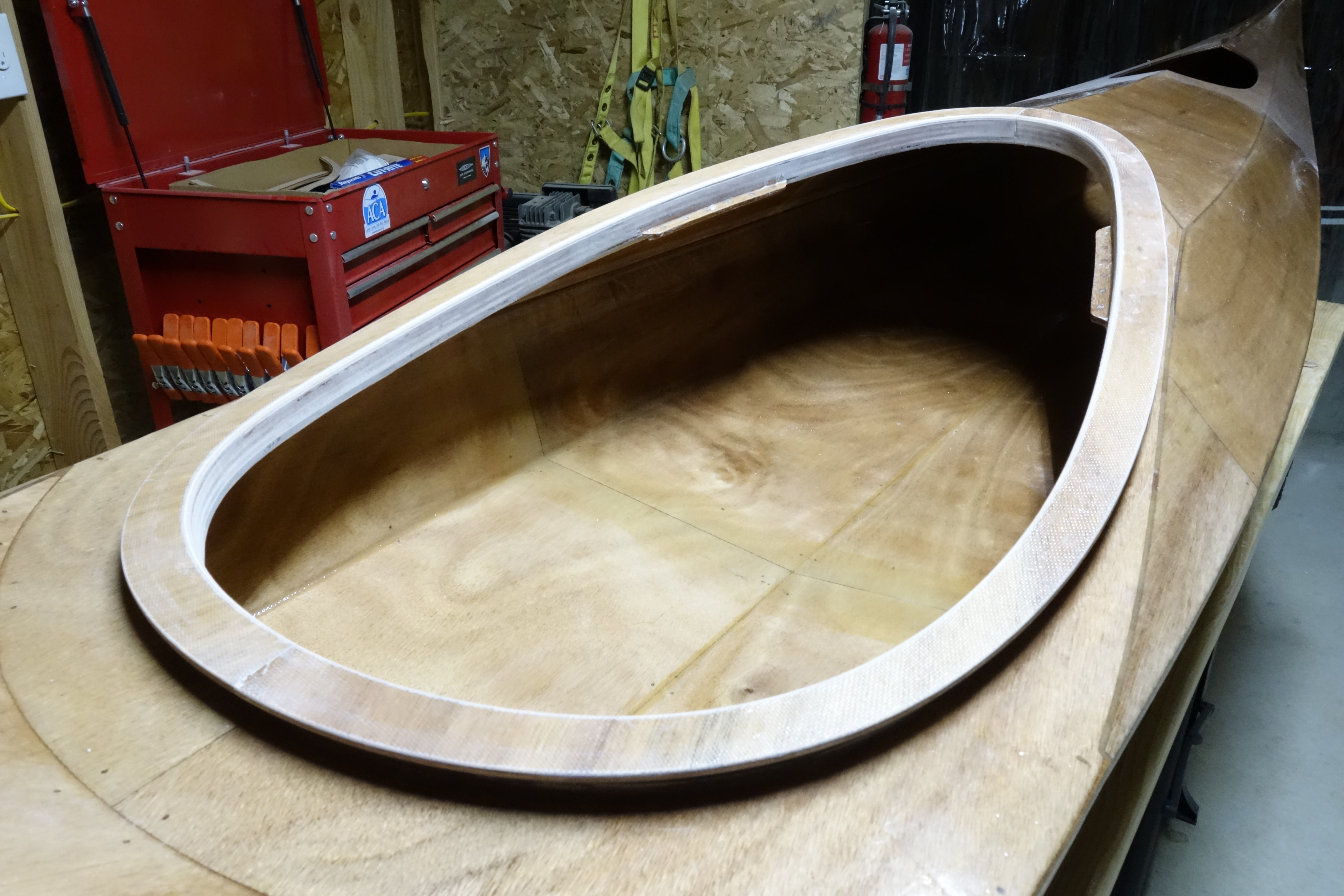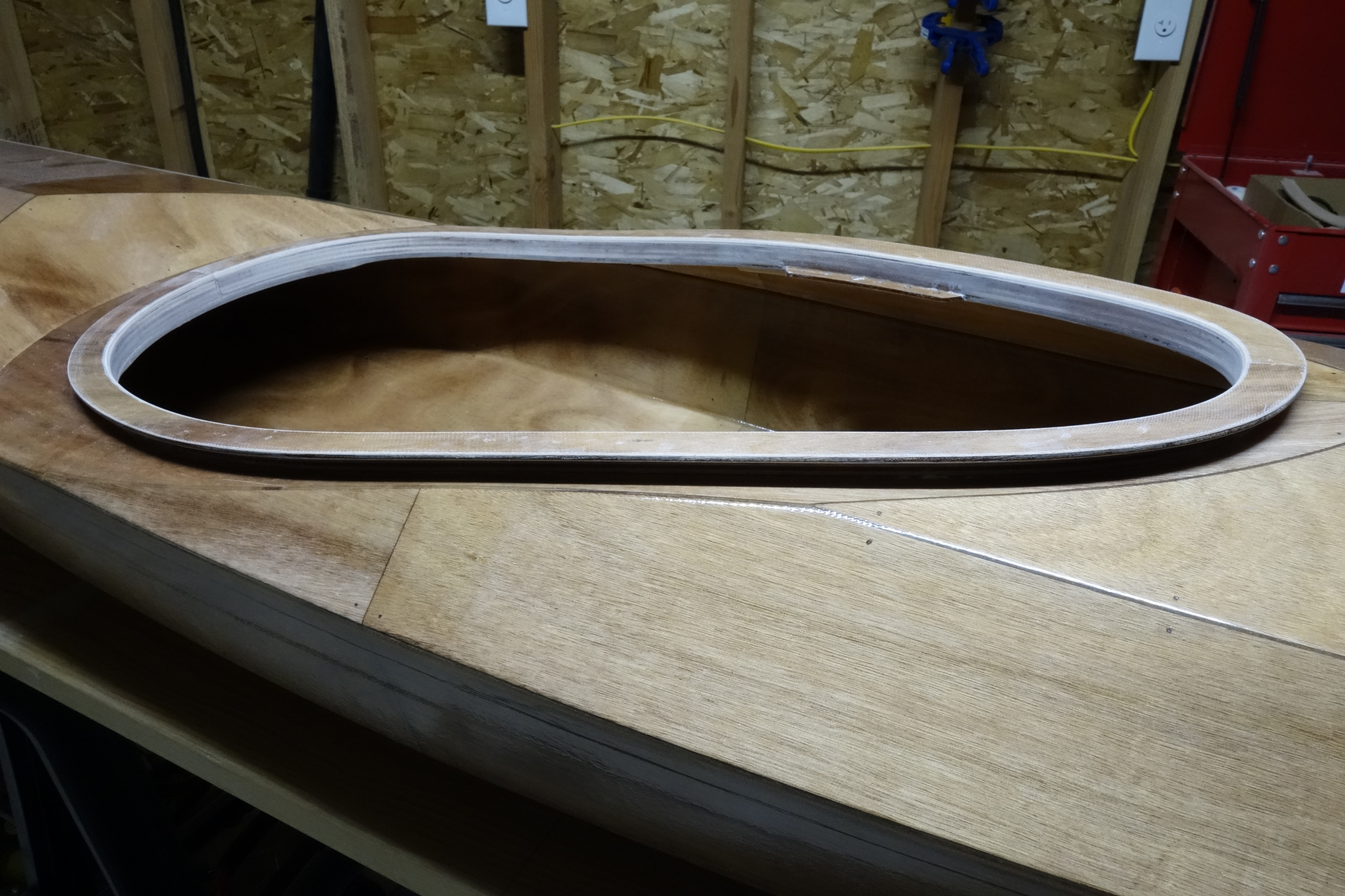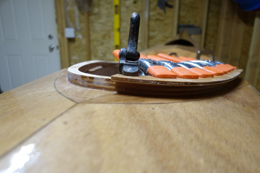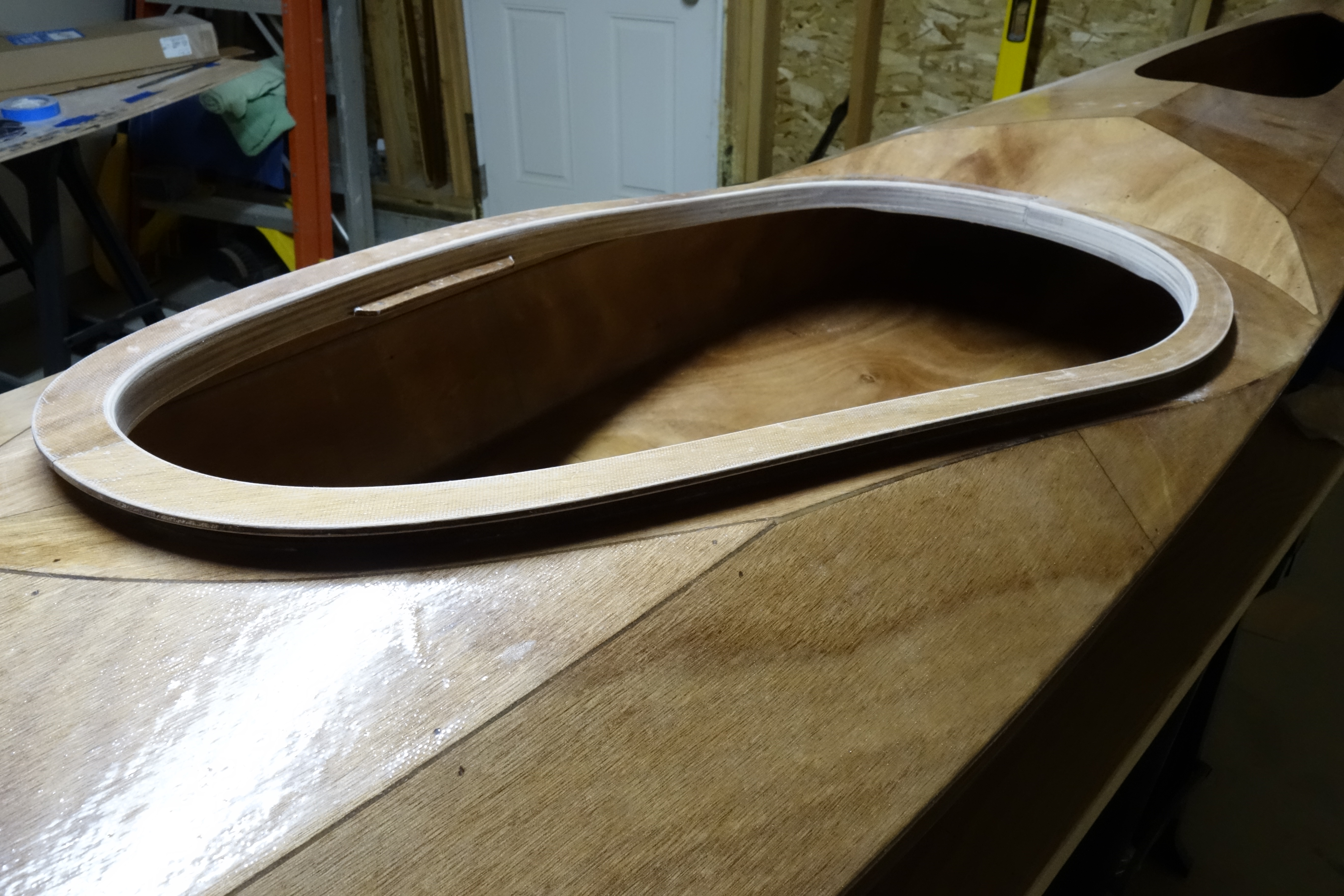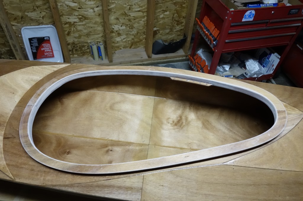 I was able to get the first half of the upper cockpit coaming glued up. It will have to cure for at least 24 hours before I can move on to the other half. Then I’ll sand it all smooth and round over the edges, etc. After the cockpit coaming is done I will start doing the inside of the shear seams. The way my schedule is going, that will most likely be next weekend as I haven’t really had time to work on the kayak after work during the week.