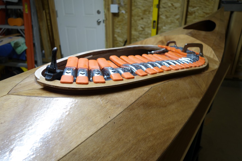 Lot’s of clamps make for better glue-ups. Also, just for the sake of saying so, since it had been way over 72 hours since I had fiberglassed and epoxied the upper coaming pieces, they were lightly sanded so that the epoxy will bond well.I couldn’t get one more clamp on this coaming if I tried! By the way, you can buy these clamps on Amazon in a 24 pack for not too much money and when you’re done building whatever you’re building, you will never have to worry about having too few clamps ever again!