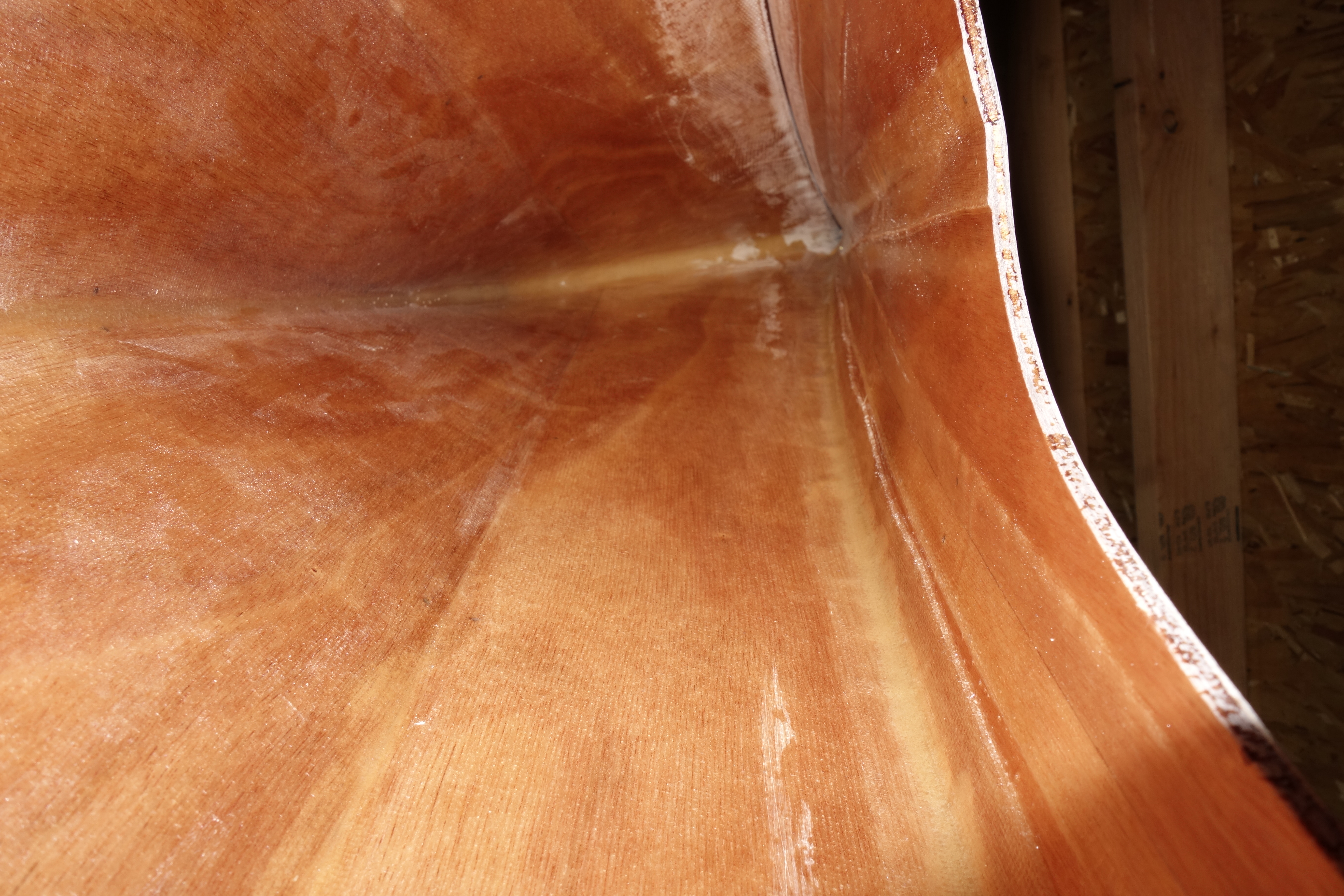 Looking at the stern of the kayak. You can see the seam that I haven’t taped at the top of the image.Looking at the bow end. You can see the seam that I haven’t taped at the top of the image.From the stern looking forward.Another shot looking forward. You can see the seam that I haven’t taped at the top of the image. If you zoom into this image you can see a break in the tape, right by the foot brace stud. Because of the difficulty of working in such tight spaces I had to do the epoxy fillet and tape in sections.