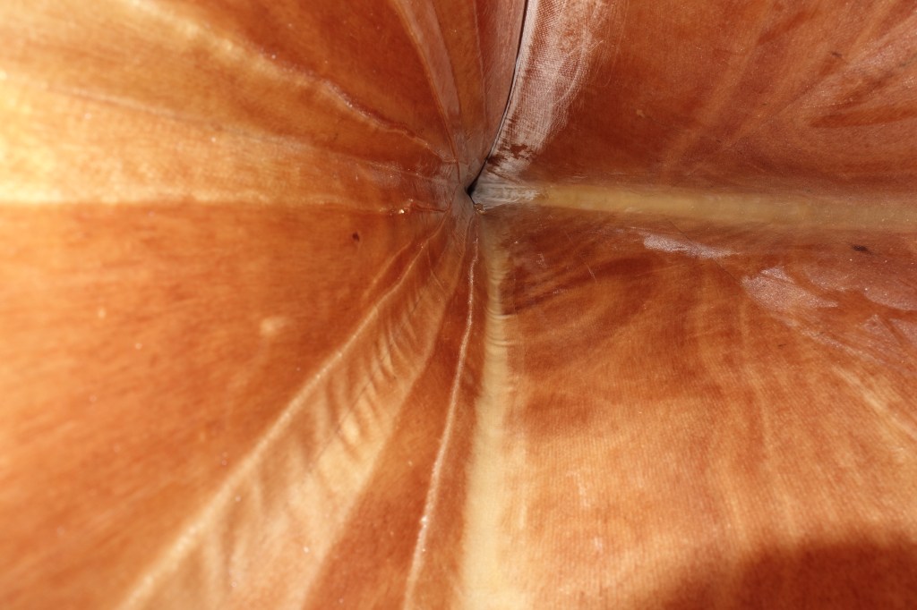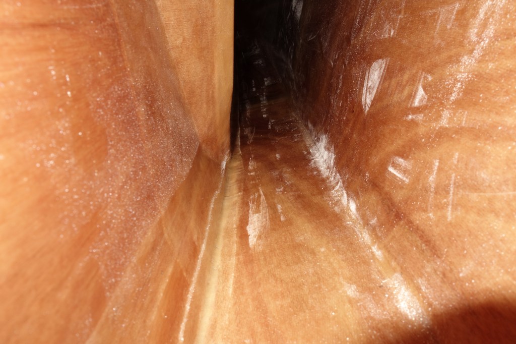 Now is the time to fillet and tape the insides of the shear seams. The first shear seam I worked on (on the port side) was challenging for me. The instructions for this process say to thicken epoxy with wood flour until it will sag, but not run and make a fillet down the seam, and to then bed the tape in the wet fillet and wet it out with epoxy, with a bristle brush. Seems simple enough, but I had some trouble getting the tape to lay down smoothly, etc. The good news is that because I waited until I cut the hatches before I did the shear seams I was able to get epoxy and tape almost all the way to the bow and stern tips, and the “end pours” that I will do later will definitely reach the rest of the way. I’ll do the starboard side tomorrow after work. When I am finished with the starboard side I will try to pass on any helpful advice I have (if I have any) about how to complete these seams with less stress and difficulty than I had on this first side of the kayak.