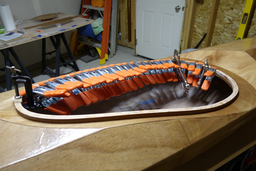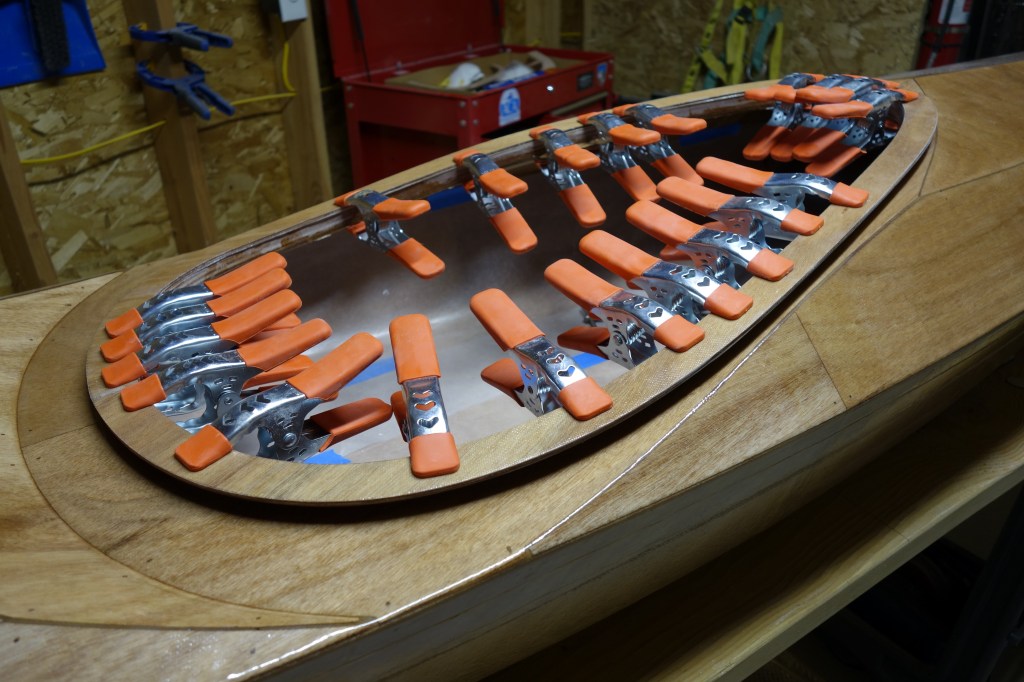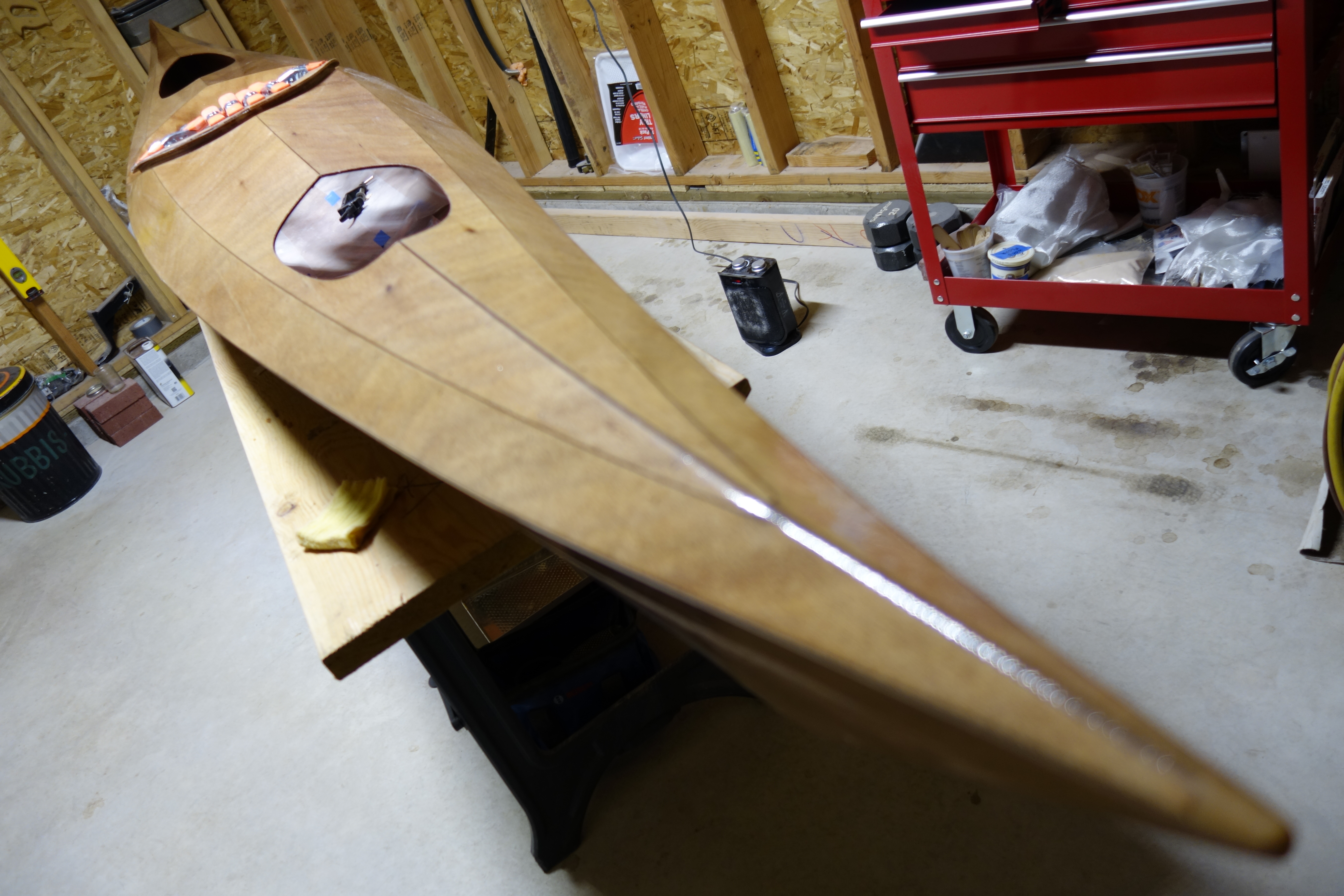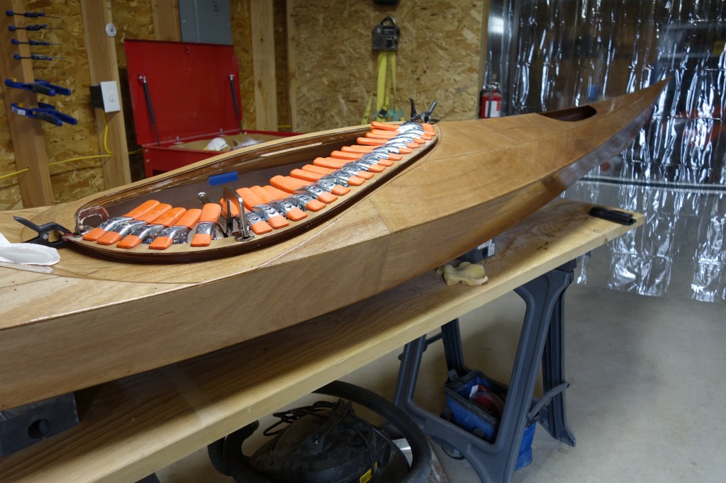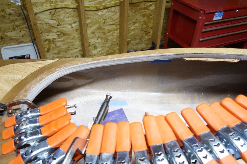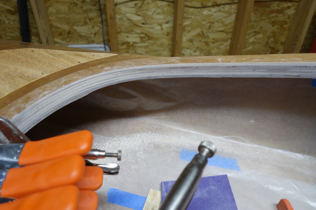 Late in the game I decided that I wanted to soften (sand down) the inner edge of the back of the cockpit coaming so that it wouldn’t bite into the small of my back when I am attempting layback rolls. When I did the final fill coat it was apparent to me that the coaming needed one more coat of epoxy in the area where I filed and sanded at the back of the cockpit. So I sanded the whole coaming and gave it all one more coat. I can still see that cut I accidentally made in the fiberglass cloth, deep under the epoxy, but I have made my peace with it. Overall, the coaming looks good I think.