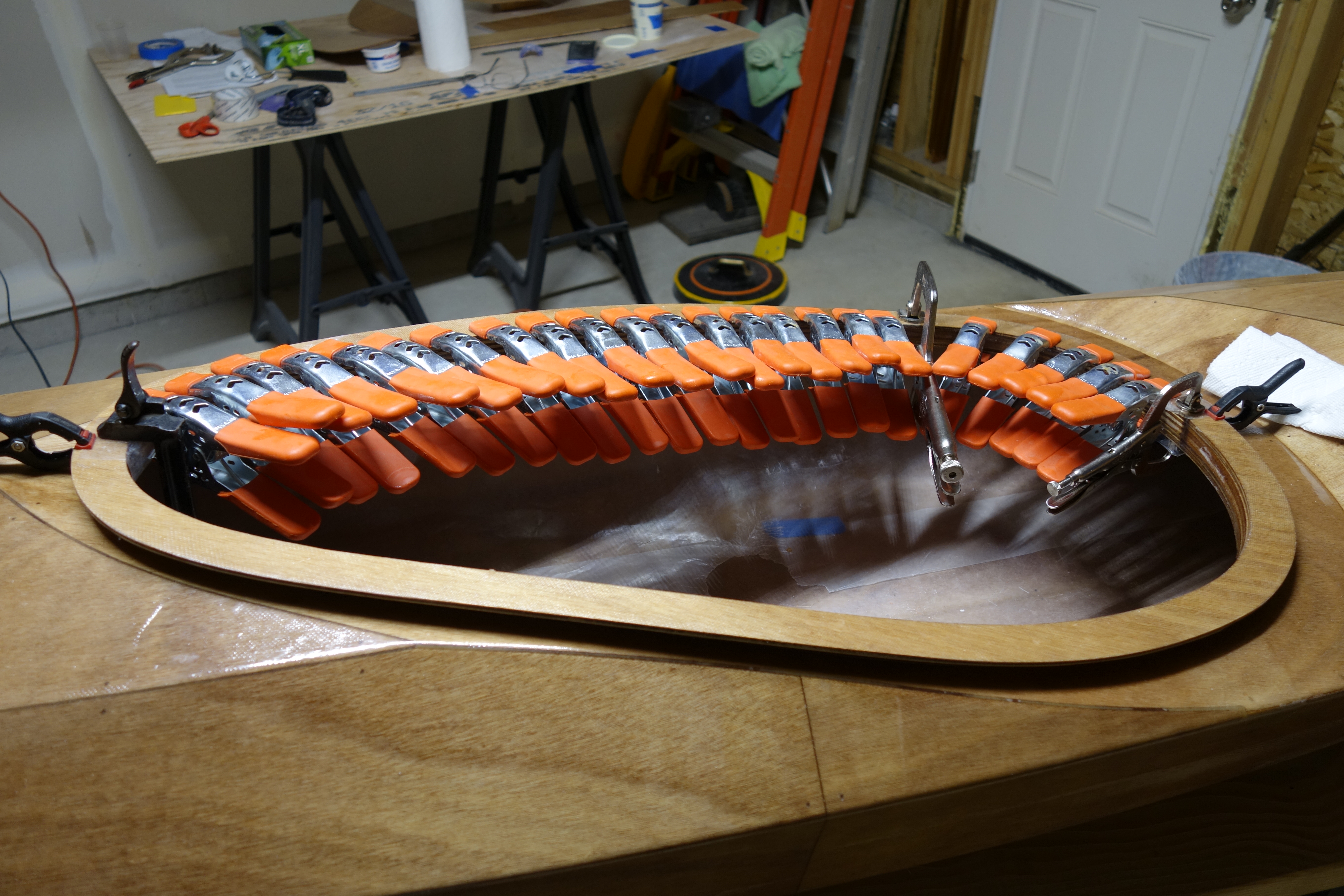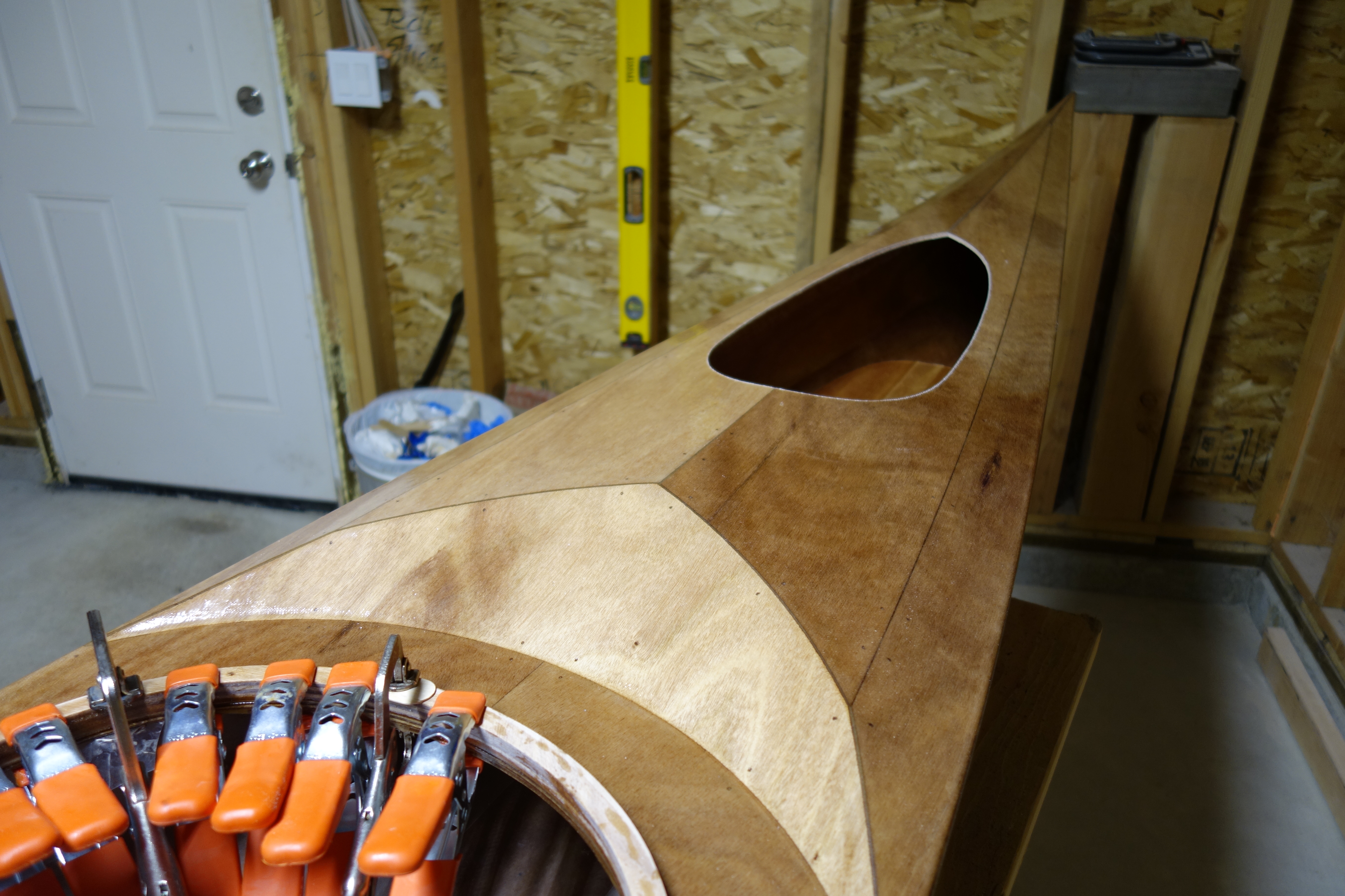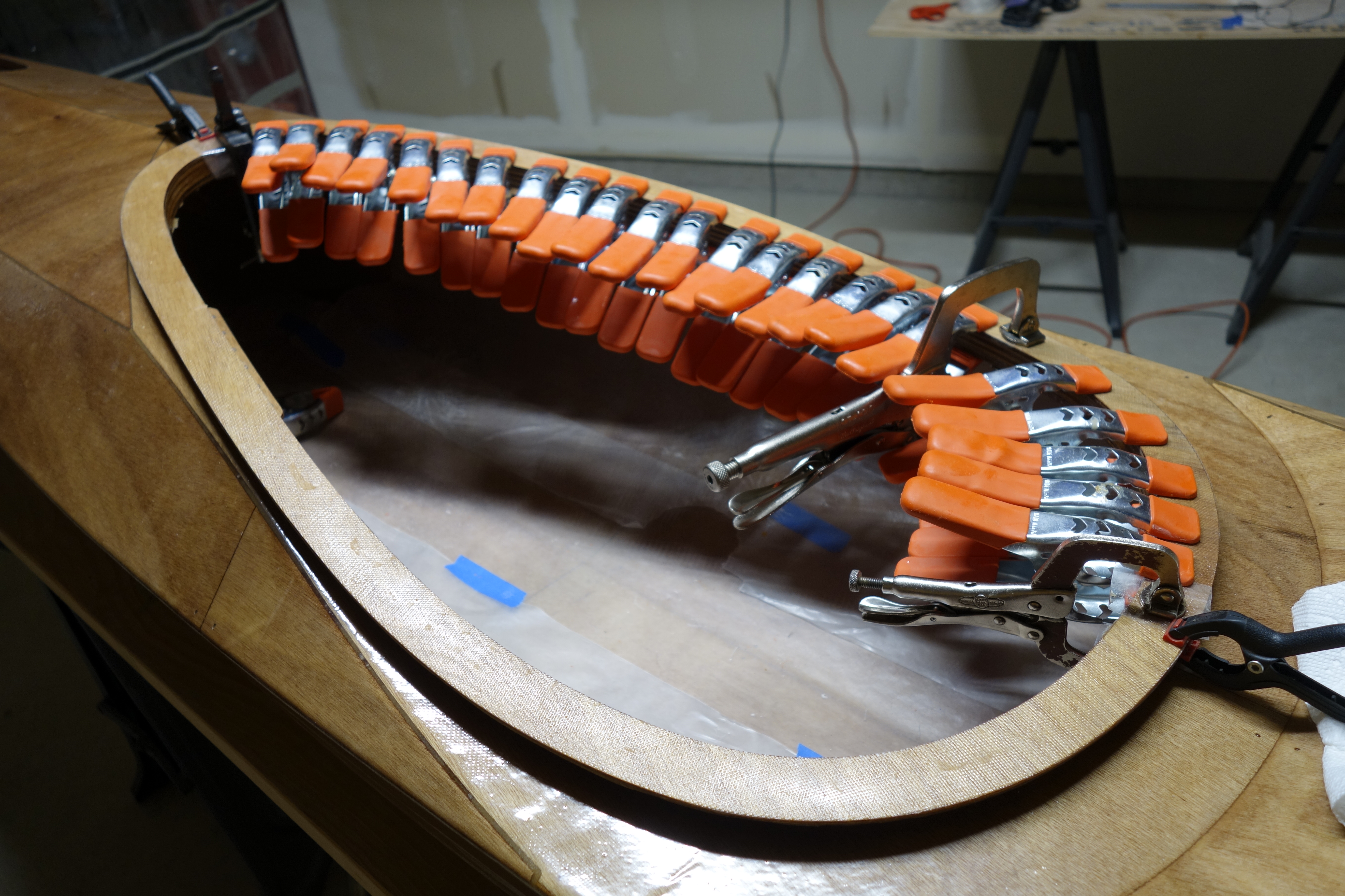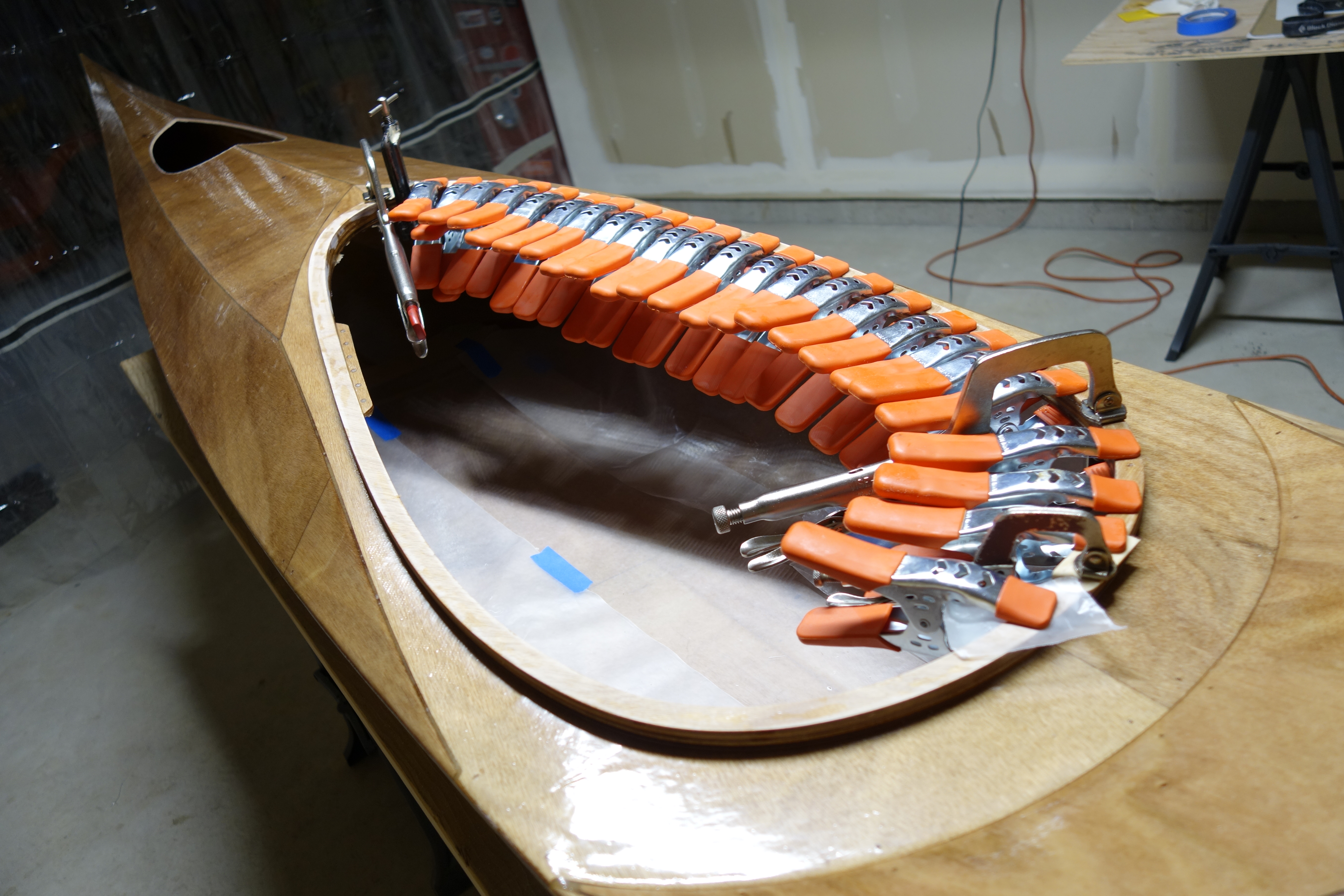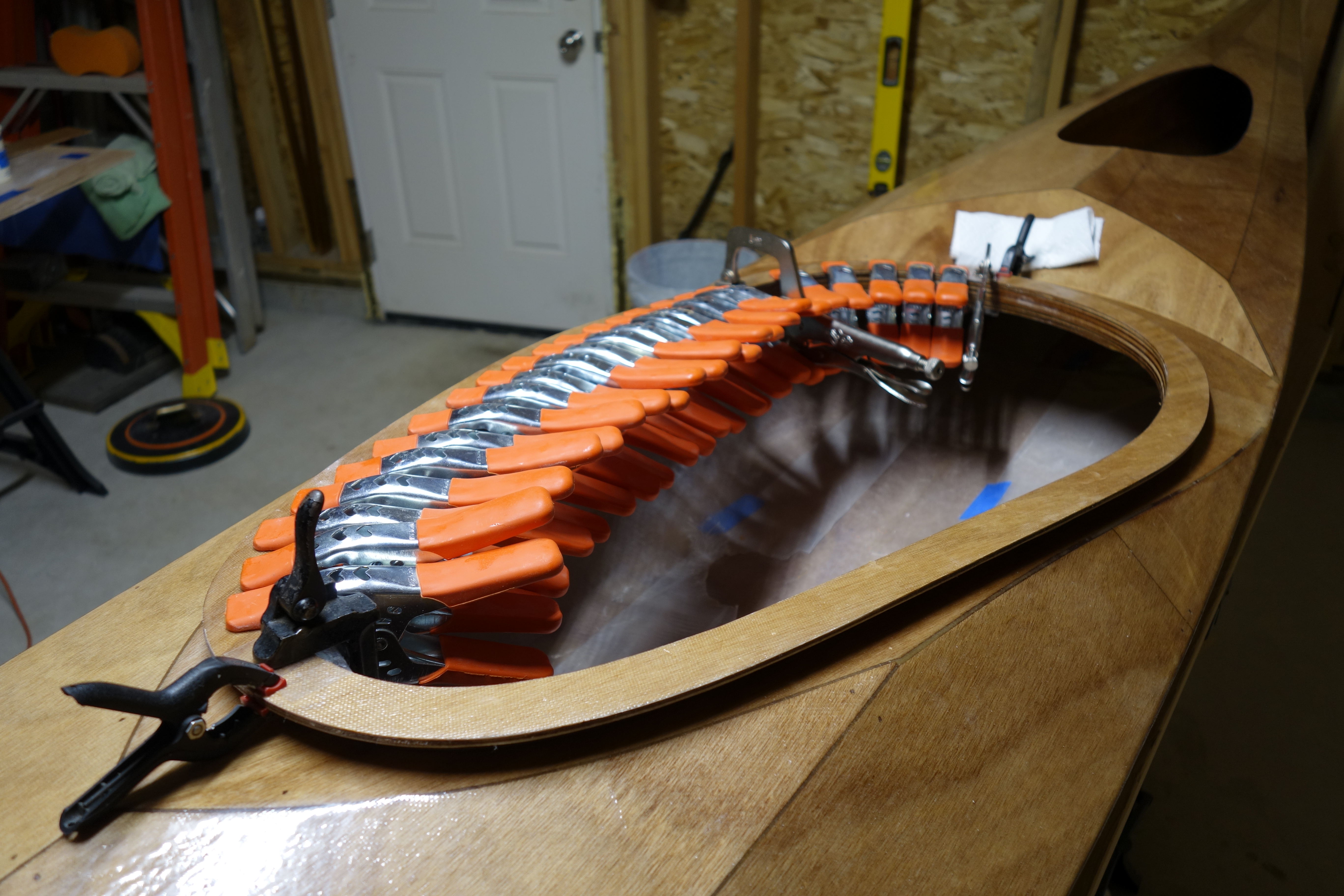 Late in the game I decided that I wanted to soften (sand down) the inner edge of the back of the cockpit coaming so that it wouldn’t bite into the small of my back when I am attempting layback rolls. When I did the final fill coat it was apparent to me that the coaming needed one more coat of epoxy in the area where I filed and sanded at the back of the cockpit. So I sanded the whole coaming and gave it all one more coat. I can still see that cut I accidentally made in the fiberglass cloth, deep under the epoxy, but I have made my peace with it. Overall, the coaming looks good I think.