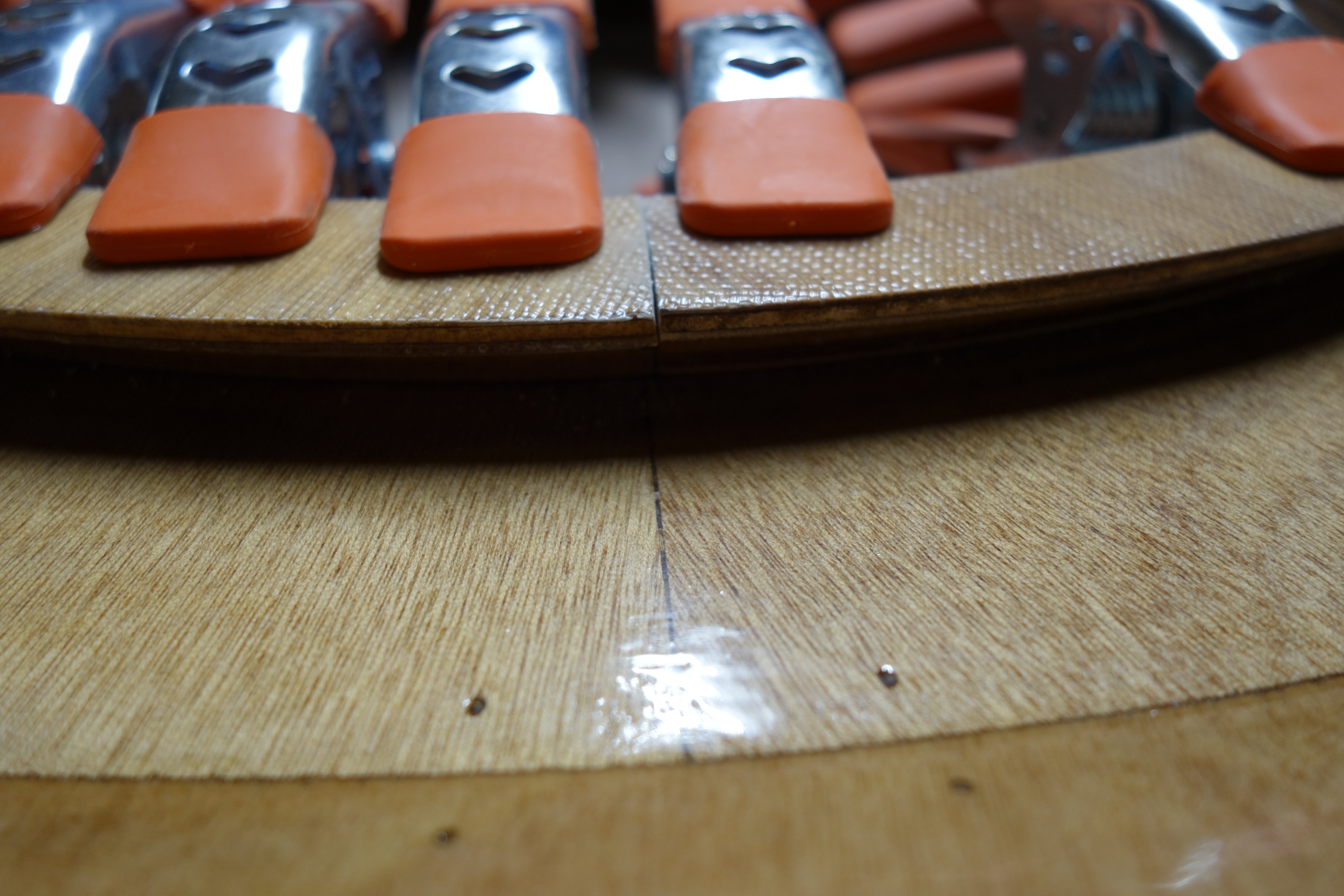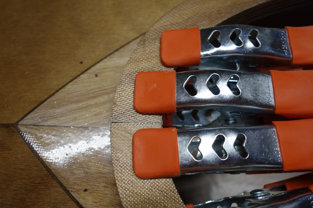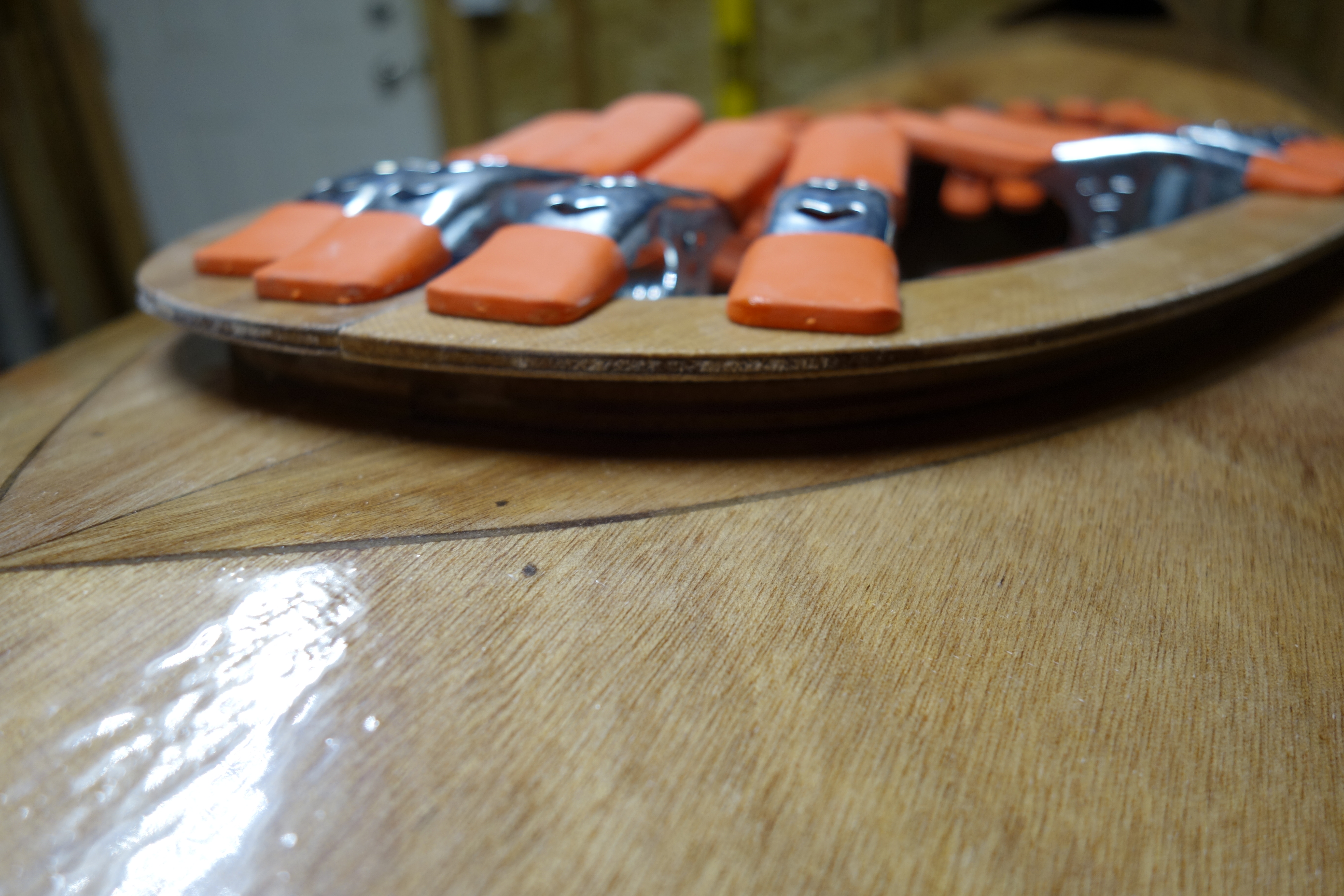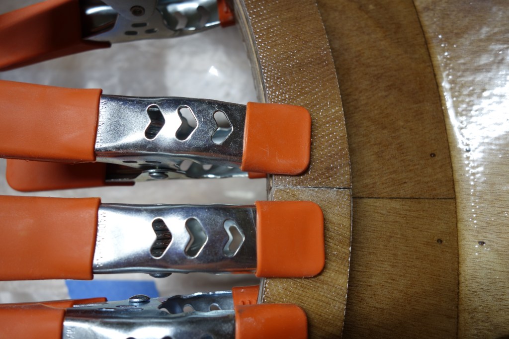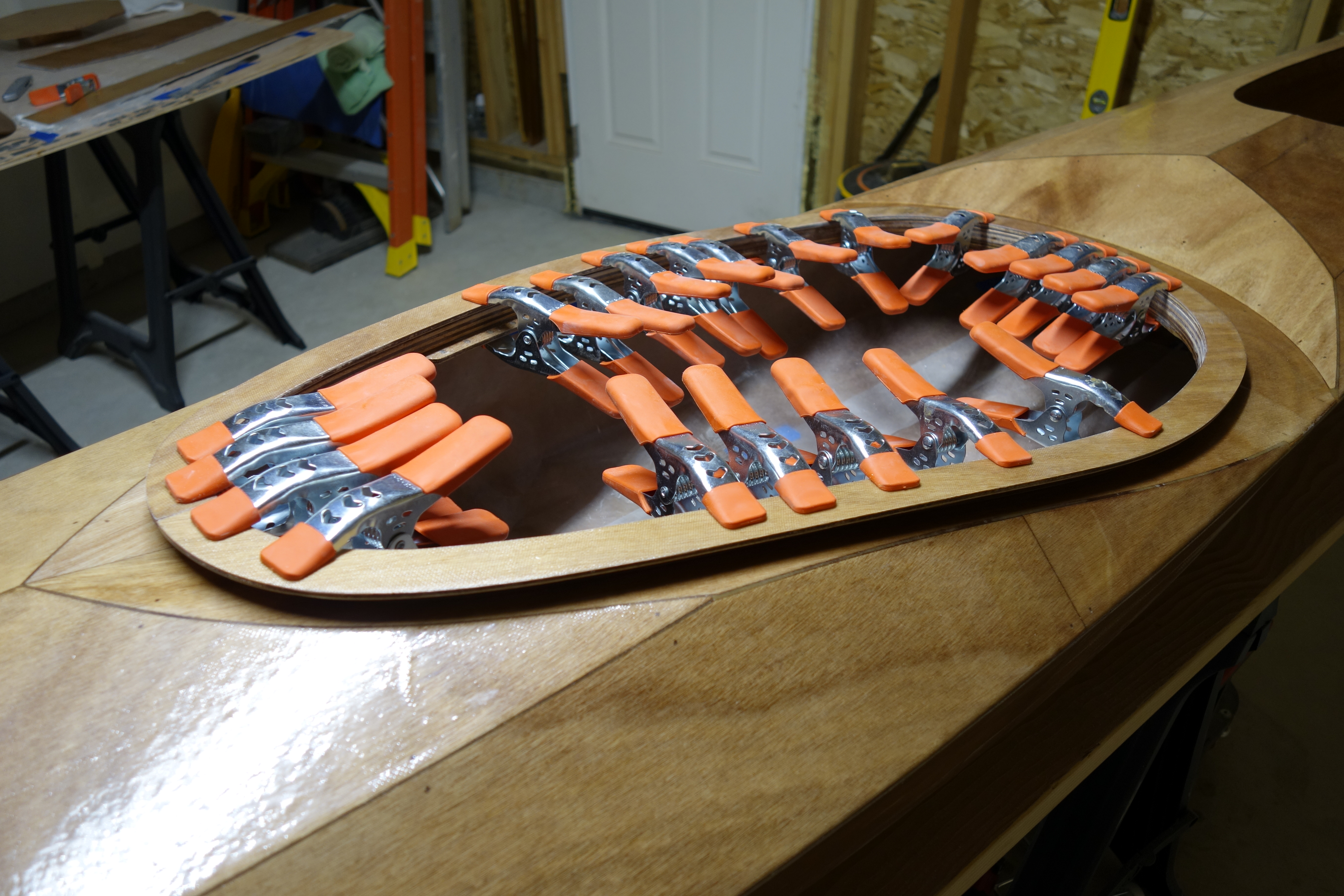 Late in the game I decided that I wanted to soften (sand down) the inner edge of the back of the cockpit coaming so that it wouldn’t bite into the small of my back when I am attempting layback rolls. When I did the final fill coat it was apparent to me that the coaming needed one more coat of epoxy in the area where I filed and sanded at the back of the cockpit. So I sanded the whole coaming and gave it all one more coat. I can still see that cut I accidentally made in the fiberglass cloth, deep under the epoxy, but I have made my peace with it. Overall, the coaming looks good I think.