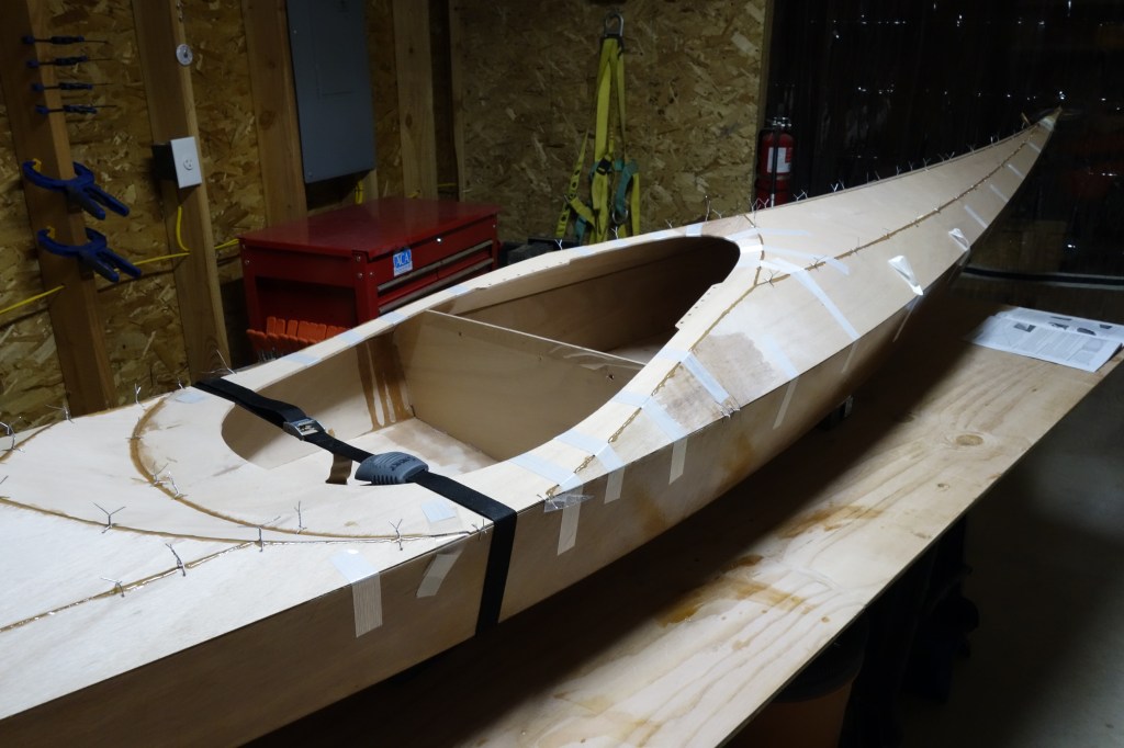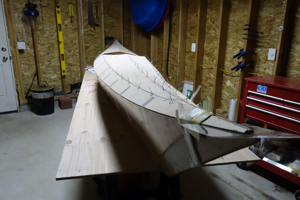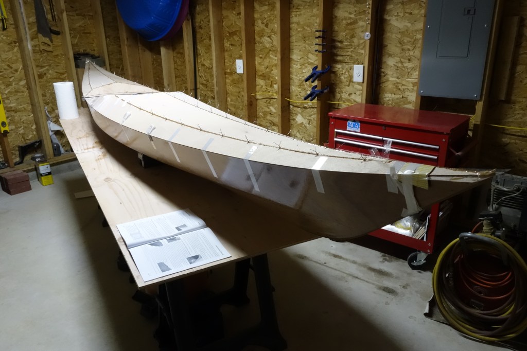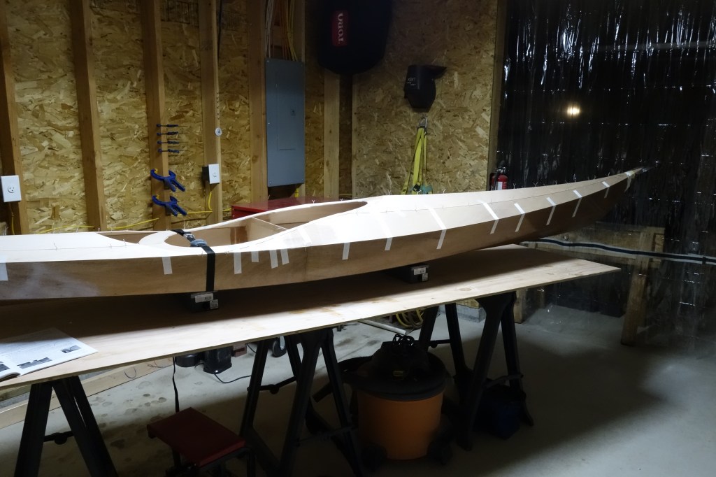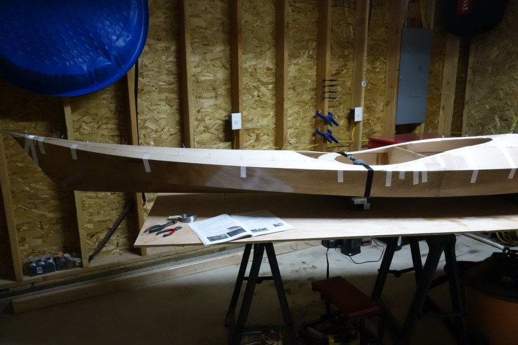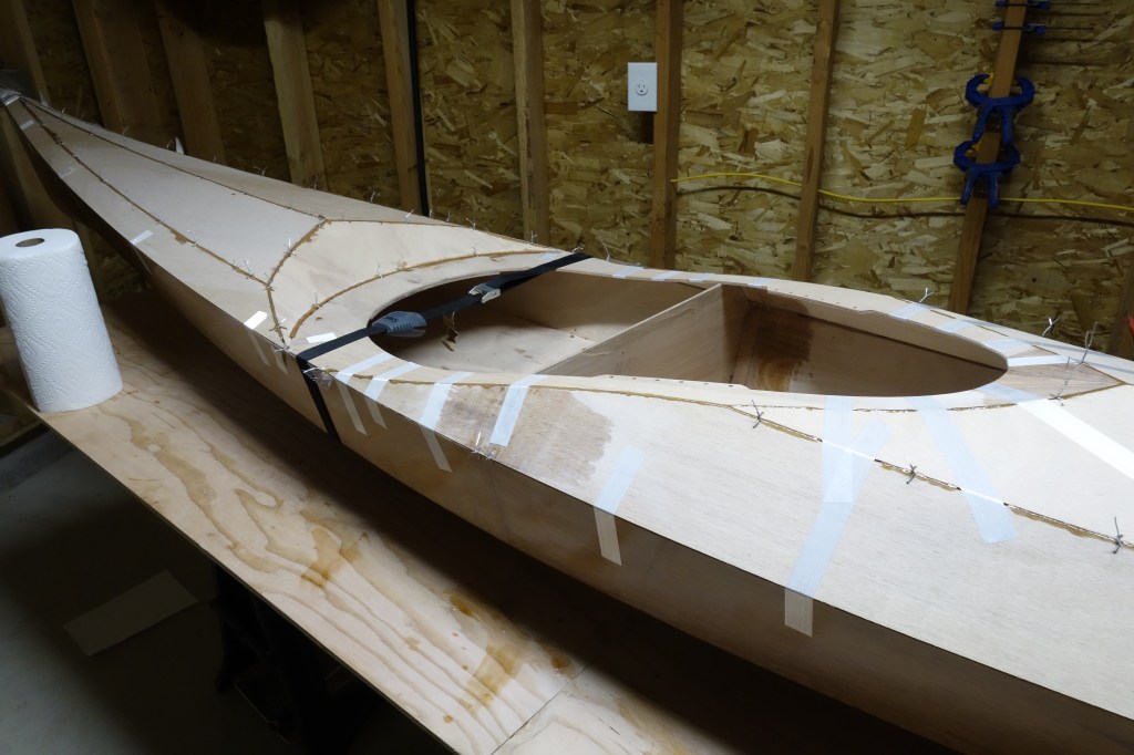 Fiberglassing the deck was more challenging for me than fiberglassing the outside of the hull was, and getting the cloth to lay down smoothly on the hull just past the shear seam required a lot of careful attention to detail and a bit of swearing. It came out fine, but it was an hour of focused intensity which I am happy that I don’t have to repeat anytime soon. I found this to be every bit as challenging as getting the fiberglass to lay down inside the hull. I can’t help but wonder if everyone has a bit of a struggle with this or if it’s just me! Oh well. It’s done, and I can move on to the fill coats and sanding. Then the cockpit coaming.