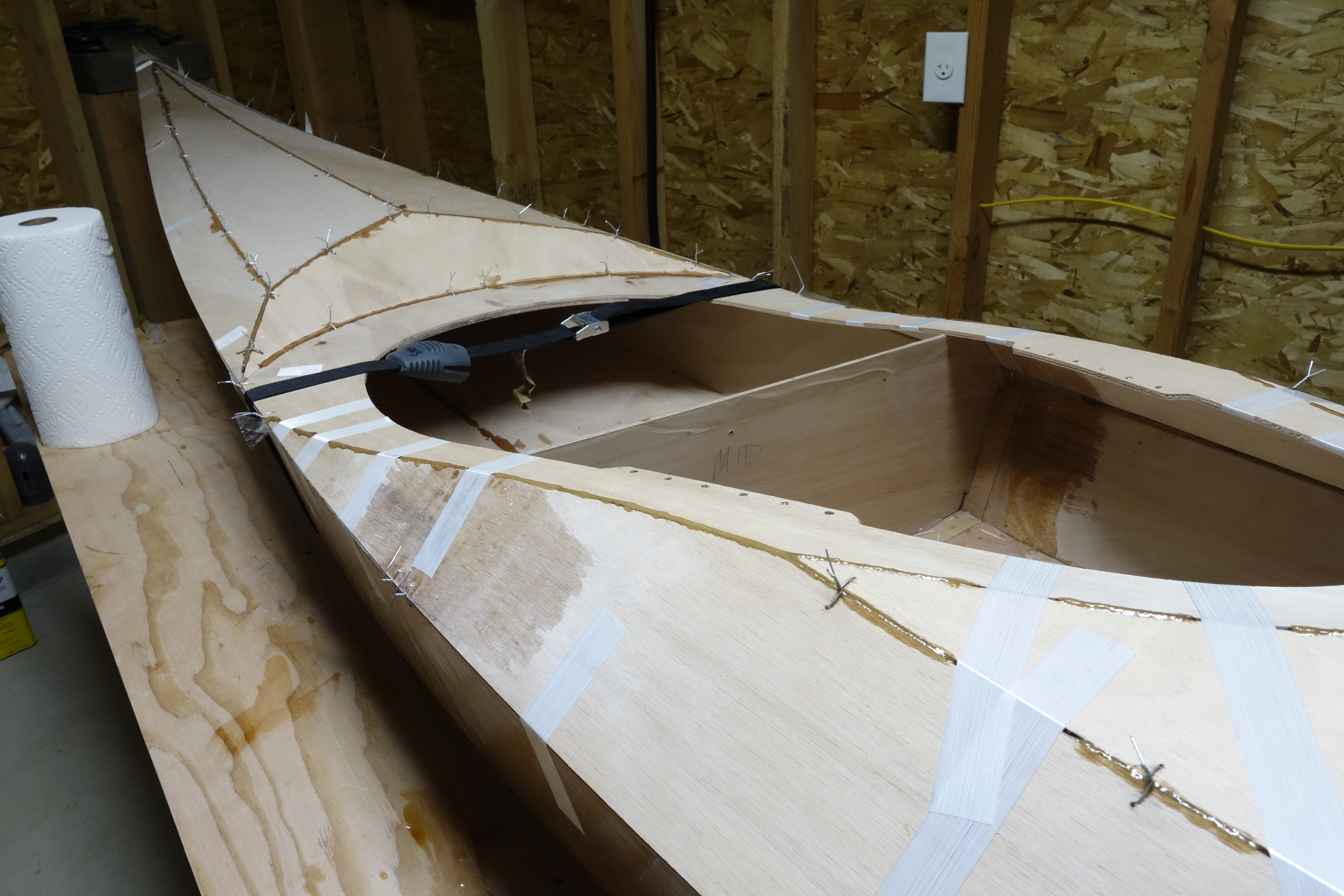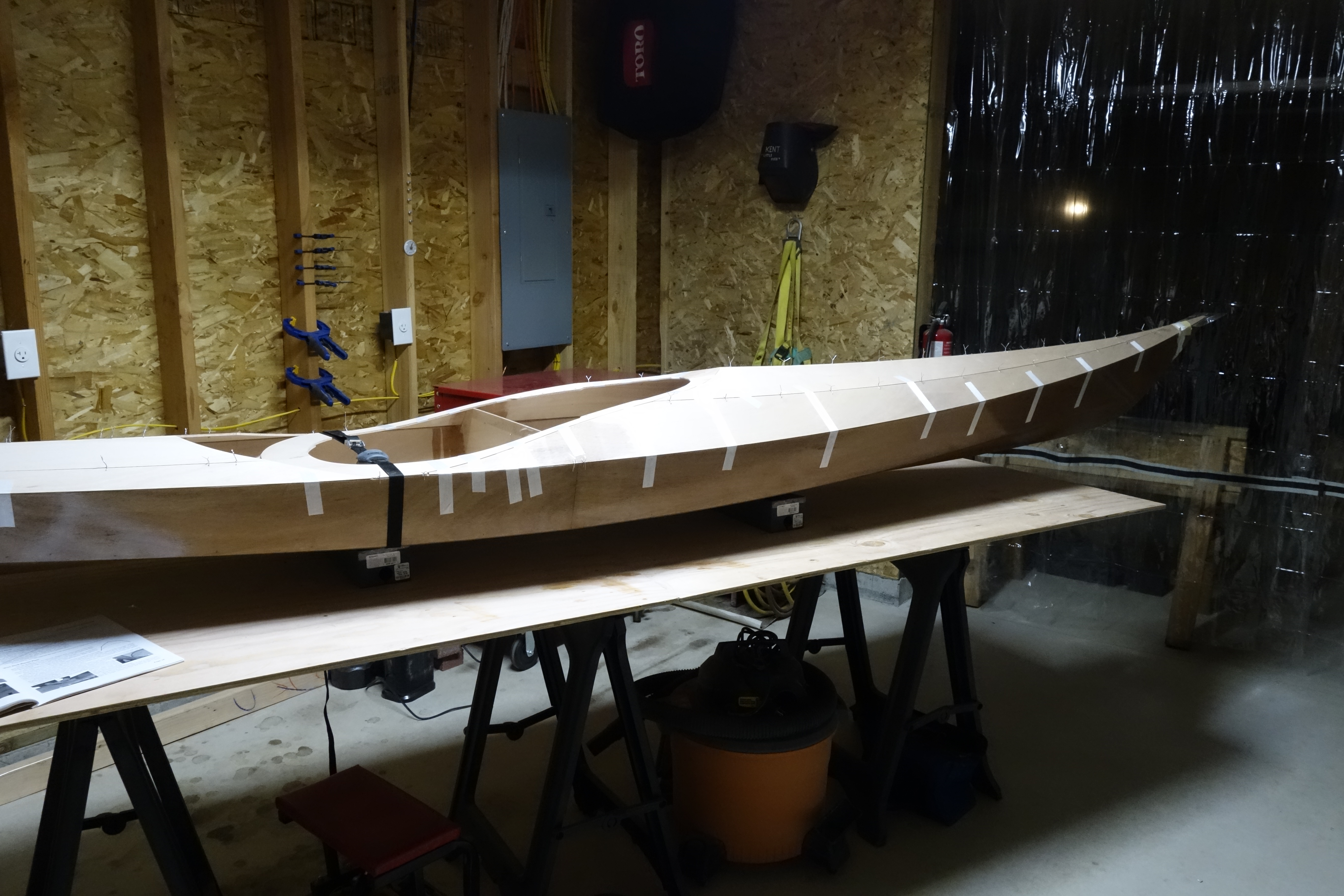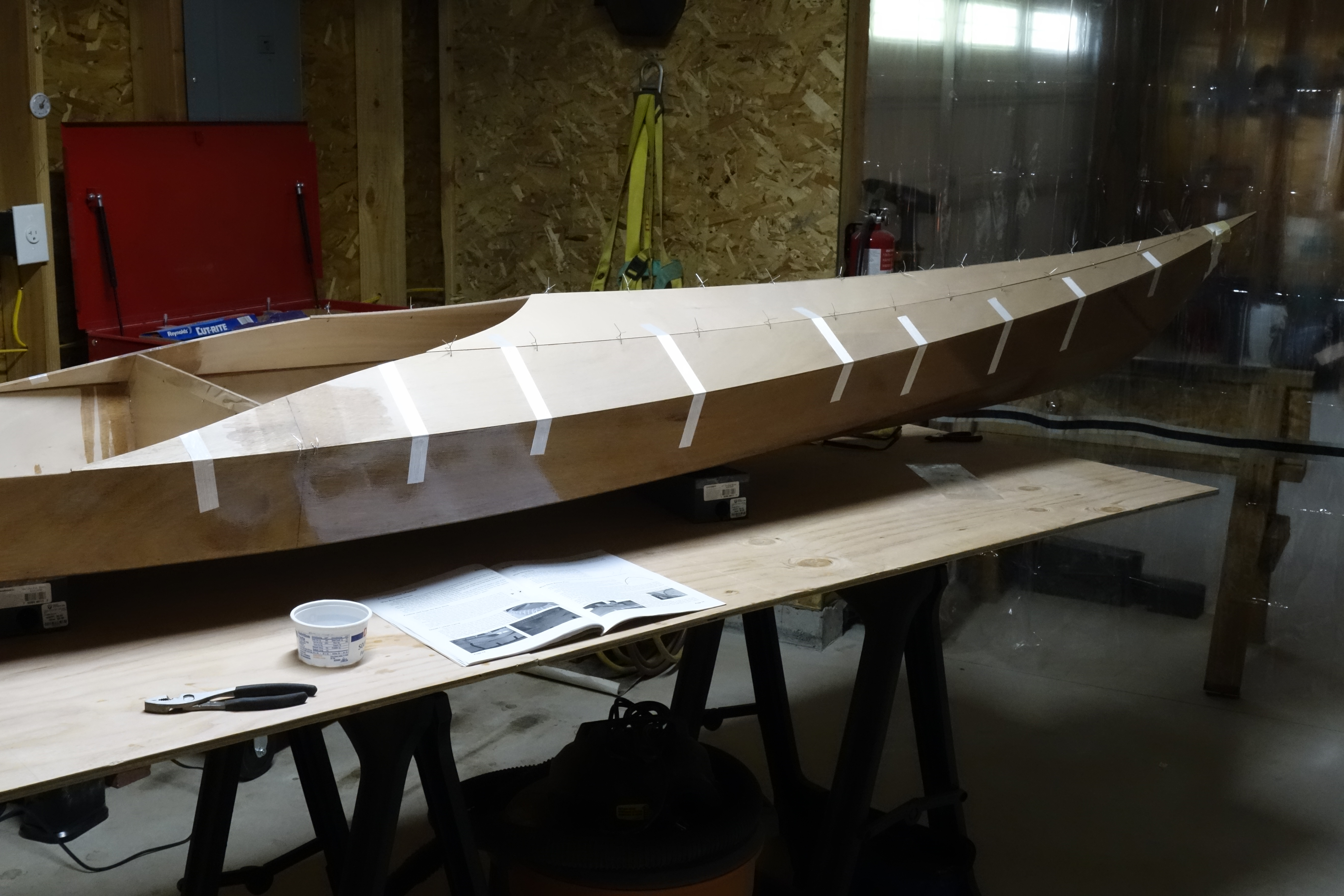 Fiberglassing the deck was more challenging for me than fiberglassing the outside of the hull was, and getting the cloth to lay down smoothly on the hull just past the shear seam required a lot of careful attention to detail and a bit of swearing. It came out fine, but it was an hour of focused intensity which I am happy that I don’t have to repeat anytime soon. I found this to be every bit as challenging as getting the fiberglass to lay down inside the hull. I can’t help but wonder if everyone has a bit of a struggle with this or if it’s just me! Oh well. It’s done, and I can move on to the fill coats and sanding. Then the cockpit coaming.