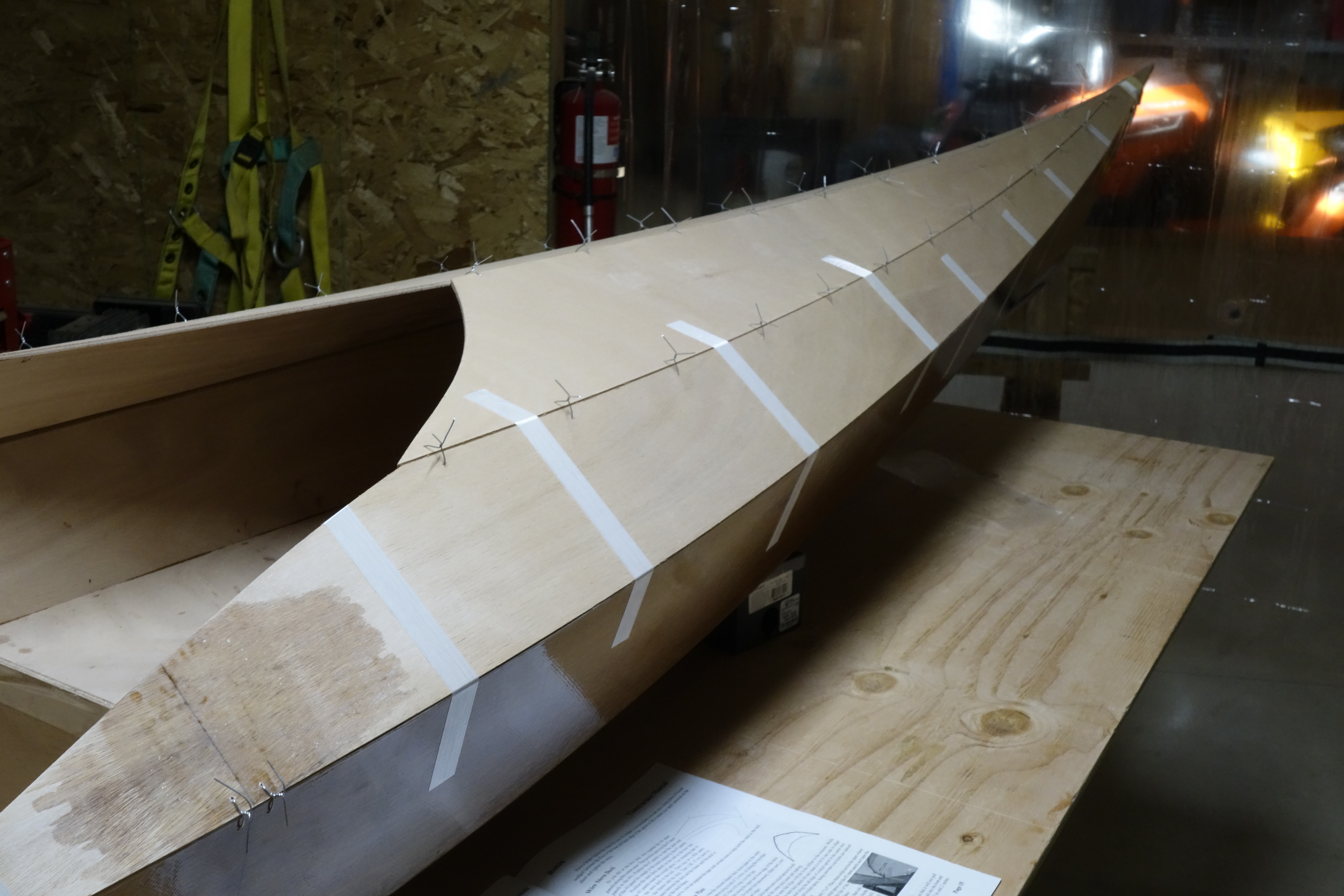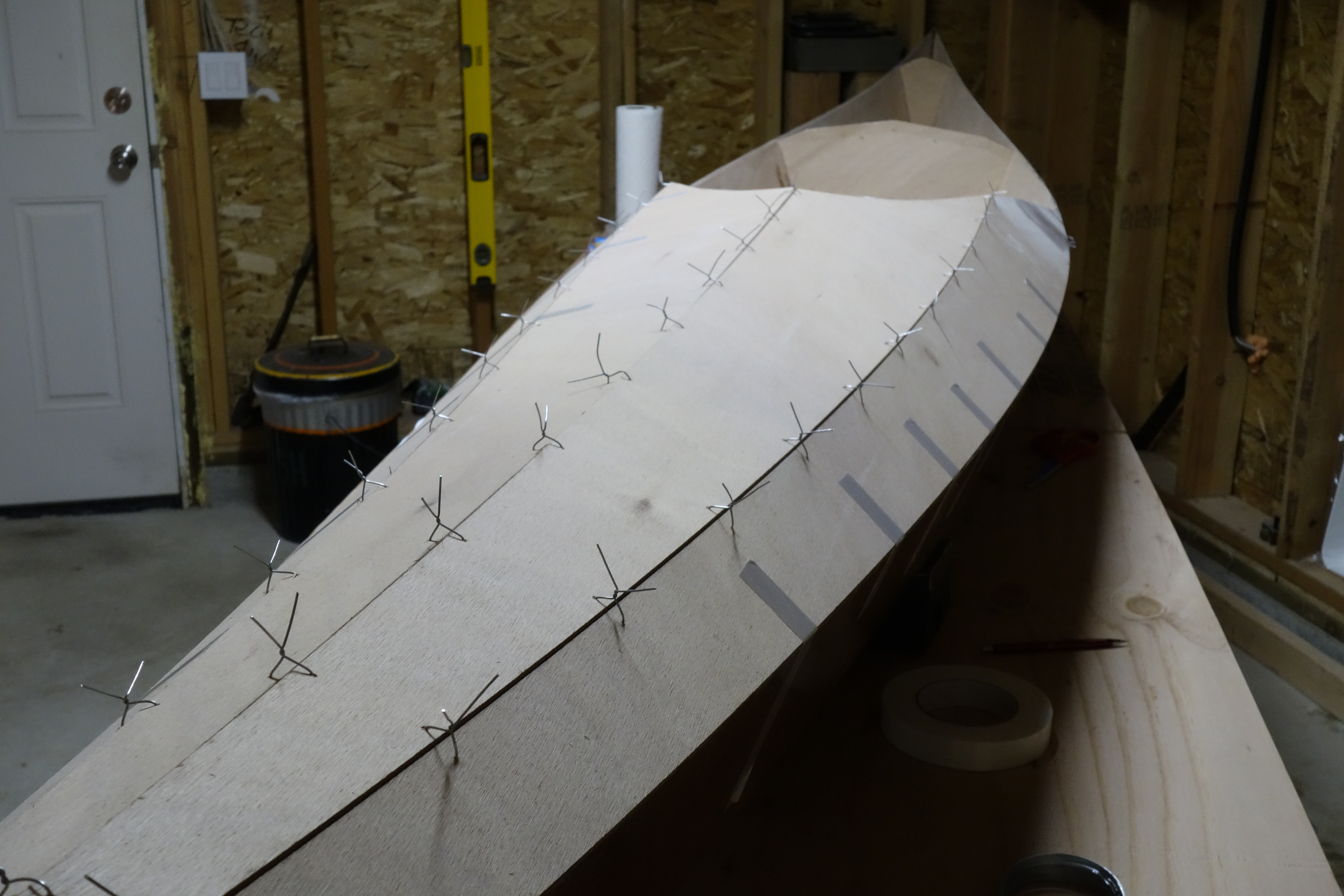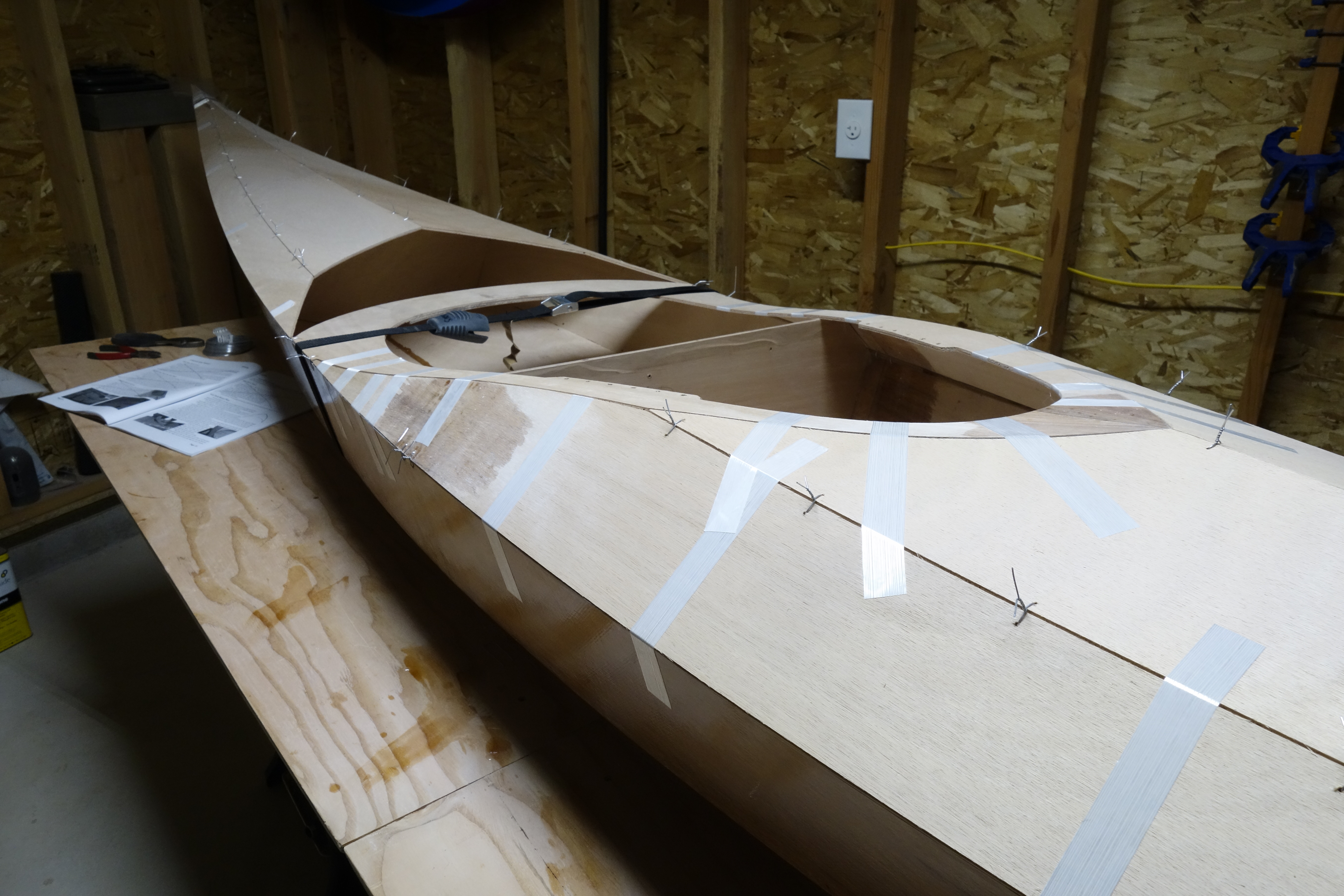 Fiberglassing the deck was more challenging for me than fiberglassing the outside of the hull was, and getting the cloth to lay down smoothly on the hull just past the shear seam required a lot of careful attention to detail and a bit of swearing. It came out fine, but it was an hour of focused intensity which I am happy that I don’t have to repeat anytime soon. I found this to be every bit as challenging as getting the fiberglass to lay down inside the hull. I can’t help but wonder if everyone has a bit of a struggle with this or if it’s just me! Oh well. It’s done, and I can move on to the fill coats and sanding. Then the cockpit coaming.