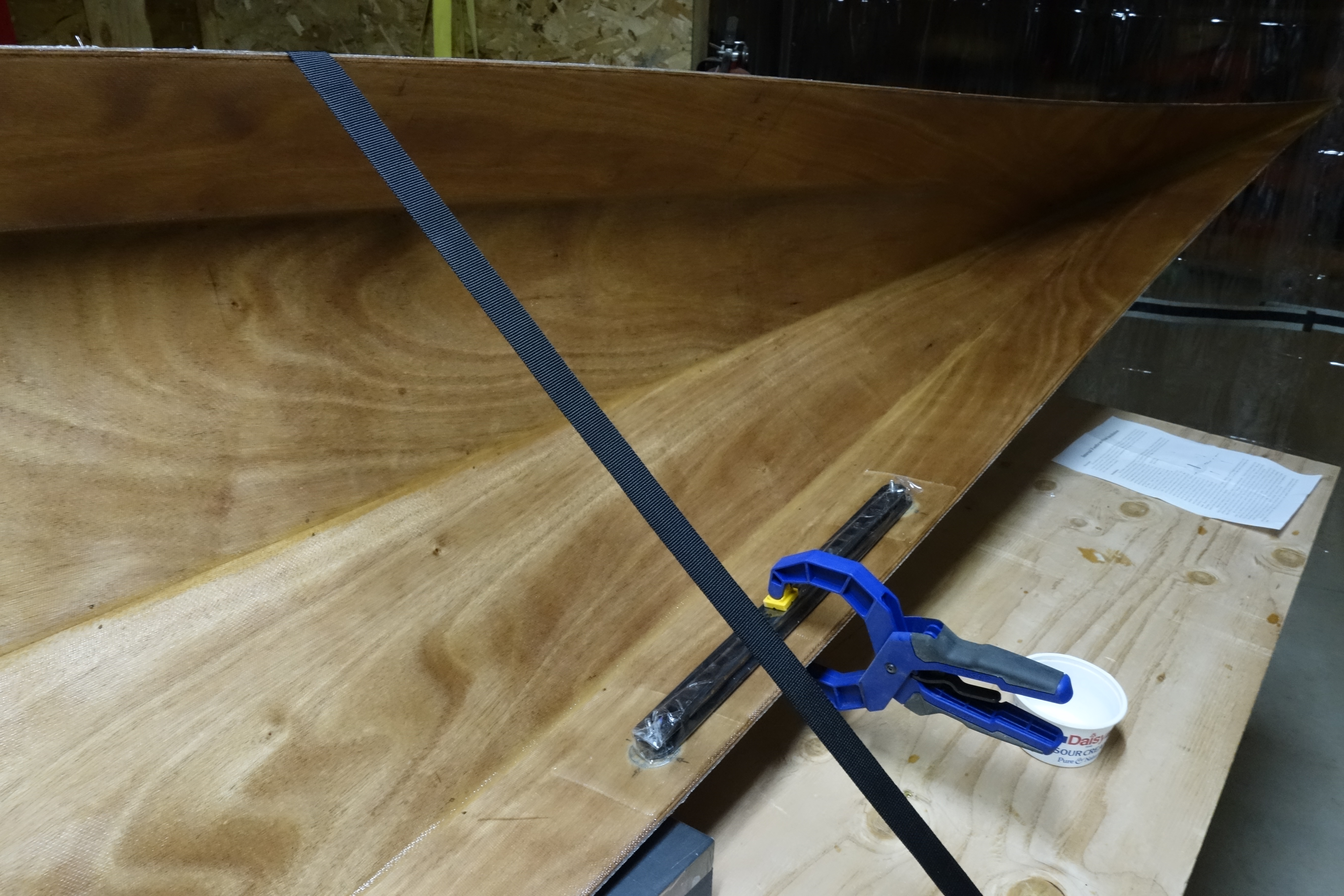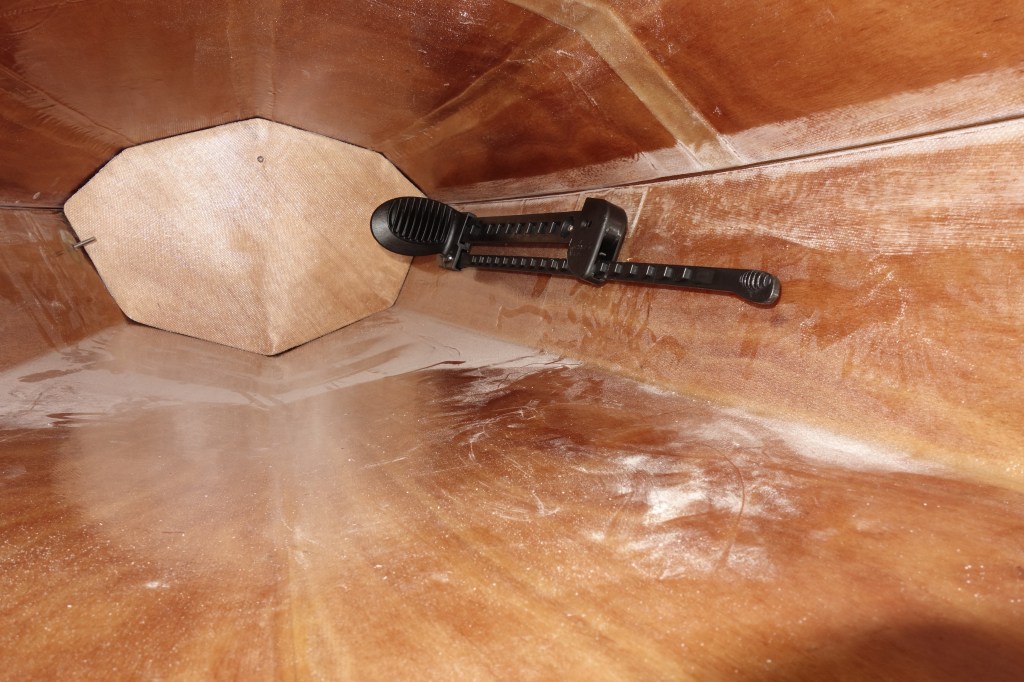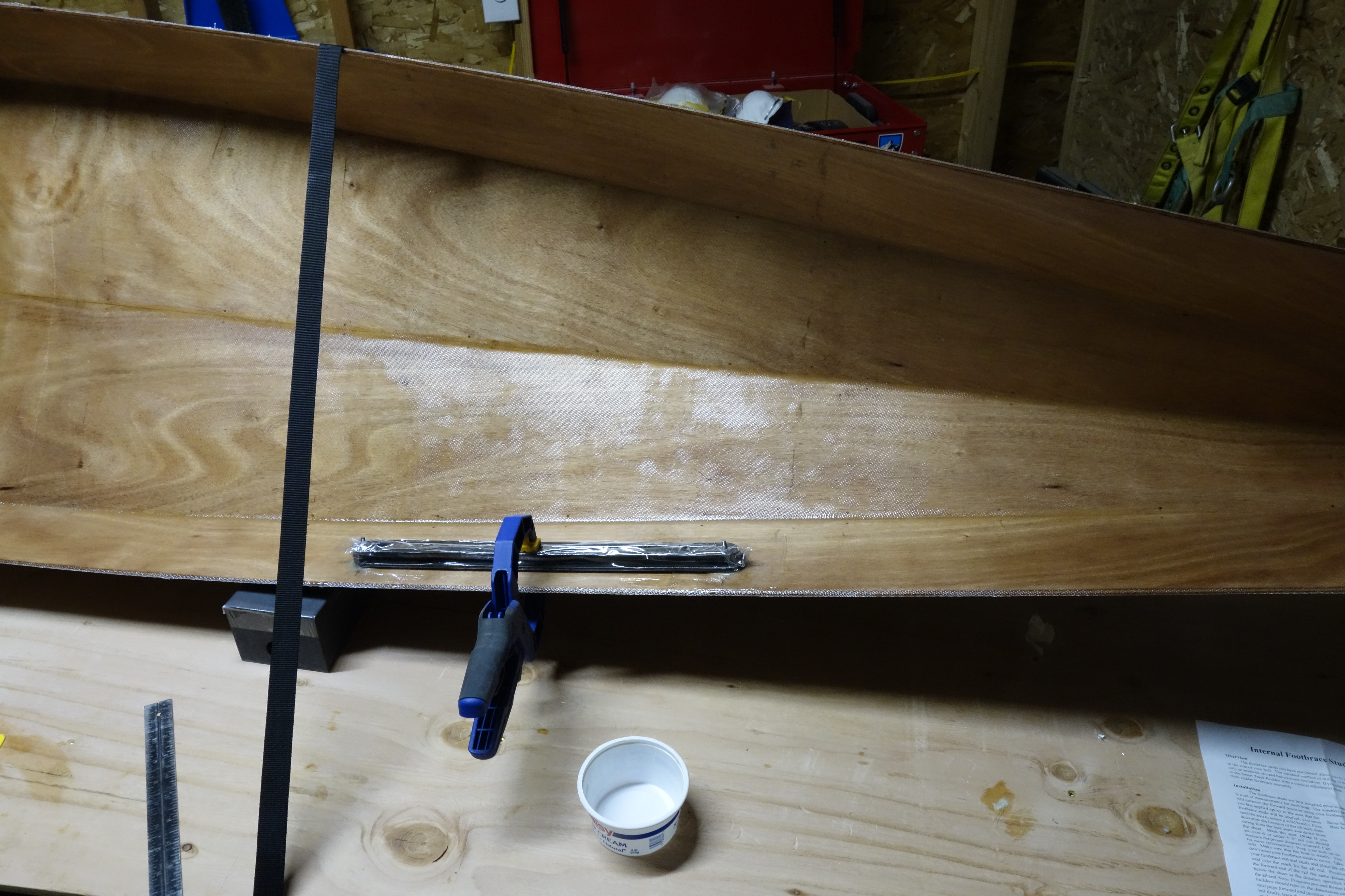 Rather than eventually drilling holes through the hull to mount the foot brace rails, Pygmy offers optional foot brace studs that are epoxied and fiberglassed to the inside of the hull during hull construction (as seen here). Not only is this aesthetically pleasing, it saves work in the future when the hull needs to be re-varnished because if the foot brace rails were held on by screws that went through the hull, the screws would have to be removed prior to sanding/re-varnishing, etc.