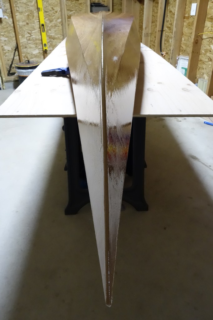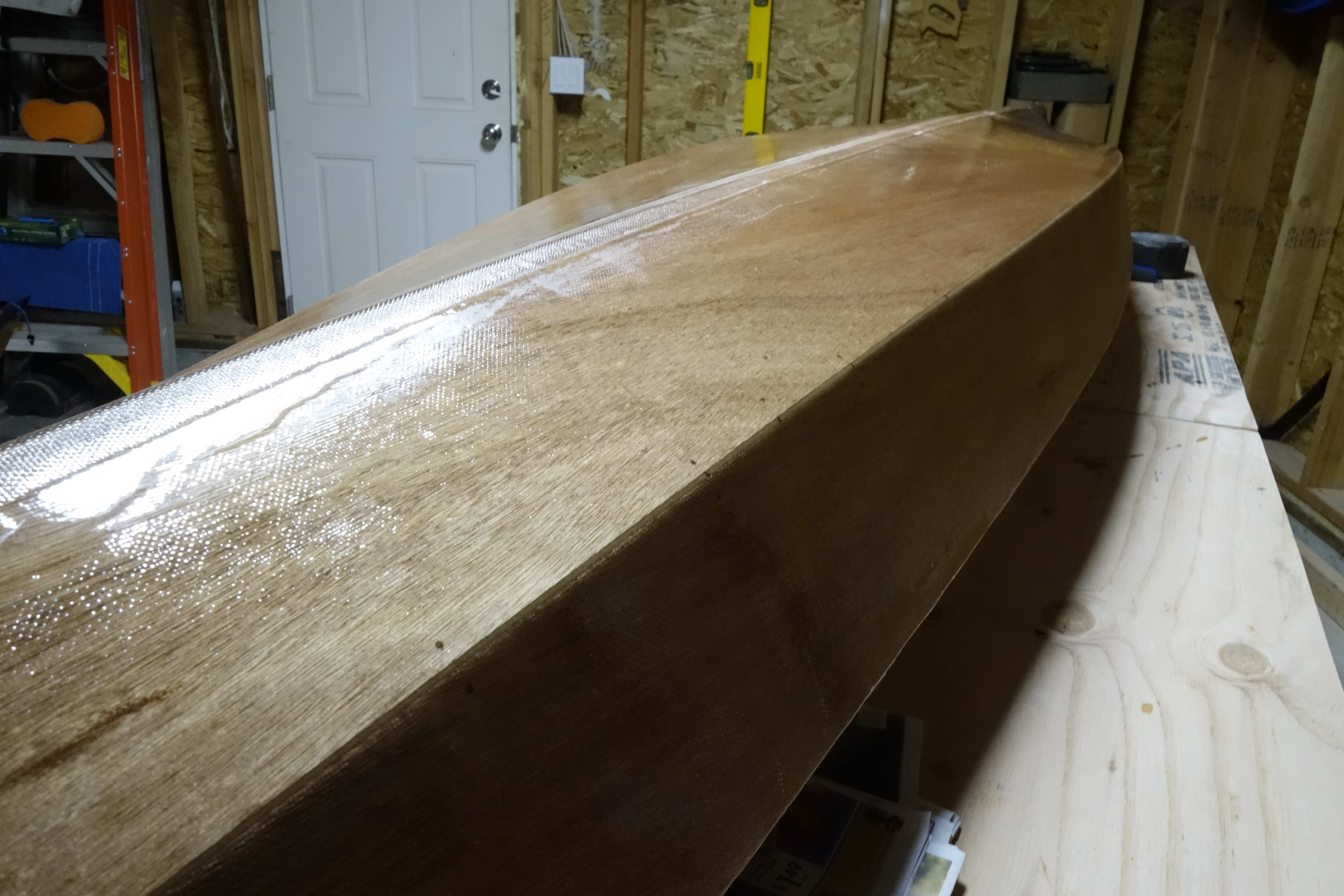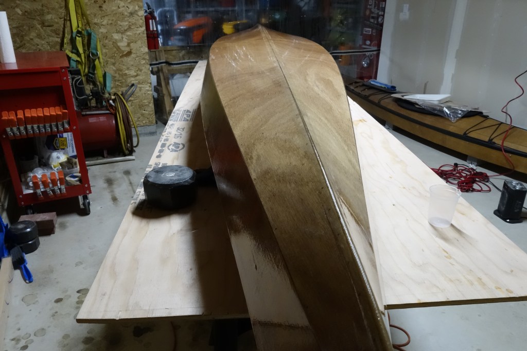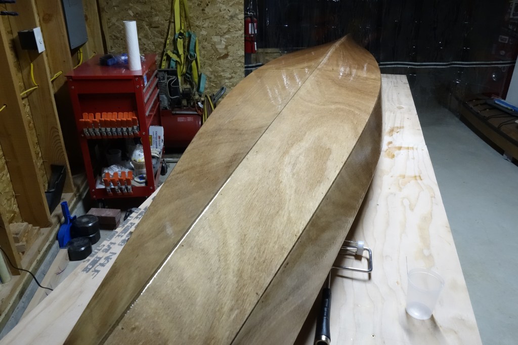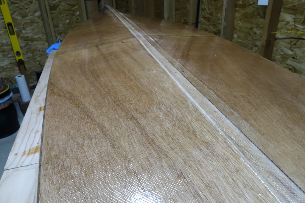 The hull will get three fill coats of epoxy. It will also get a sacrificial strip of fiberglass tape that will run the length of the hull and most of the way up the bow and stern stems. This tape will provide protection to the keel of the kayak when beaching the boat on sandy or rocky shores. This strip will get replaced/renewed every few years when the kayak gets refinished.
