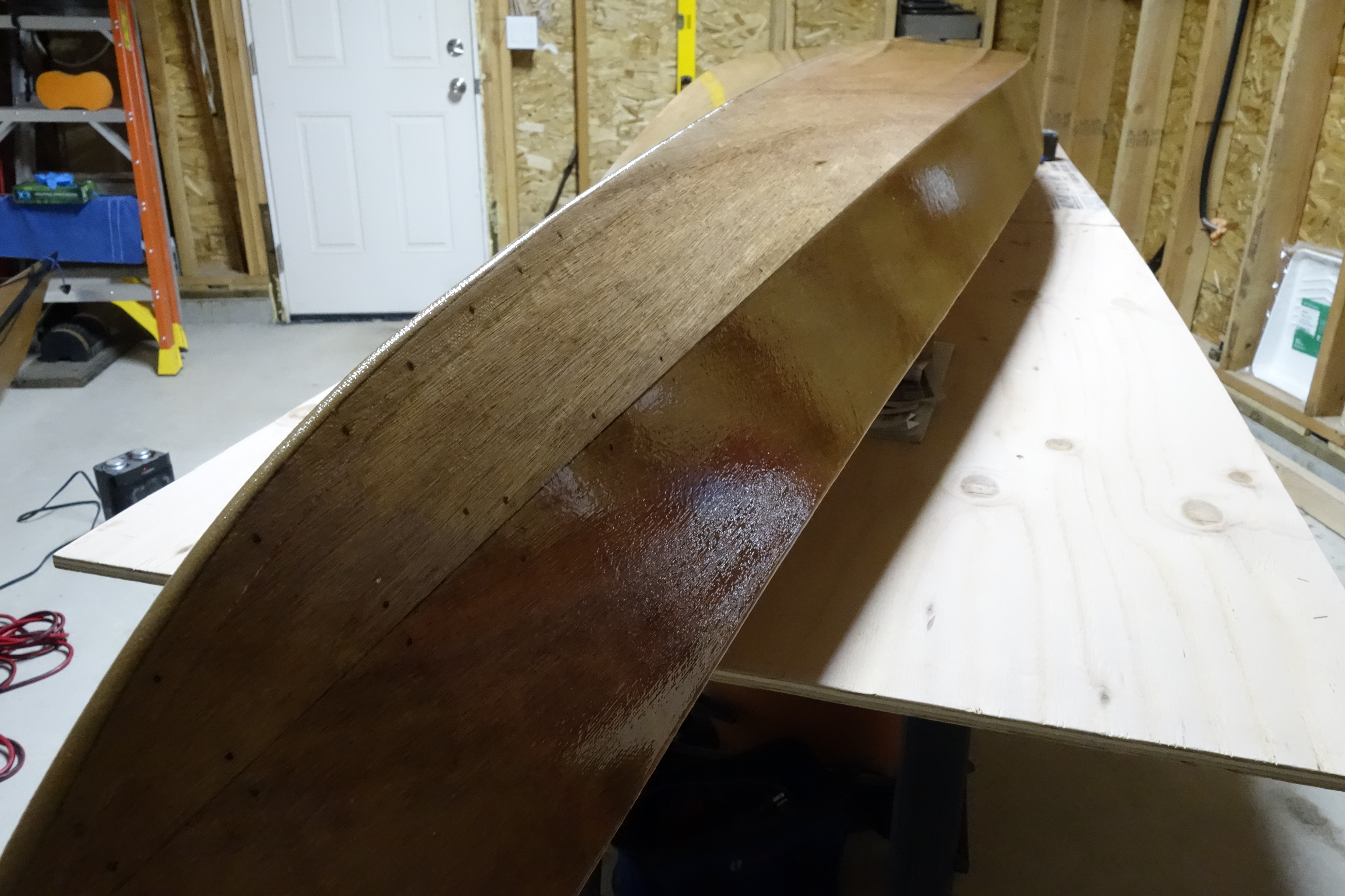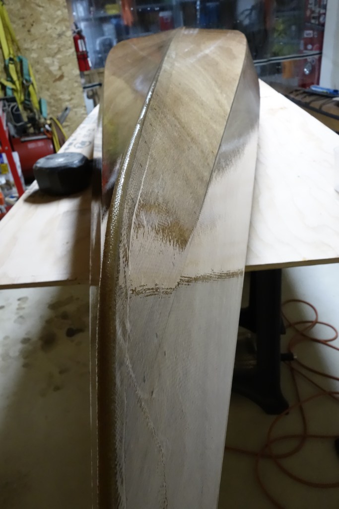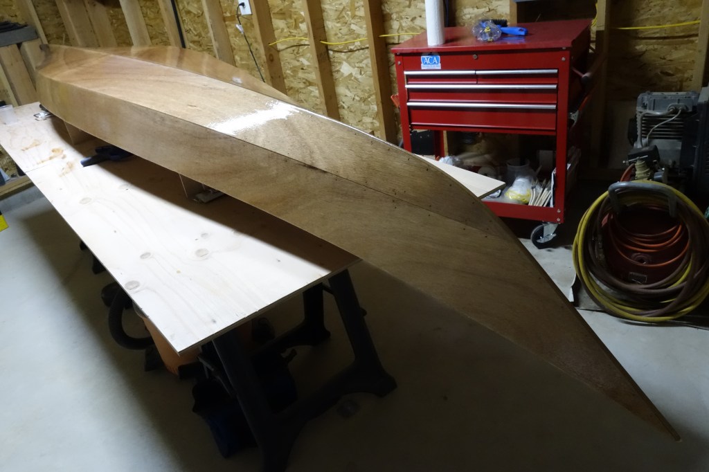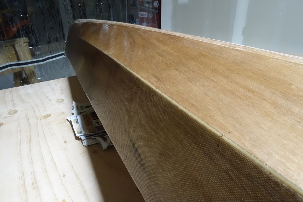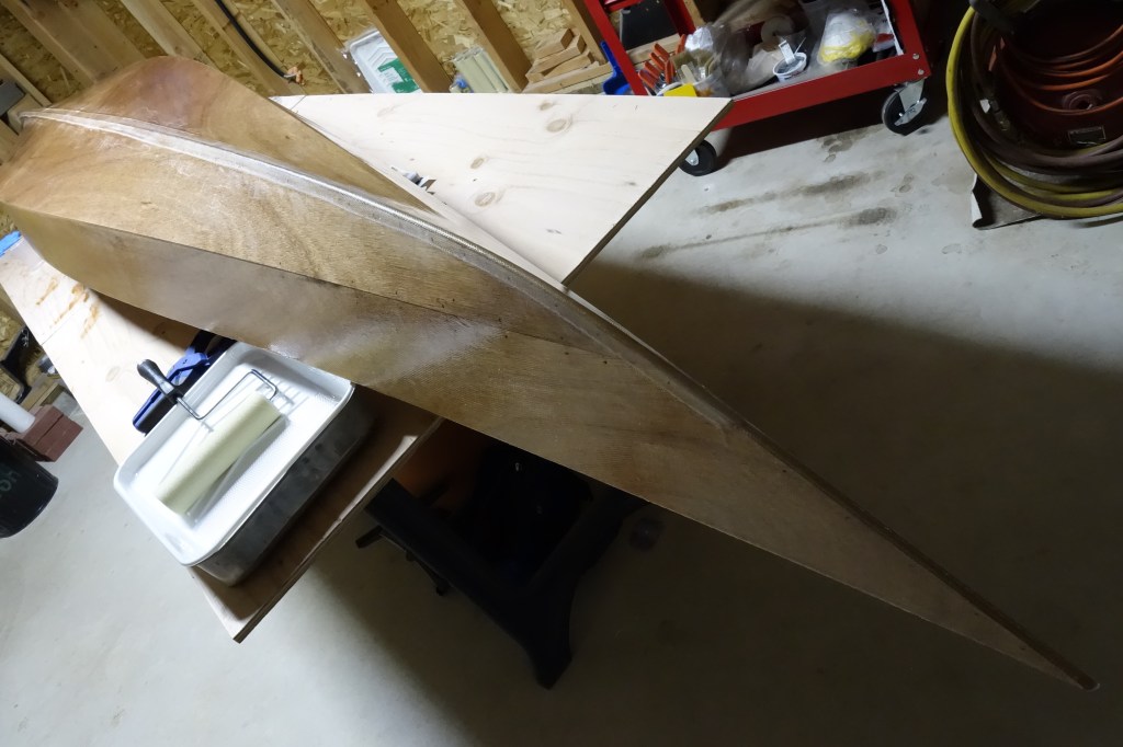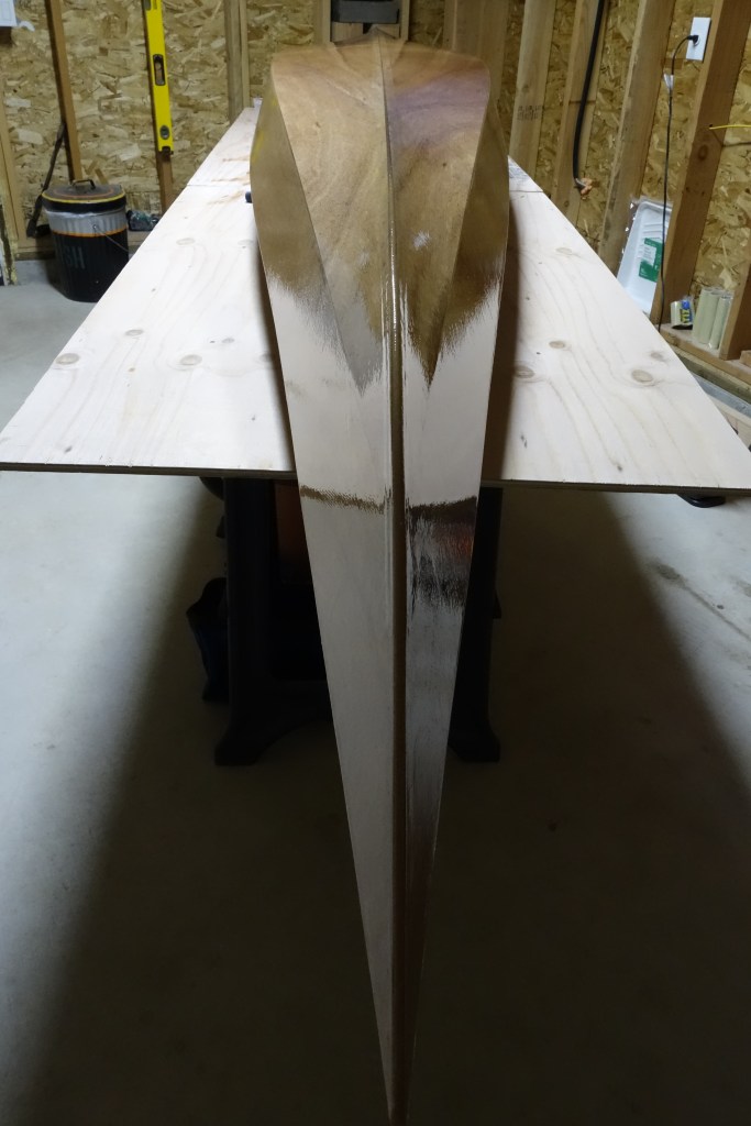 The hull will get three fill coats of epoxy. It will also get a sacrificial strip of fiberglass tape that will run the length of the hull and most of the way up the bow and stern stems. This tape will provide protection to the keel of the kayak when beaching the boat on sandy or rocky shores. This strip will get replaced/renewed every few years when the kayak gets refinished.