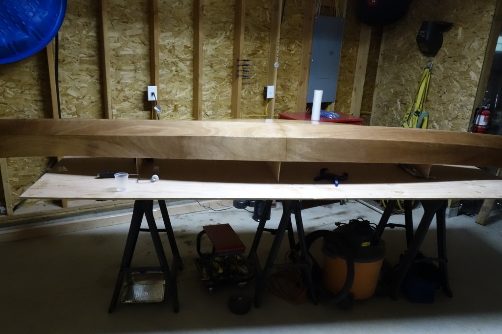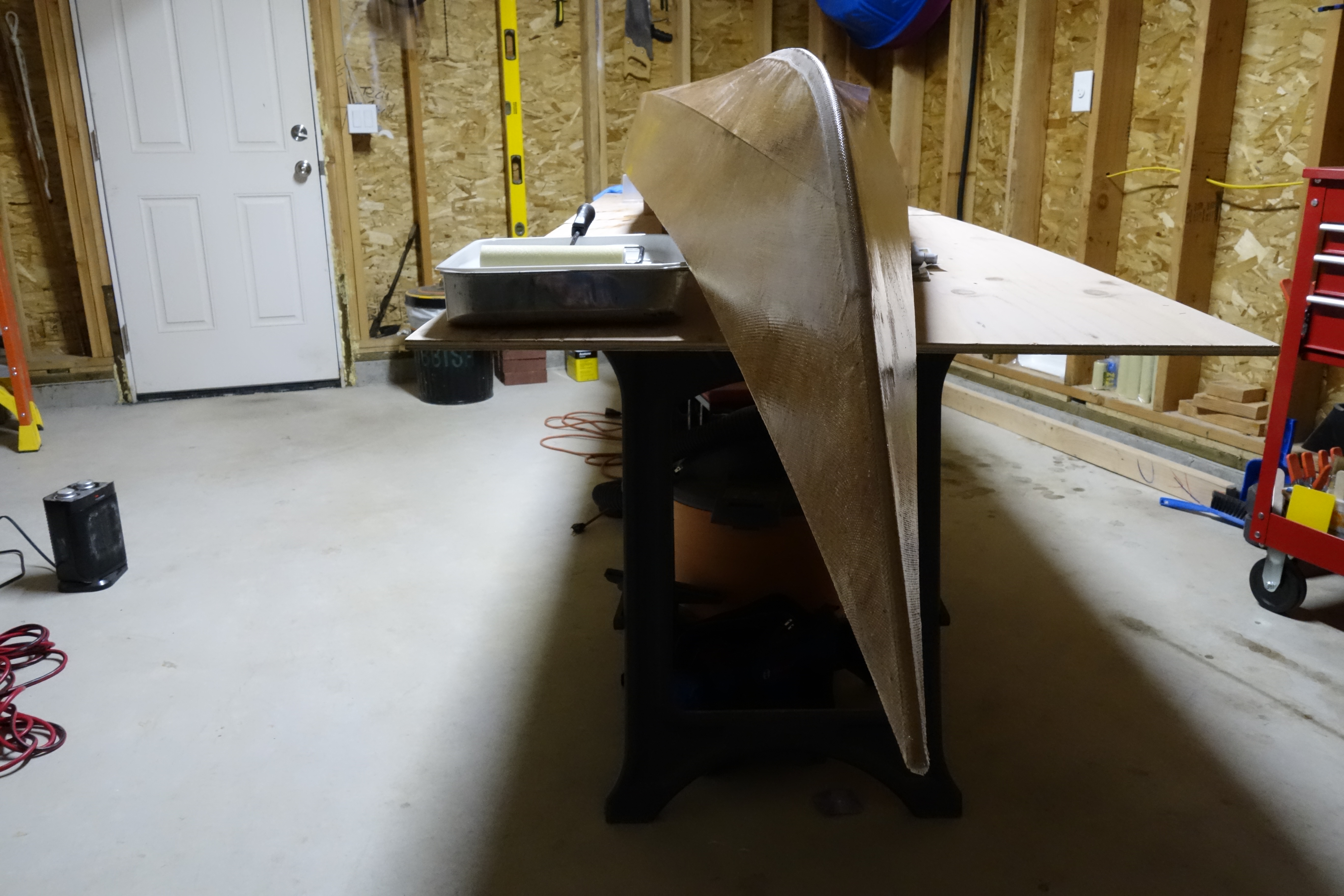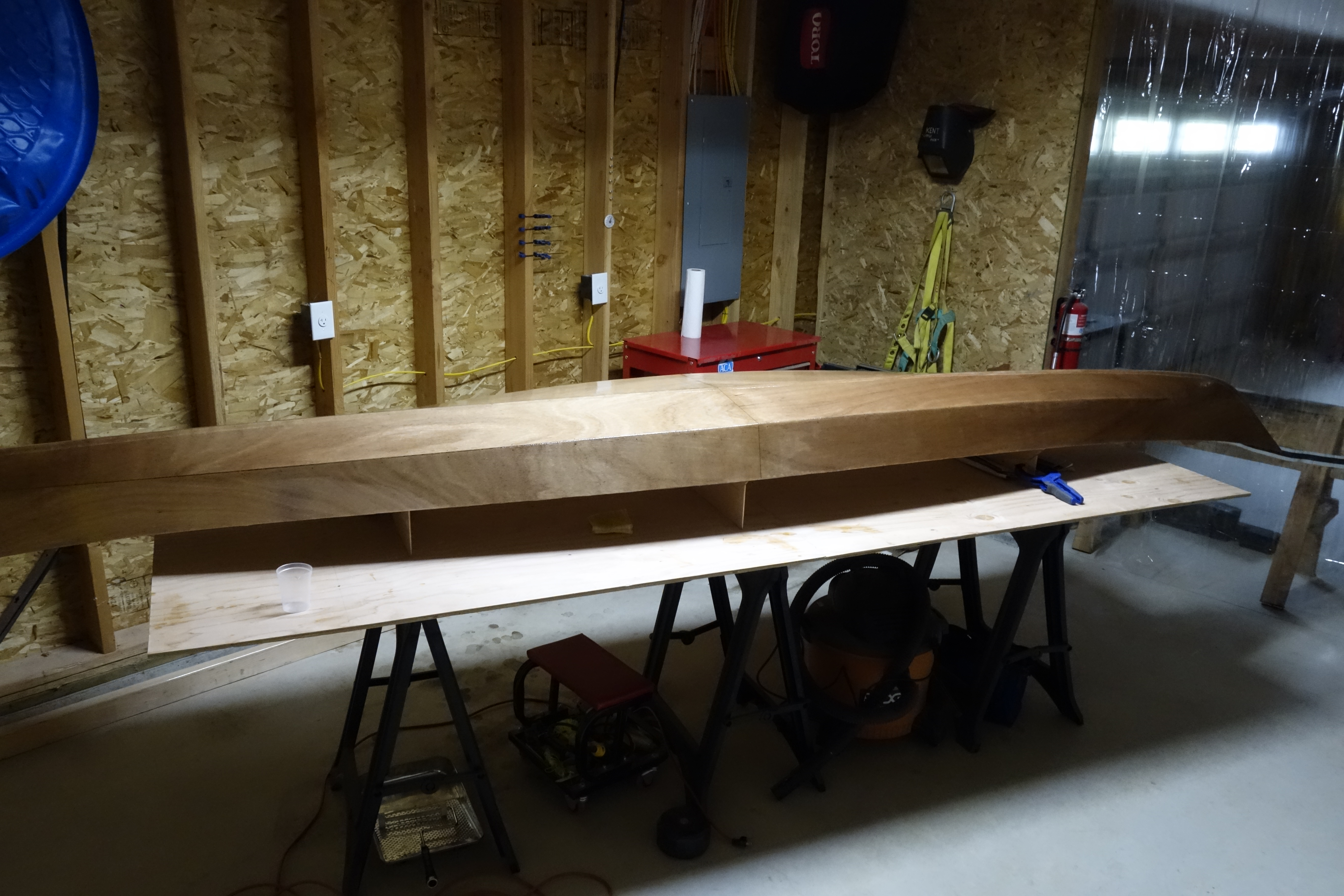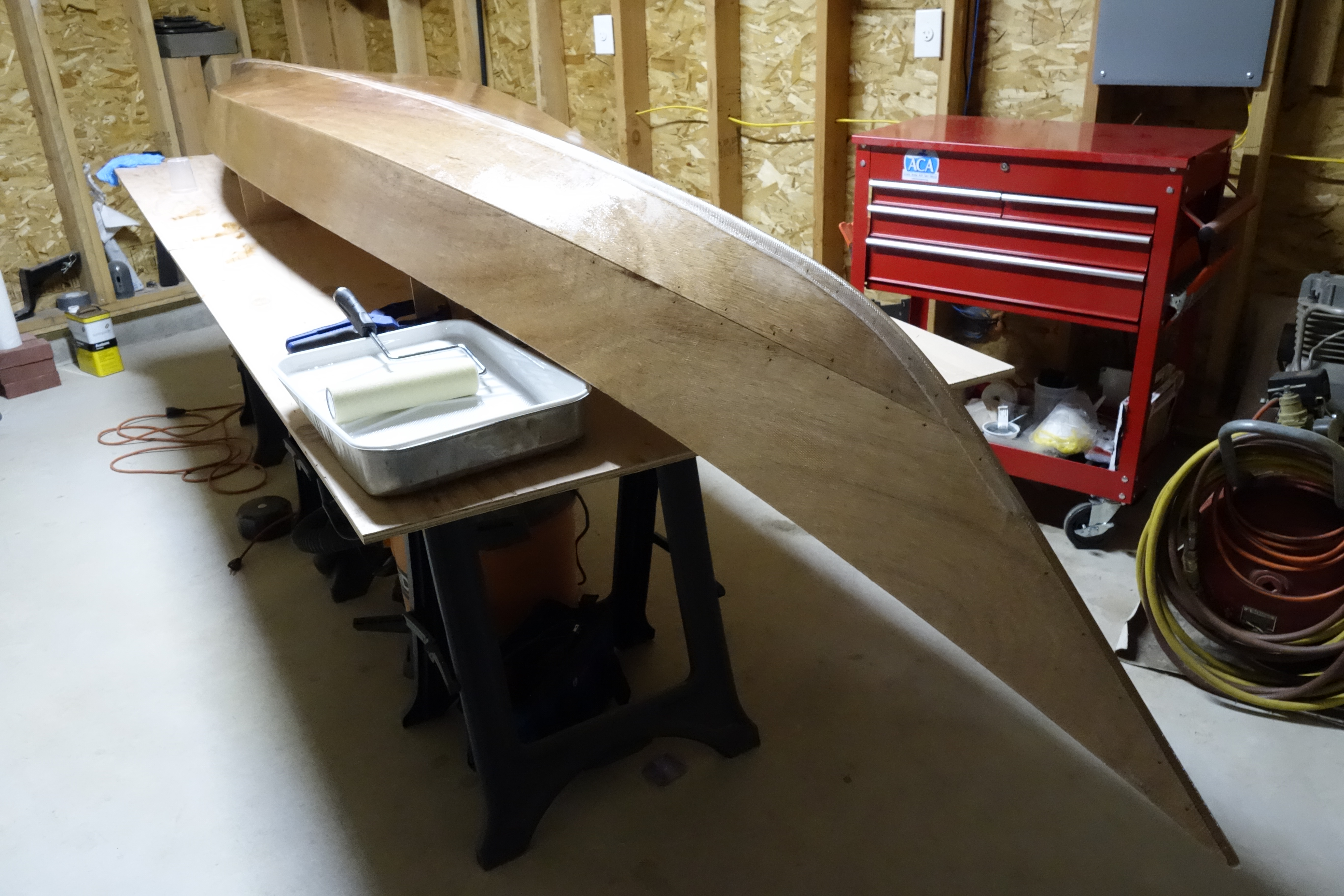 The hull will get three fill coats of epoxy. It will also get a sacrificial strip of fiberglass tape that will run the length of the hull and most of the way up the bow and stern stems. This tape will provide protection to the keel of the kayak when beaching the boat on sandy or rocky shores. This strip will get replaced/renewed every few years when the kayak gets refinished.