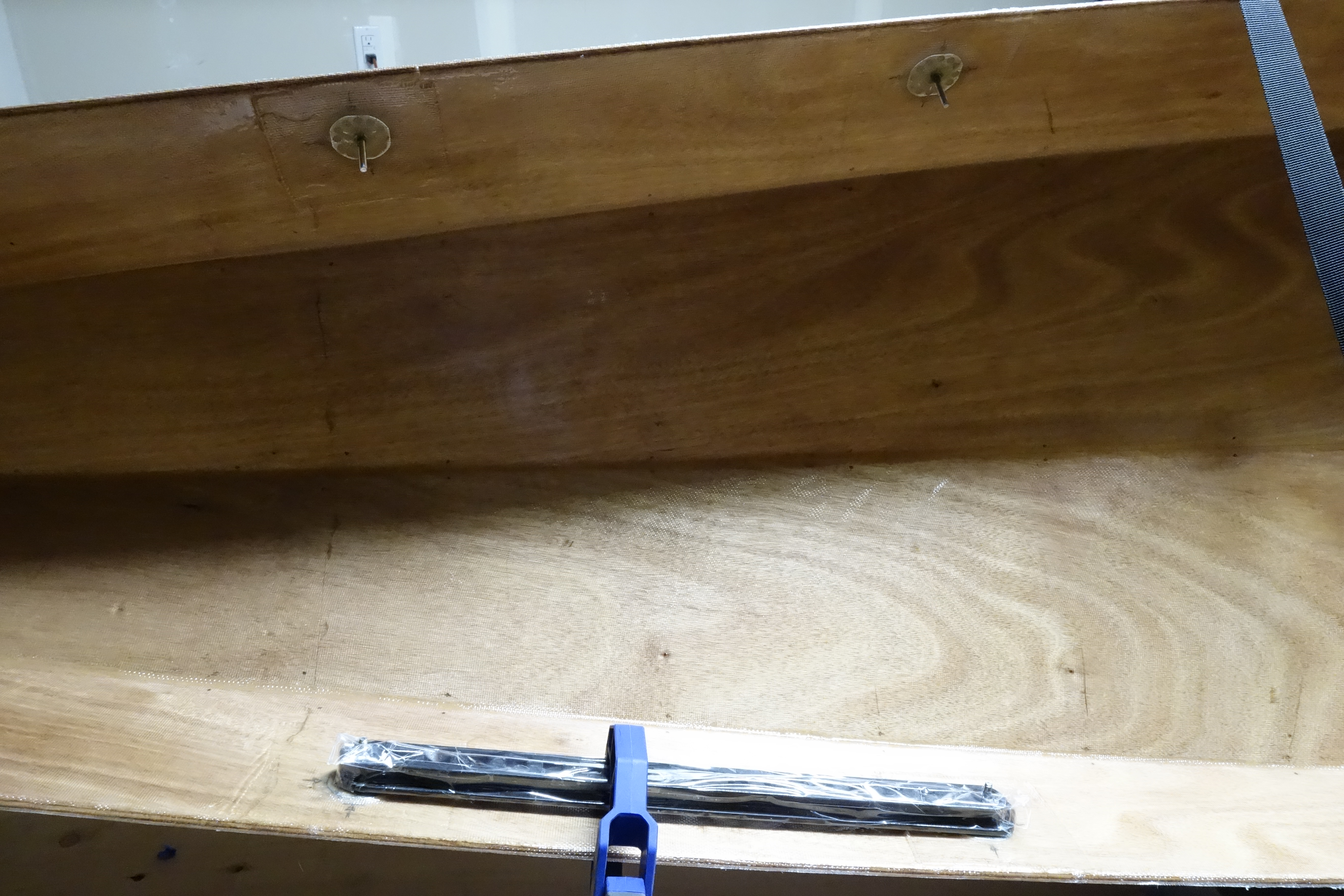 Rather than eventually drilling holes through the hull to mount the foot brace rails, Pygmy offers optional foot brace studs that are epoxied and fiberglassed to the inside of the hull during hull construction (as seen here). Not only is this aesthetically pleasing, it saves work in the future when the hull needs to be re-varnished because if the foot brace rails were held on by screws that went through the hull, the screws would have to be removed prior to sanding/re-varnishing, etc.