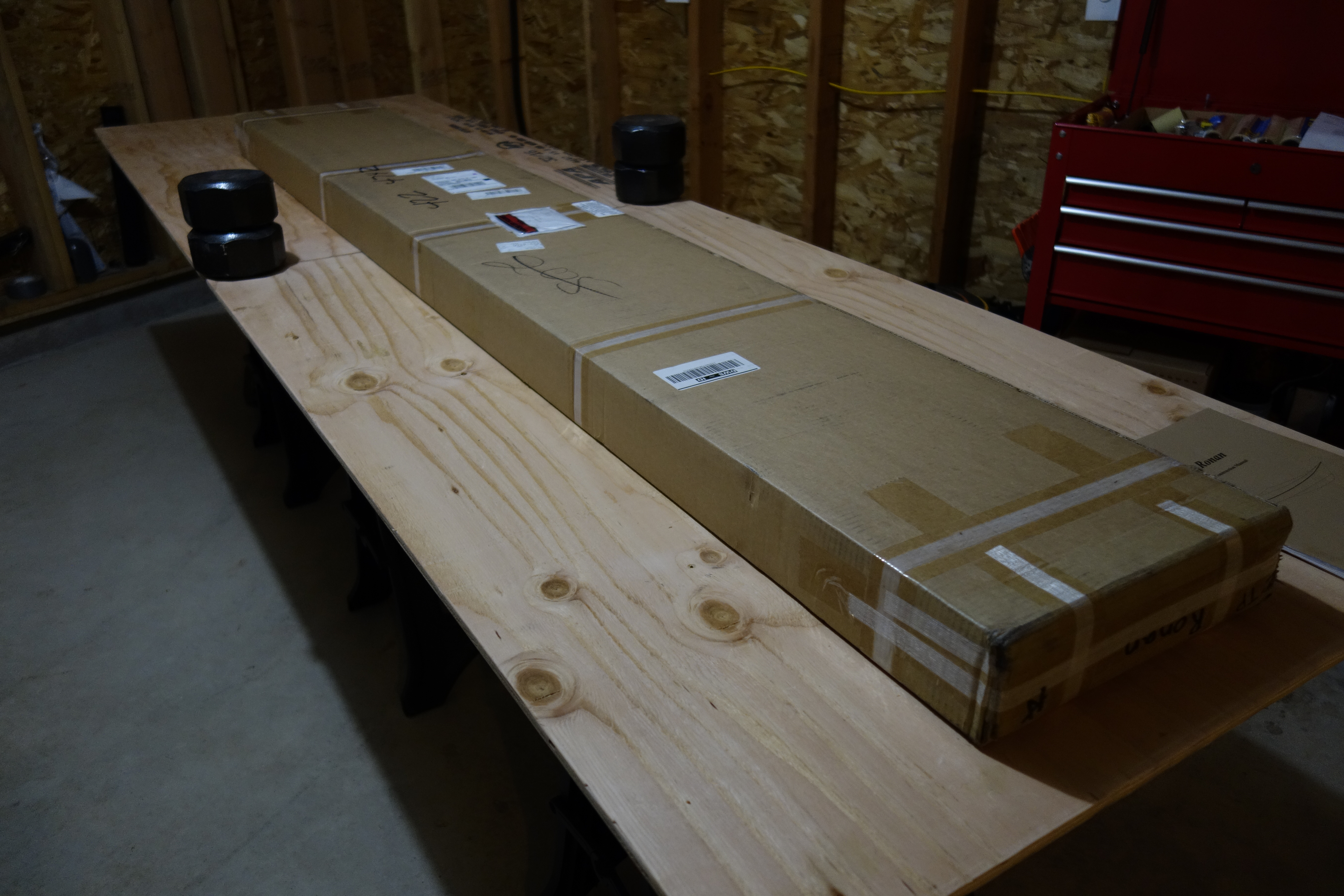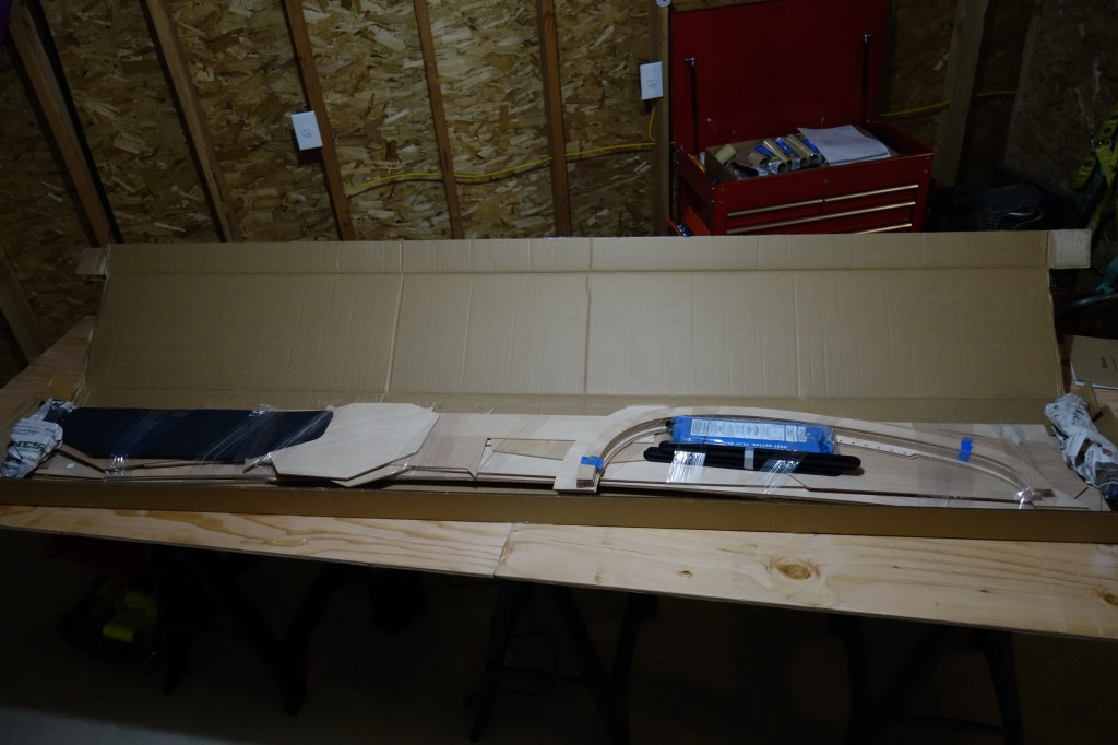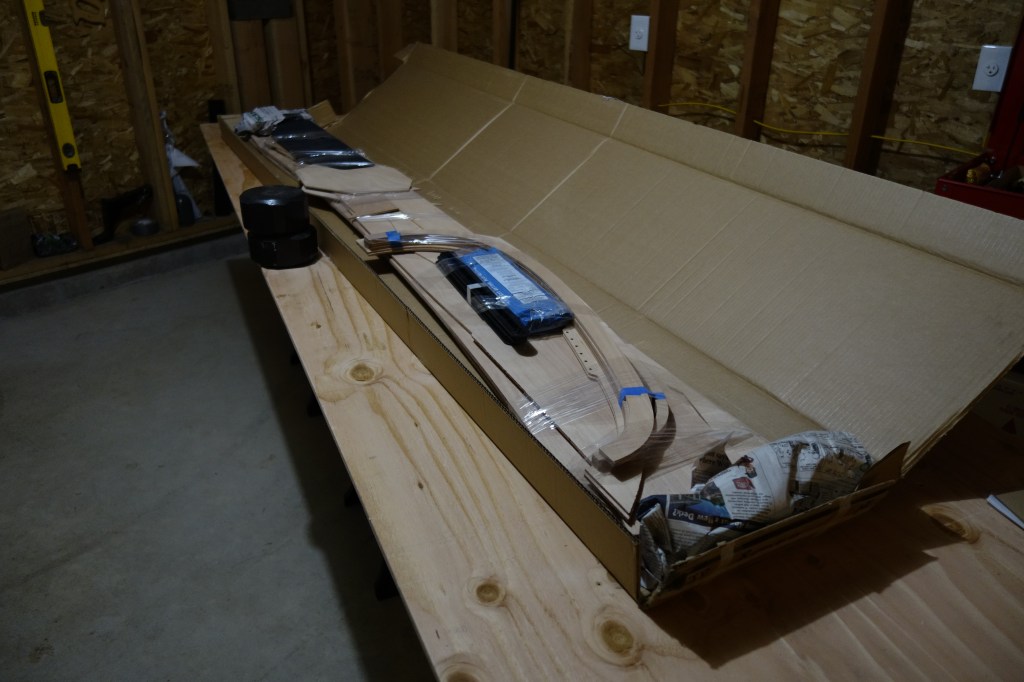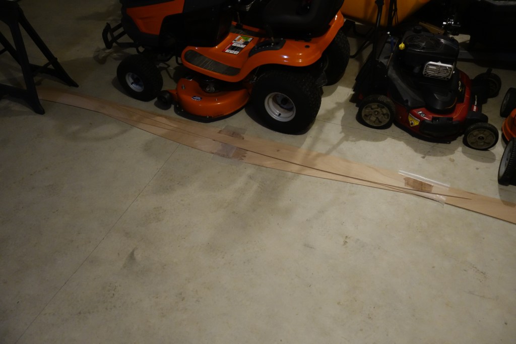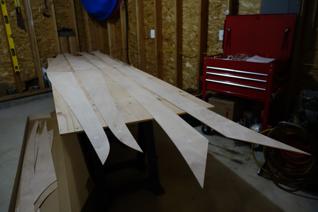 Hull panels out of the box and laid out, ready to be glued to their full lengths. You can see the deck panels still in the box on the floor. I will actually glue all of the panels for one side of the kayak at at time. I just had the hull panels for both sides on the table to look at the grain and kind-of get the “lay of the land.”