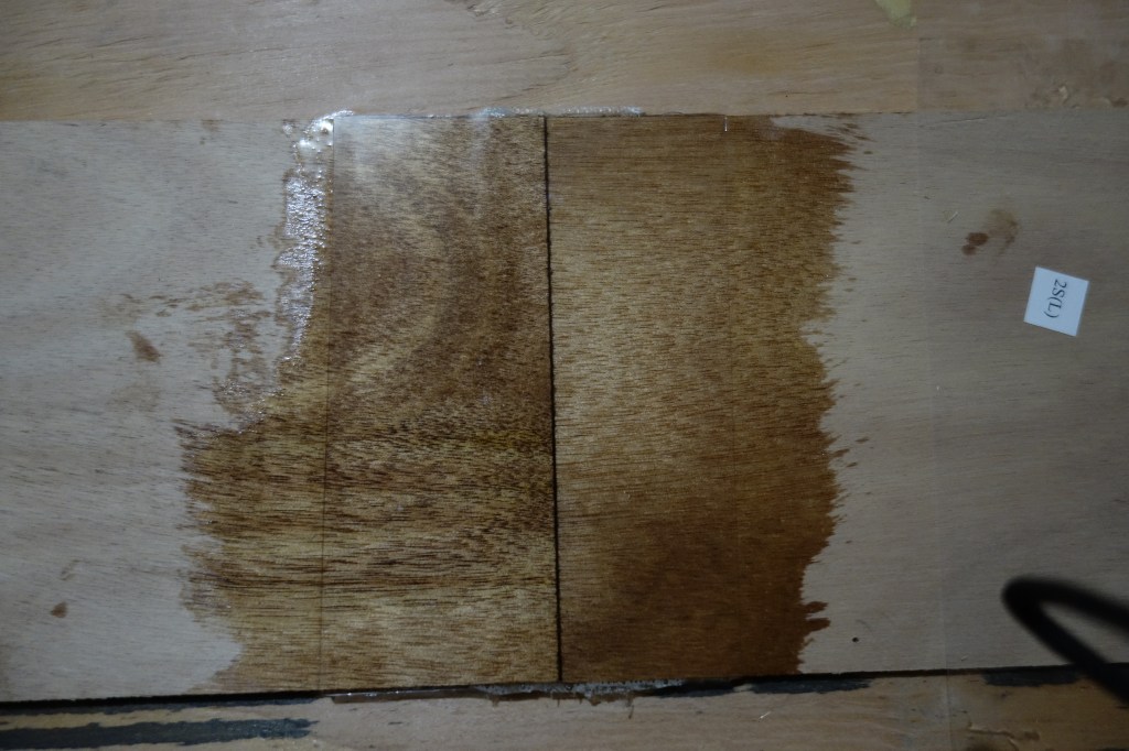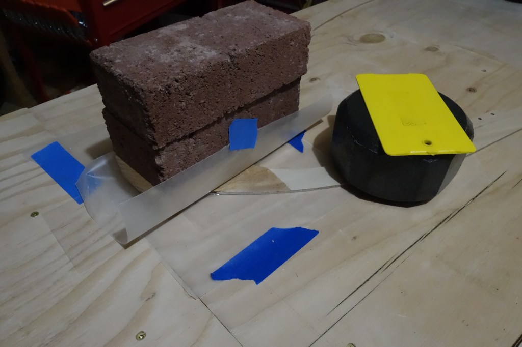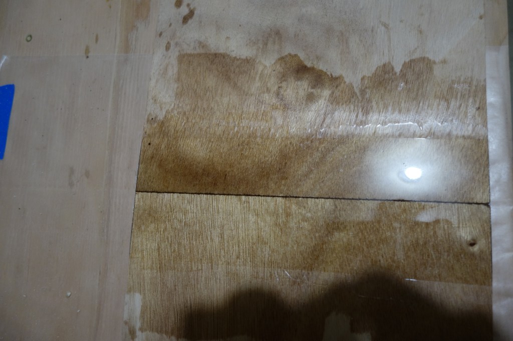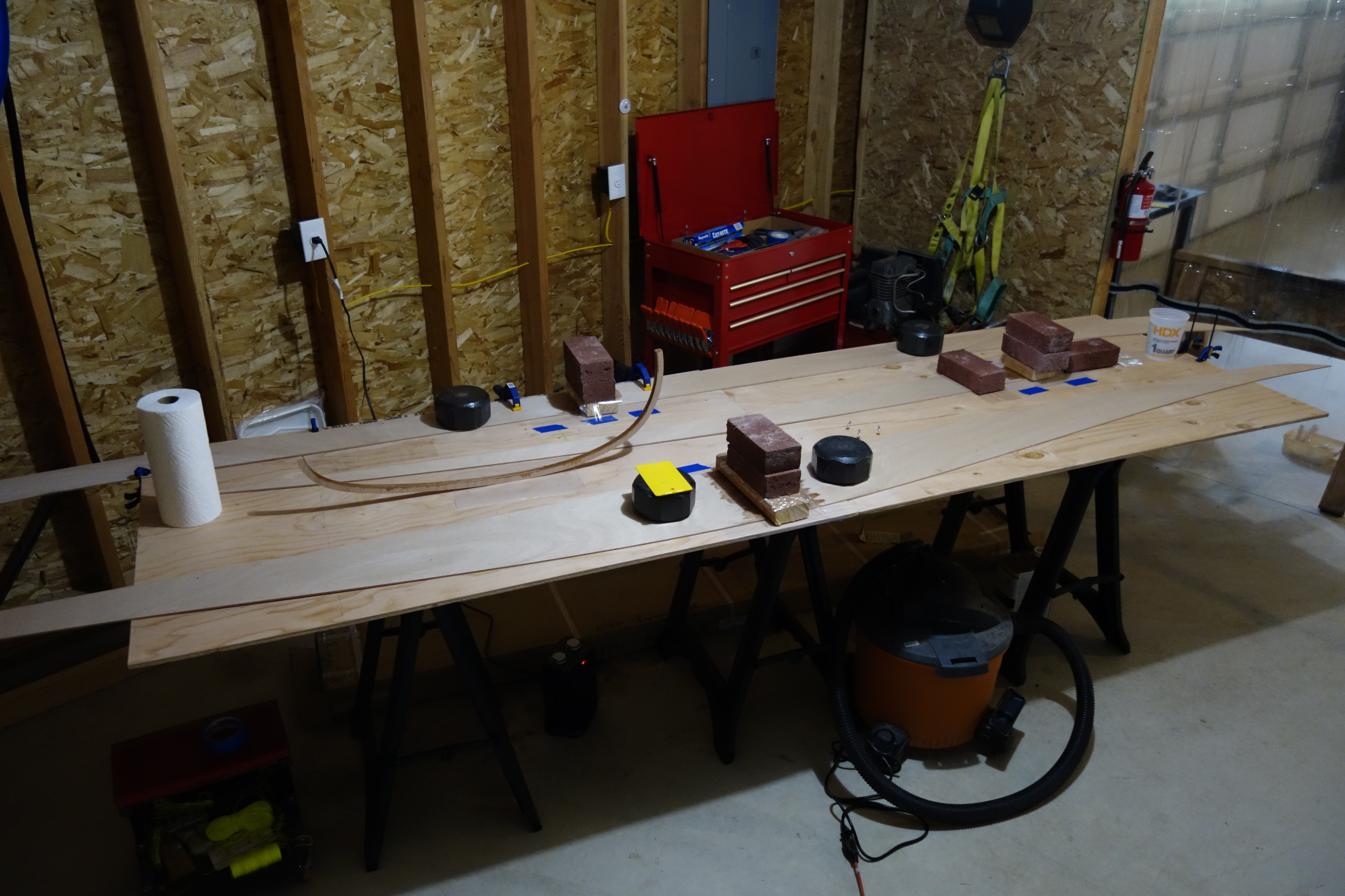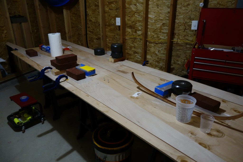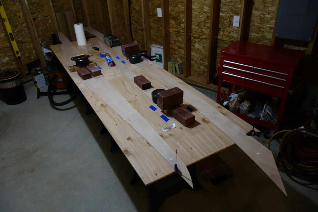 This photo show a bit more detail of the panel gluing process. Epoxy won’t stick to wax paper, so I use that between the epoxy and anything I don’t want it to stick to. As you can see, the weights are improvised. I sawed apart a couple of 20 lb. dumb-bells that I no longer use for weight lifting, so that I would have four 10 lb. weights. For additional weights, bricks were easily acquired and very inexpensive.